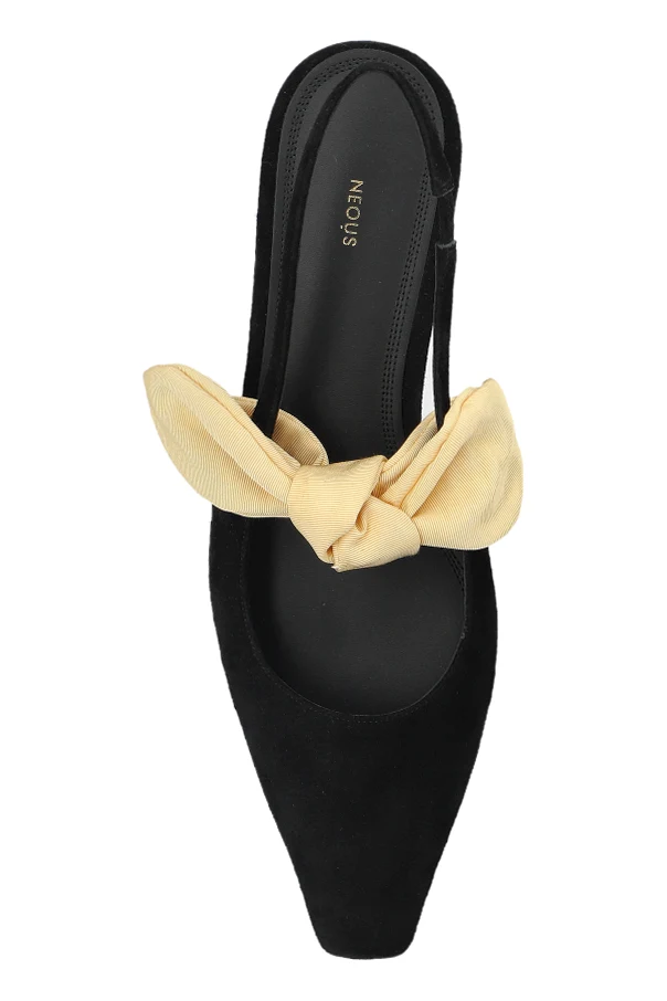 „Uba“-Schuhe mit abnehmbarer Schleife der Marke NEOUS begeistern durch ihre raffinierte Form und kunstvolle Verarbeitung. Die dezent gestalteten Ballerinas mit verlängertem, spitz zulaufendem Zehenbereich und zartem Kitten-Heel-Absatz verleihen der Silhouette Leichtigkeit und Anmut. Die offene Ferse mit einem einzelnen Riemen setzt ein besonders stilvolles, zeitgemäßes Highlight.