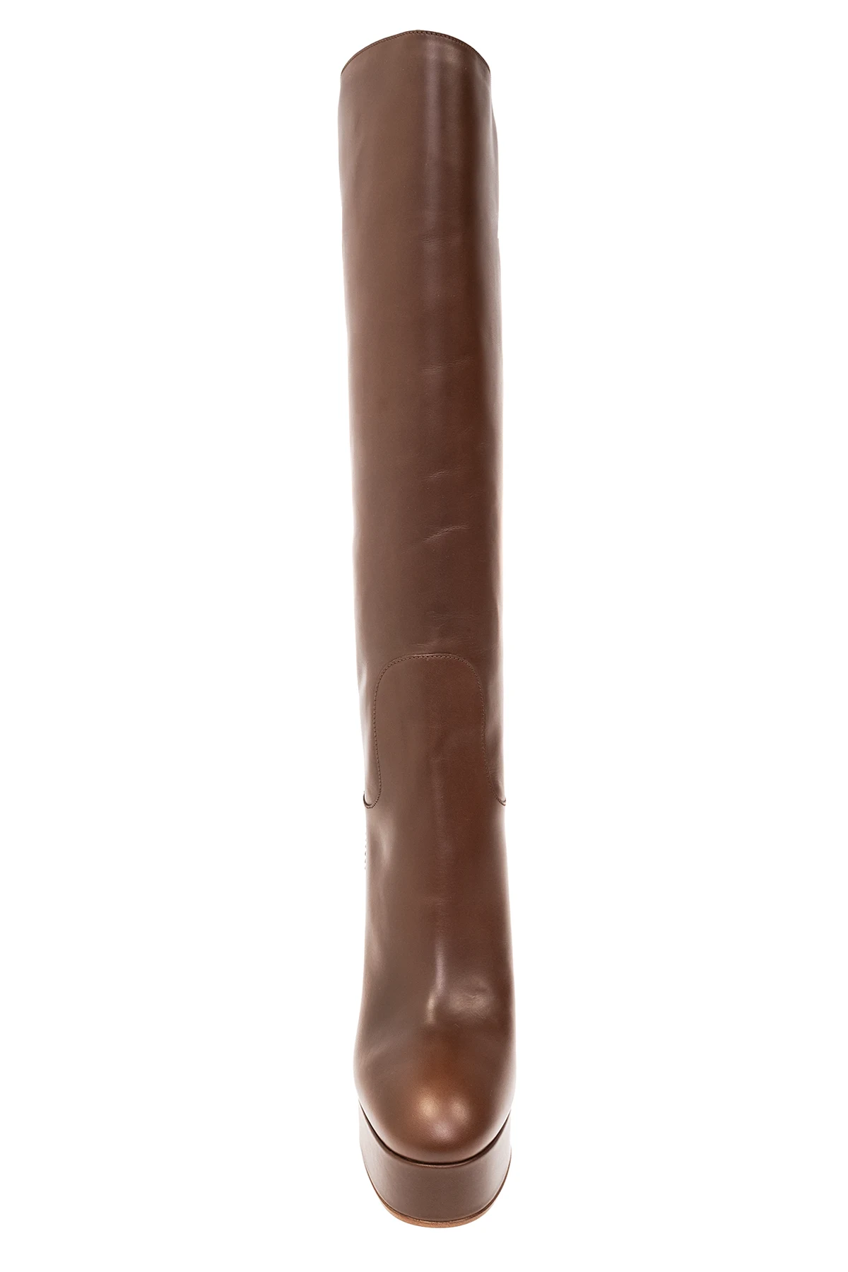 Brown ‘Betty’ boots from Casadei. Crafted from leather, this slip-on pair features a rounded toe and a beige leather sole.