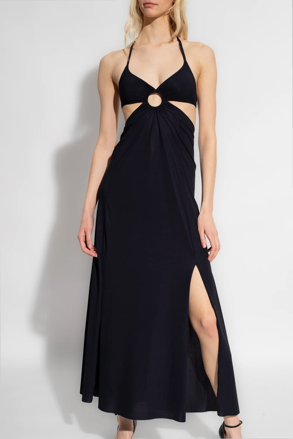 Long, black ‘Rod’ dress from Pain de Sucre. Fastened at the nape of the neck and back, this design features an open back and shoulders, cut-outs, ring detail and double slit.