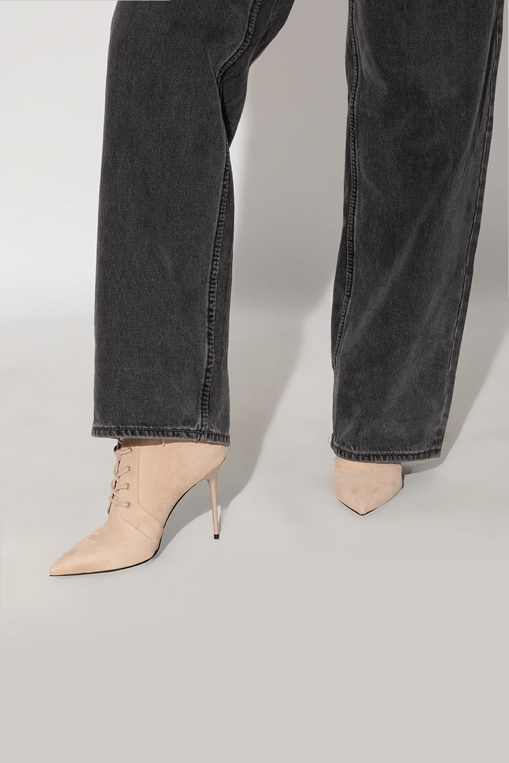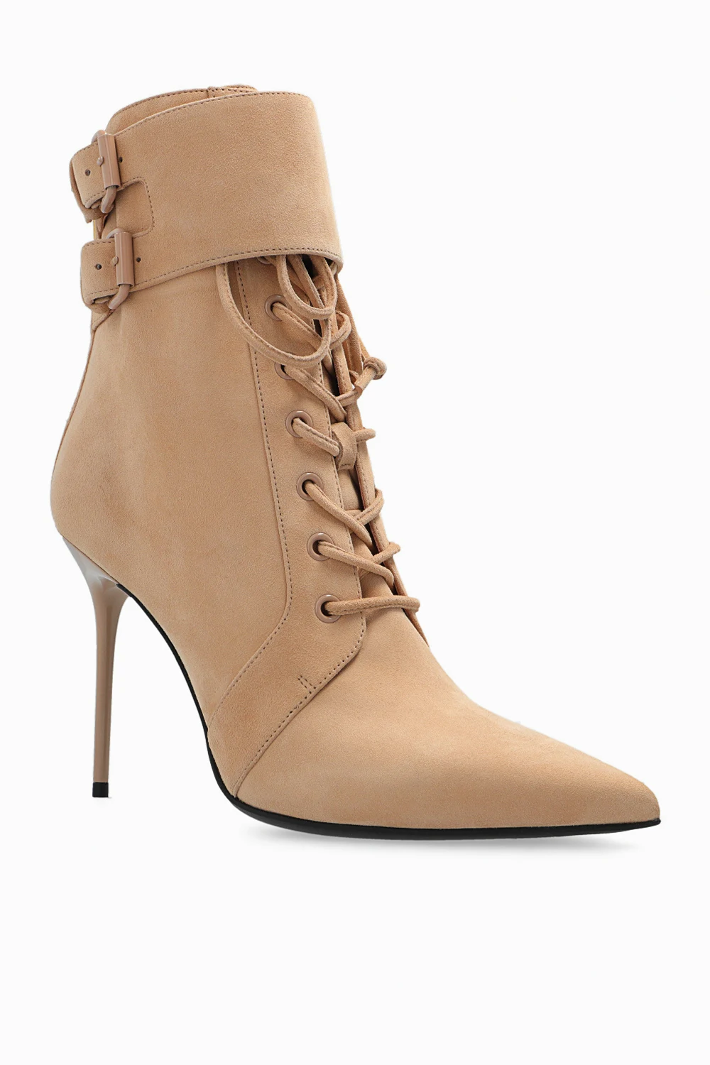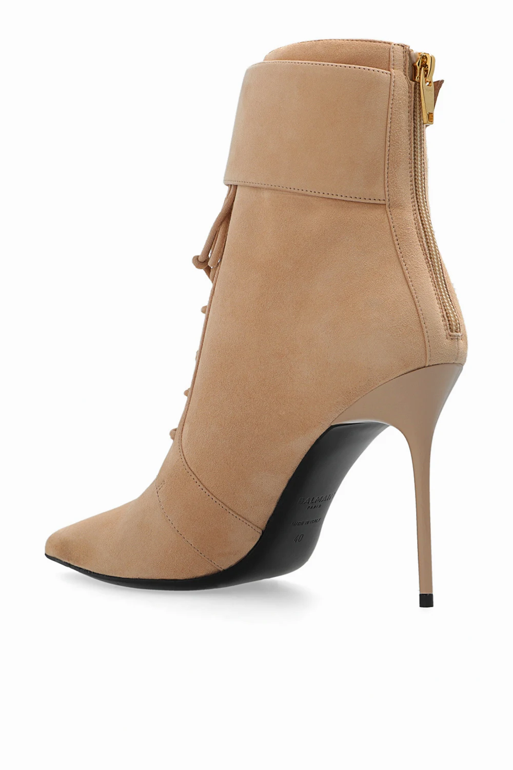 Beige ‘Uria’ heeled ankle boots from Balmain. Made of calf suede, this lace-up pair features buckle straps on the sides, gold-tone back zip with a logo, pointed toe and black leather sole.