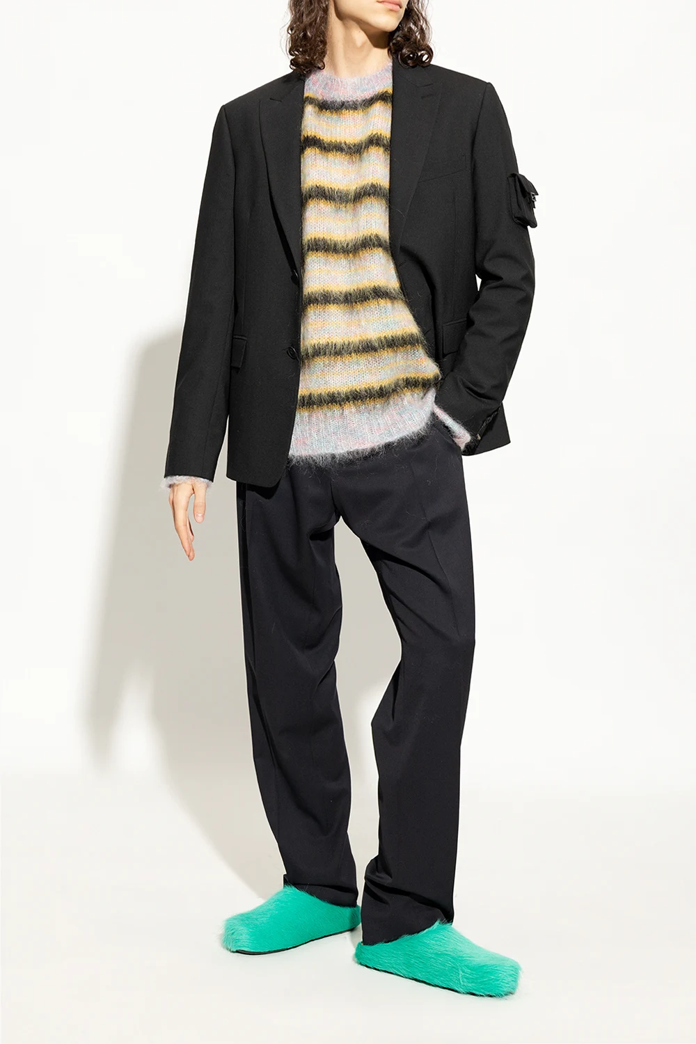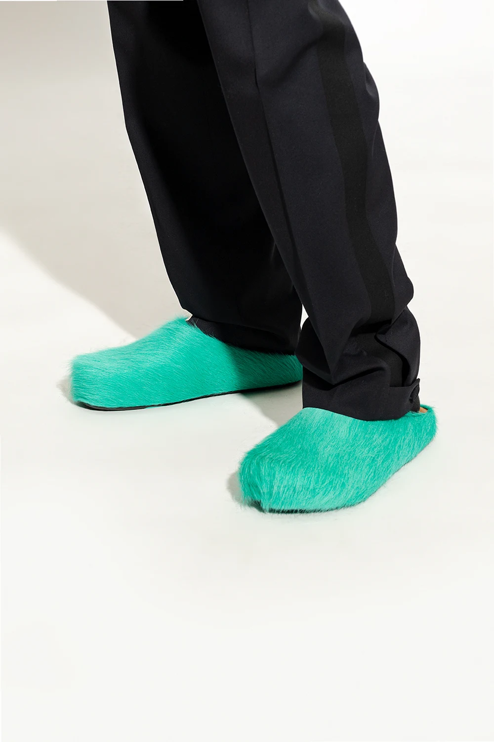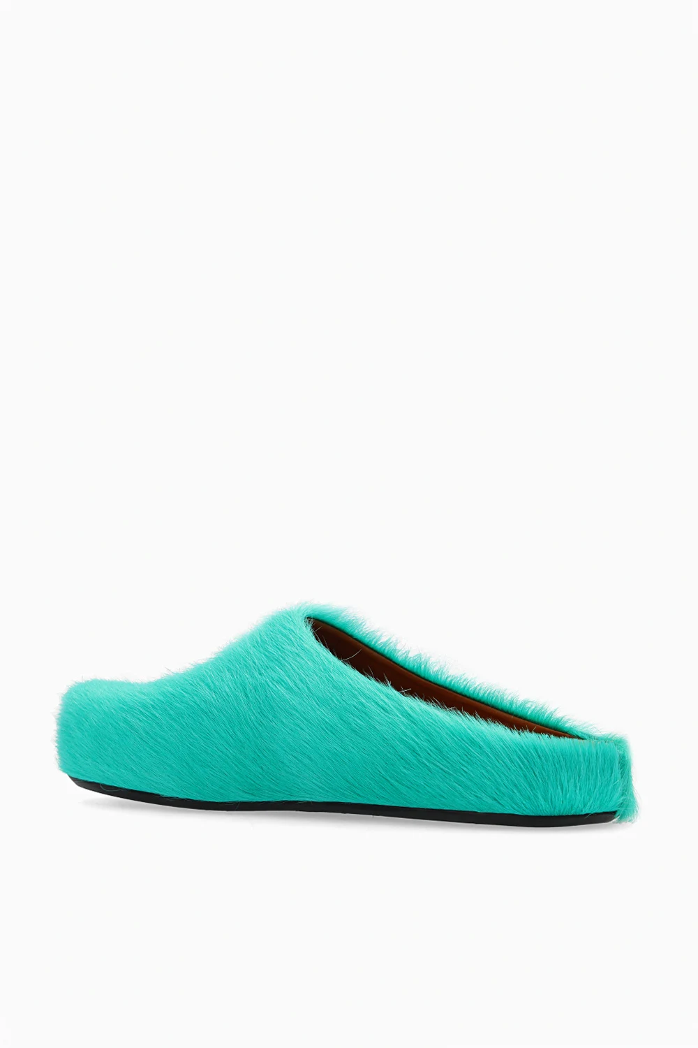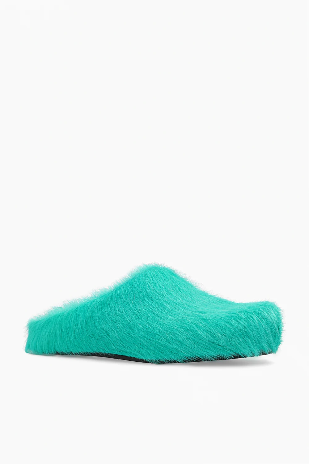 Greenish blue ‘Fussbett Sabot’ slides from Marni. Crafted from calf leather, this model sits on a ribbed black rubber sole.