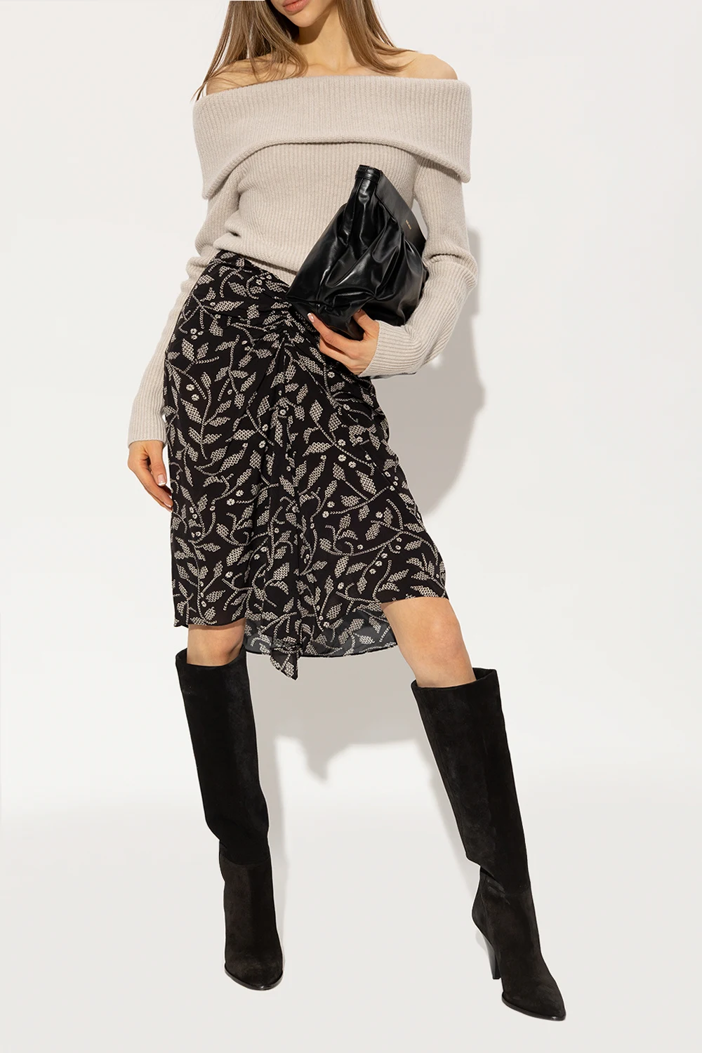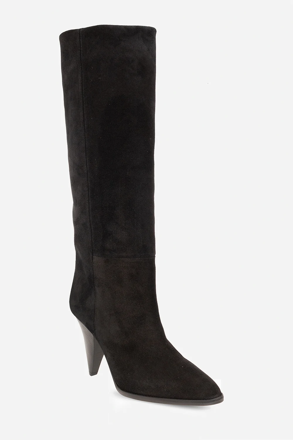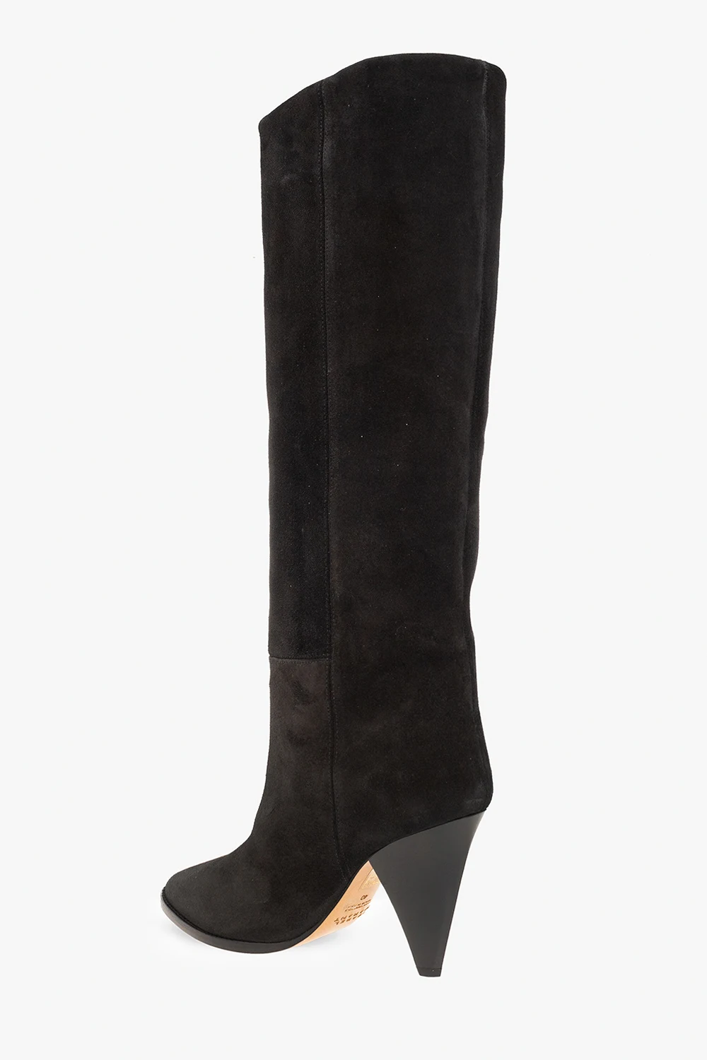 Black ‘Ririo’ heeled slip-on boots from Isabel Marant. Made of suede, this pair features a pointed toe, cone-shaped heel and beige leather sole.