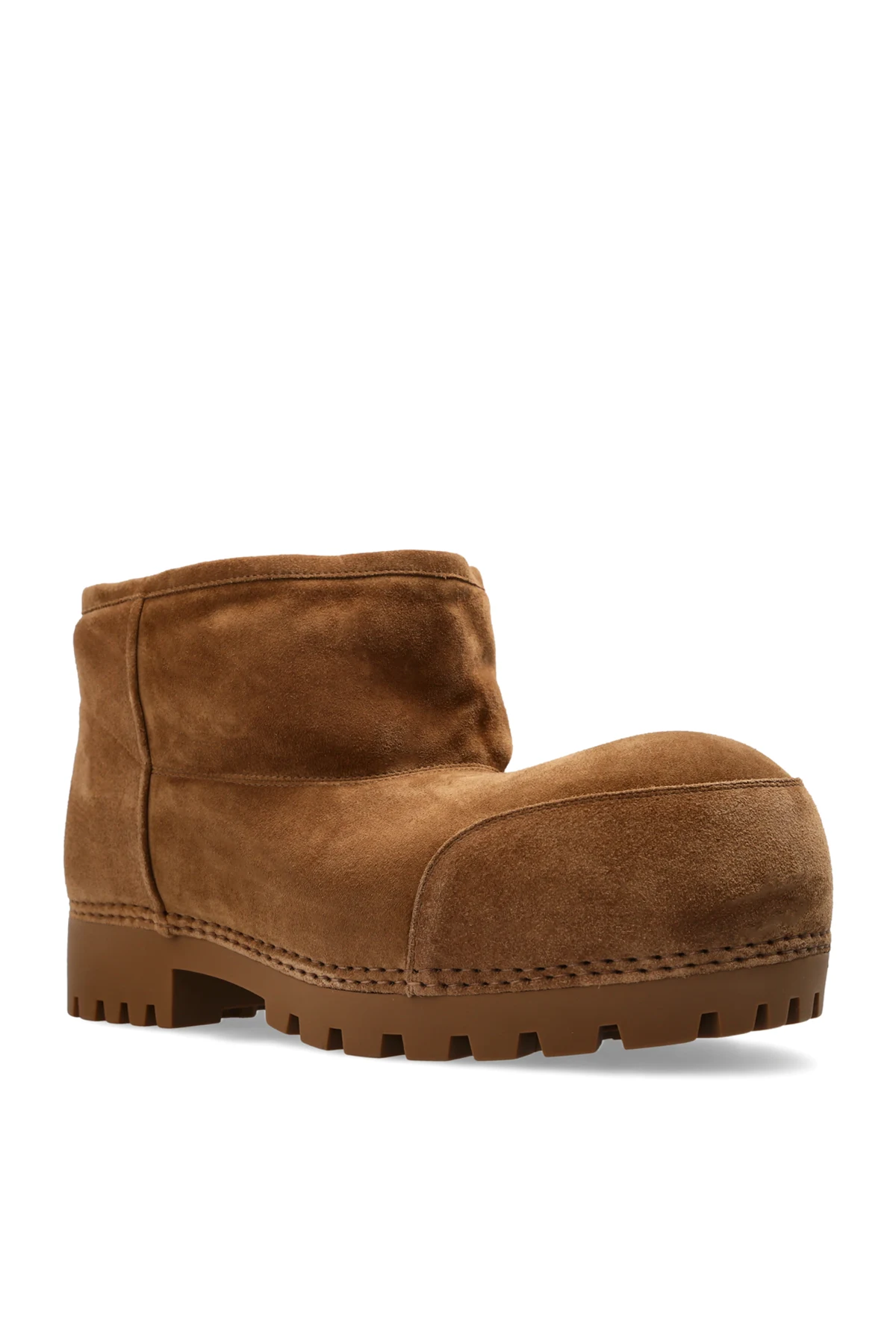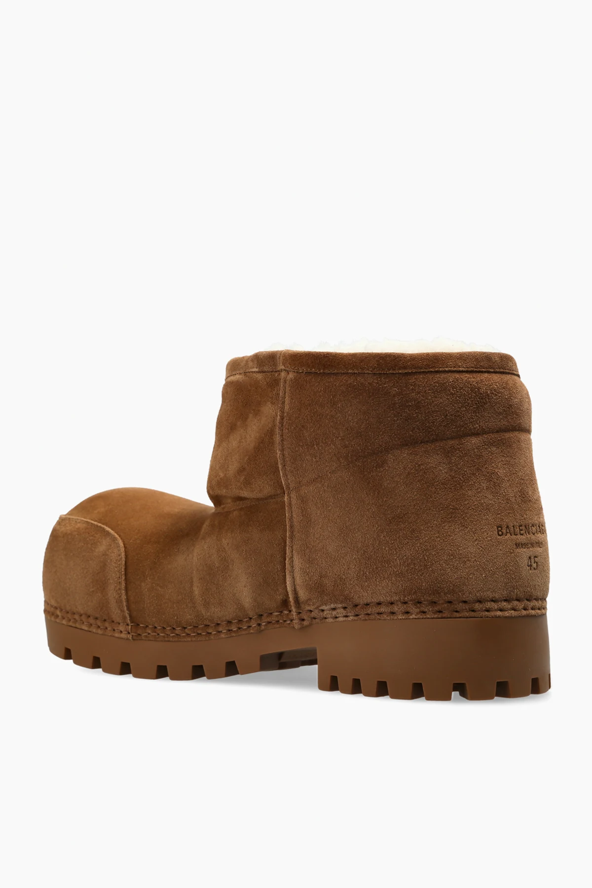 Gefertigt aus hochwertigem Veloursleder , zeichnen sie sich durch eine massive, abgerundete Front und ein niedriges Schaftprofil aus. Ihr Inneres ist mit einem weißen, flauschigen Material gefüttert, das unvergleichliche Wärme und Komfort an den kältesten Tagen bietet.