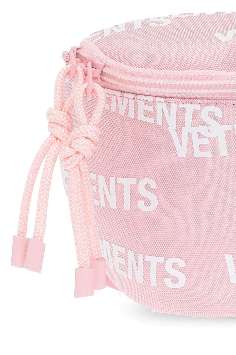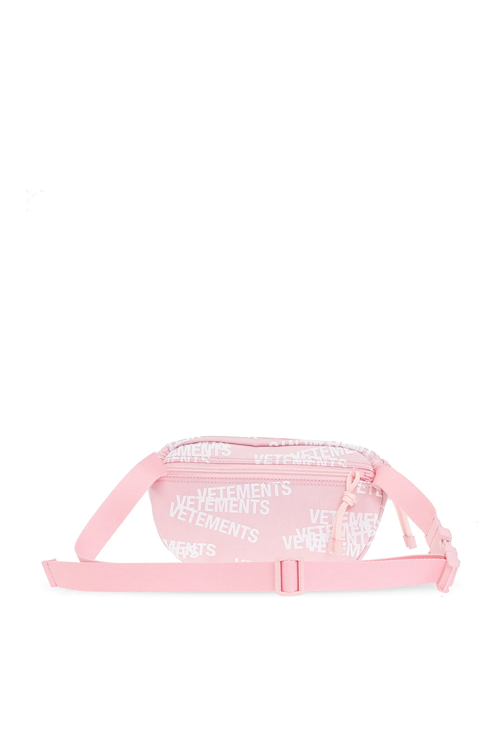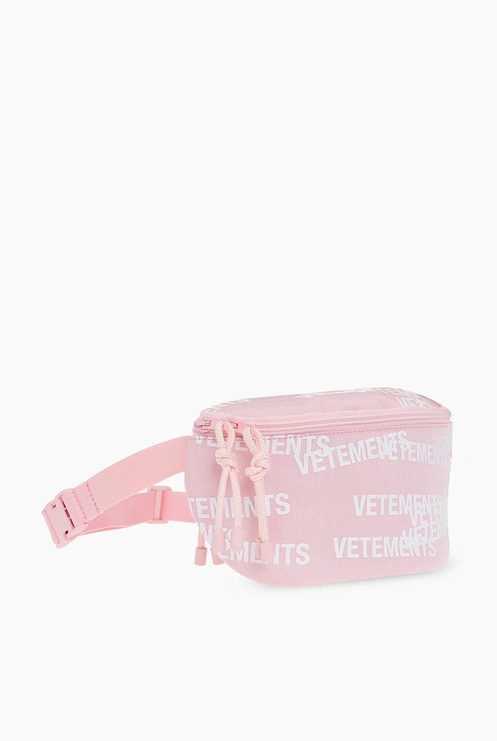 Pink belt bag from VETEMENTS. Printed with the brand's logo in white, this design features a two-way zip fastening, a back zip pocket, an adjustable strap, pink metal hardware and one internal compartment.