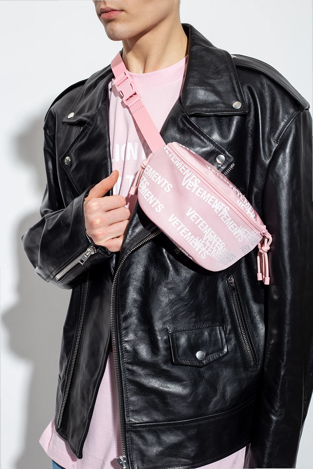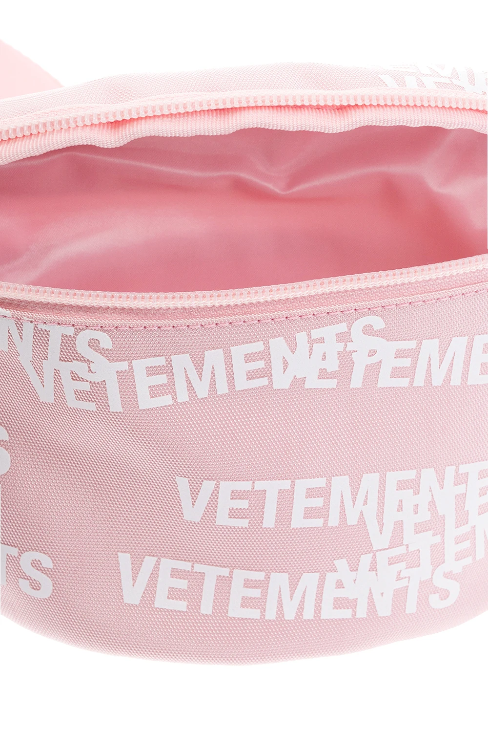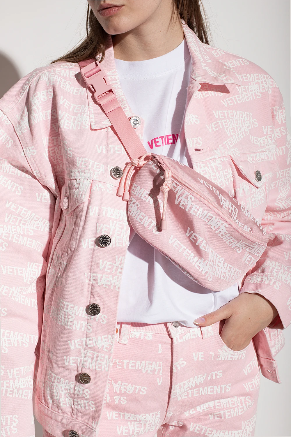 Pink belt bag from VETEMENTS. Printed with the brand's logo in white, this design features a two-way zip fastening, a back zip pocket, an adjustable strap, pink metal hardware and one internal compartment.