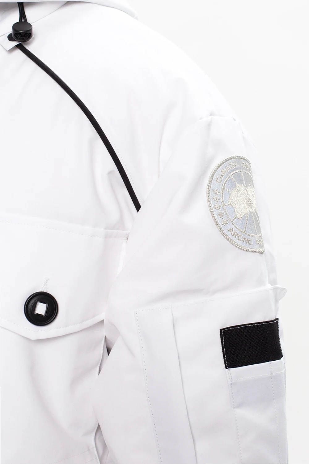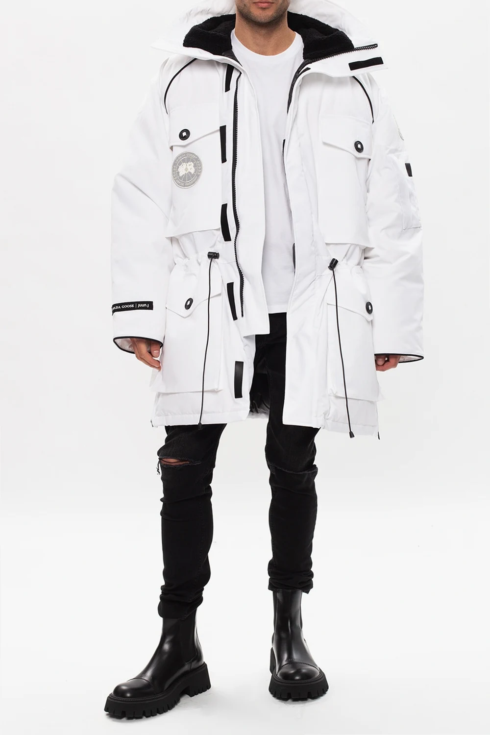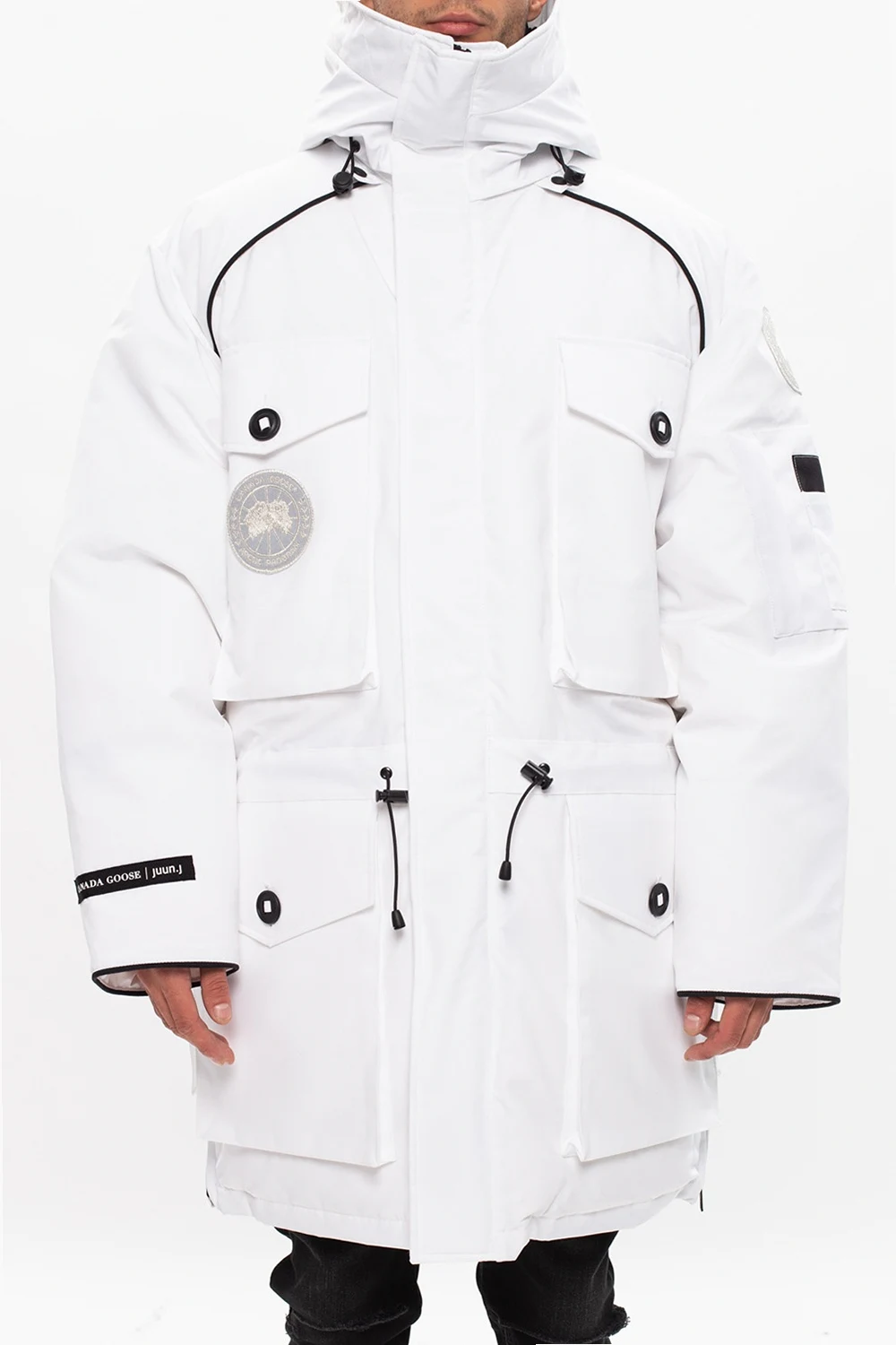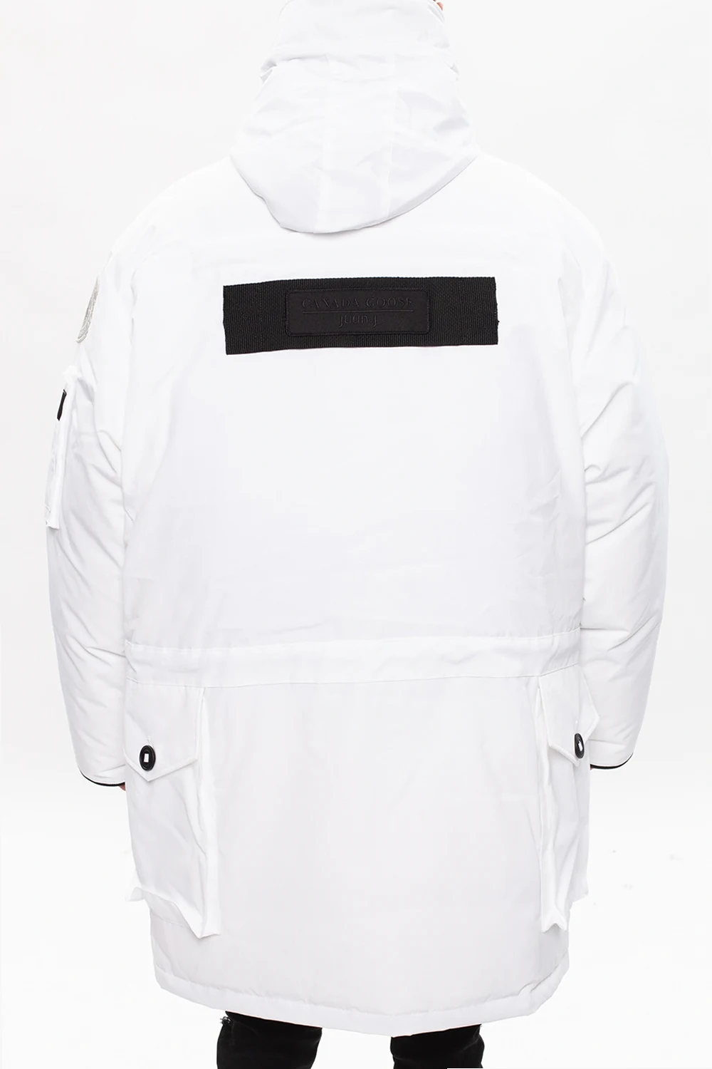 White 'Expedition' parka with a drawcord-adjustable hood from Canada Goose x Juun.J. Filled with duck down, this winter-savvy piece fastens via zip and velcro closures and employs a silver-tone logo patch and six flapped pockets with button fastenings: four on the front and two at the back. This item comes from the capsule collection which melds function-first design with the latest trends.