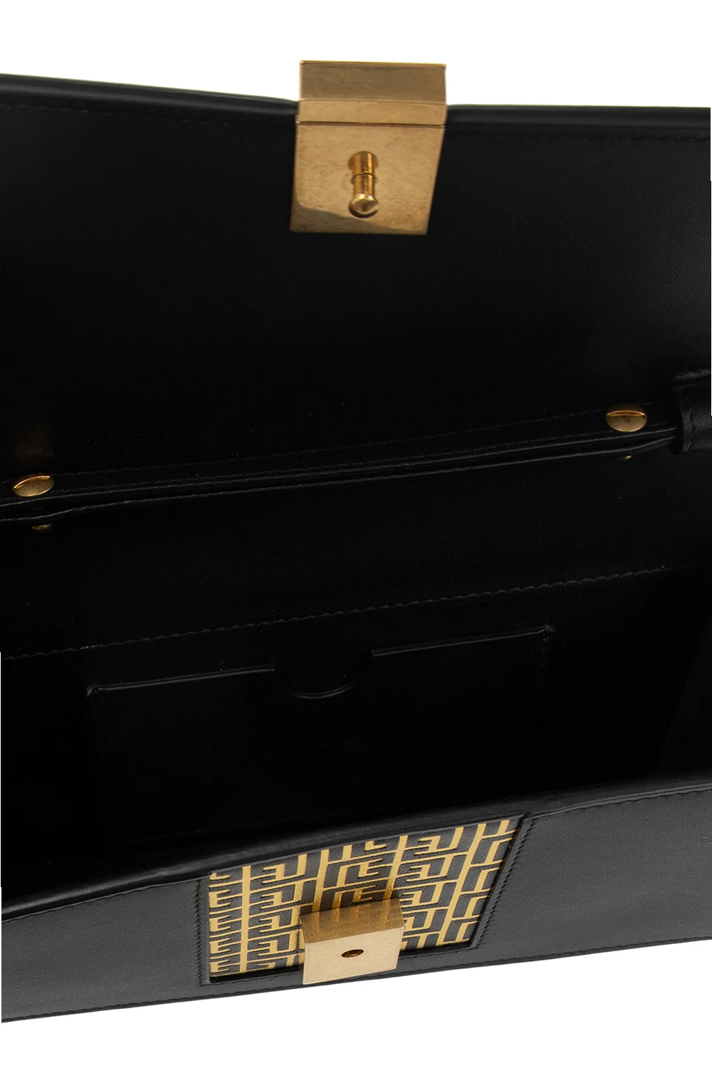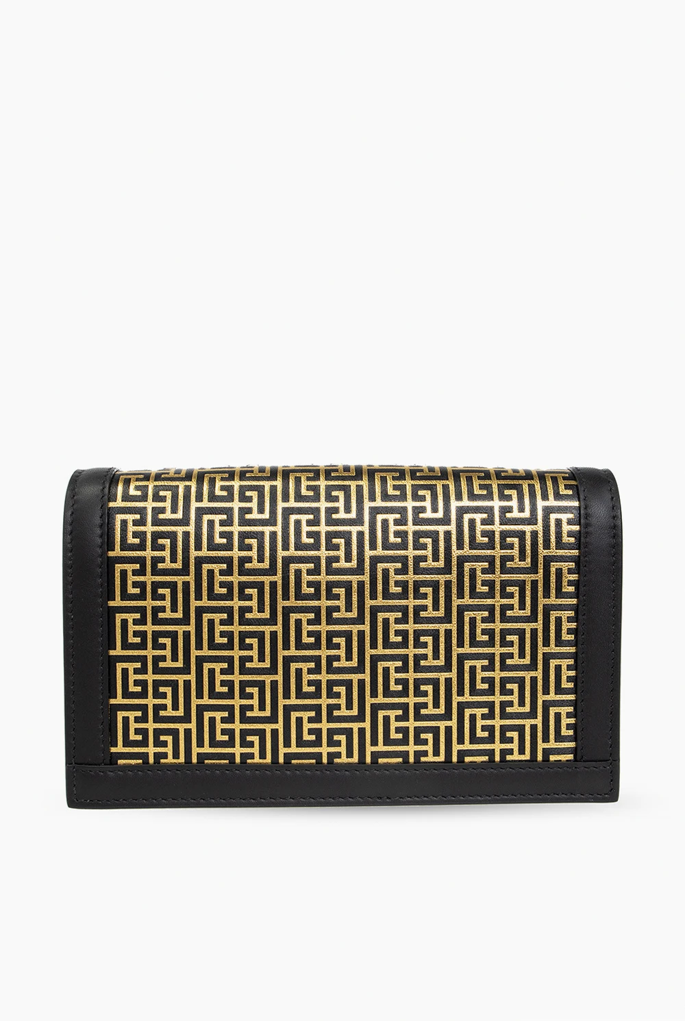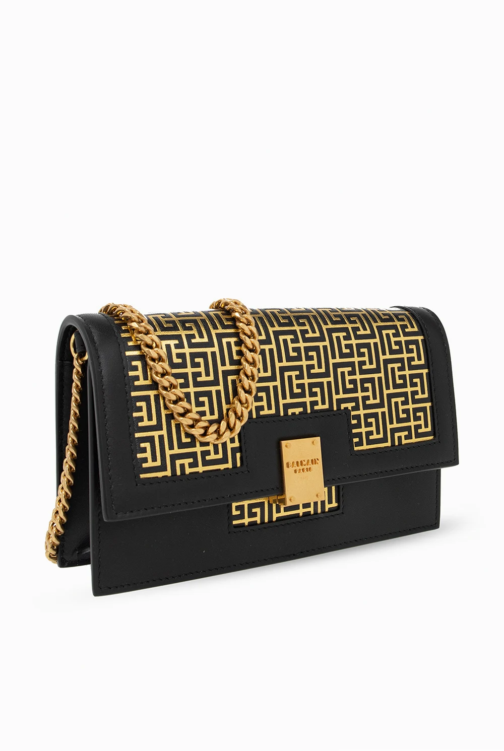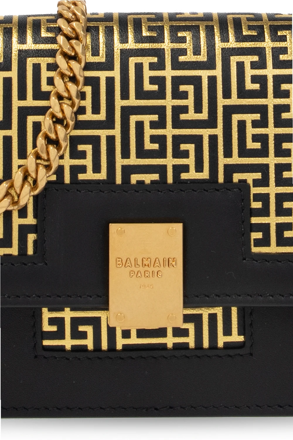 Black ‘1945’ shoulder bag from Balmain. Crafted from lamb leather, this design secures with a snap and showcases a gold-tone monogram print, a chain shoulder strap, gold-tone metal hardware and one internal compartment with a slip pocket.