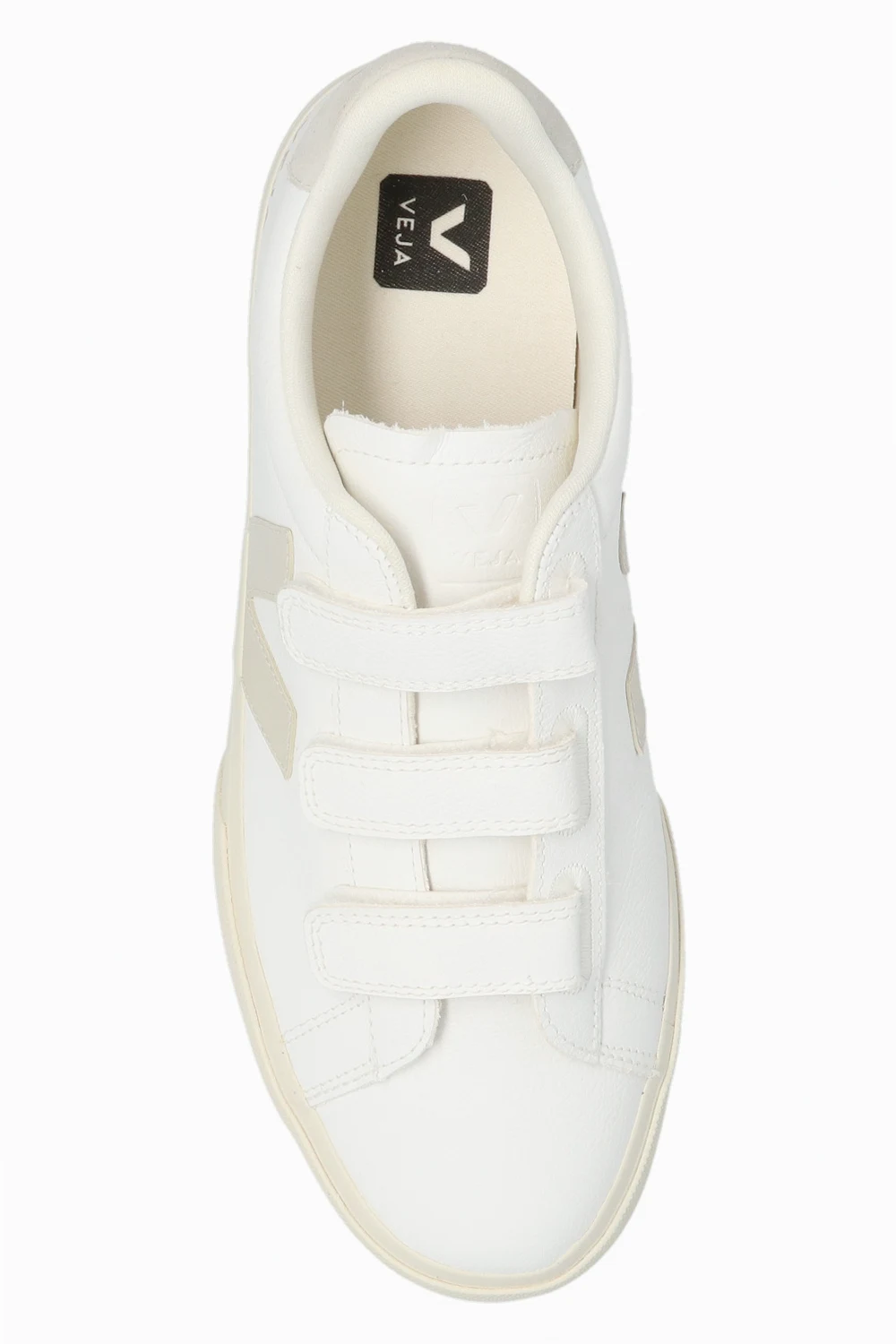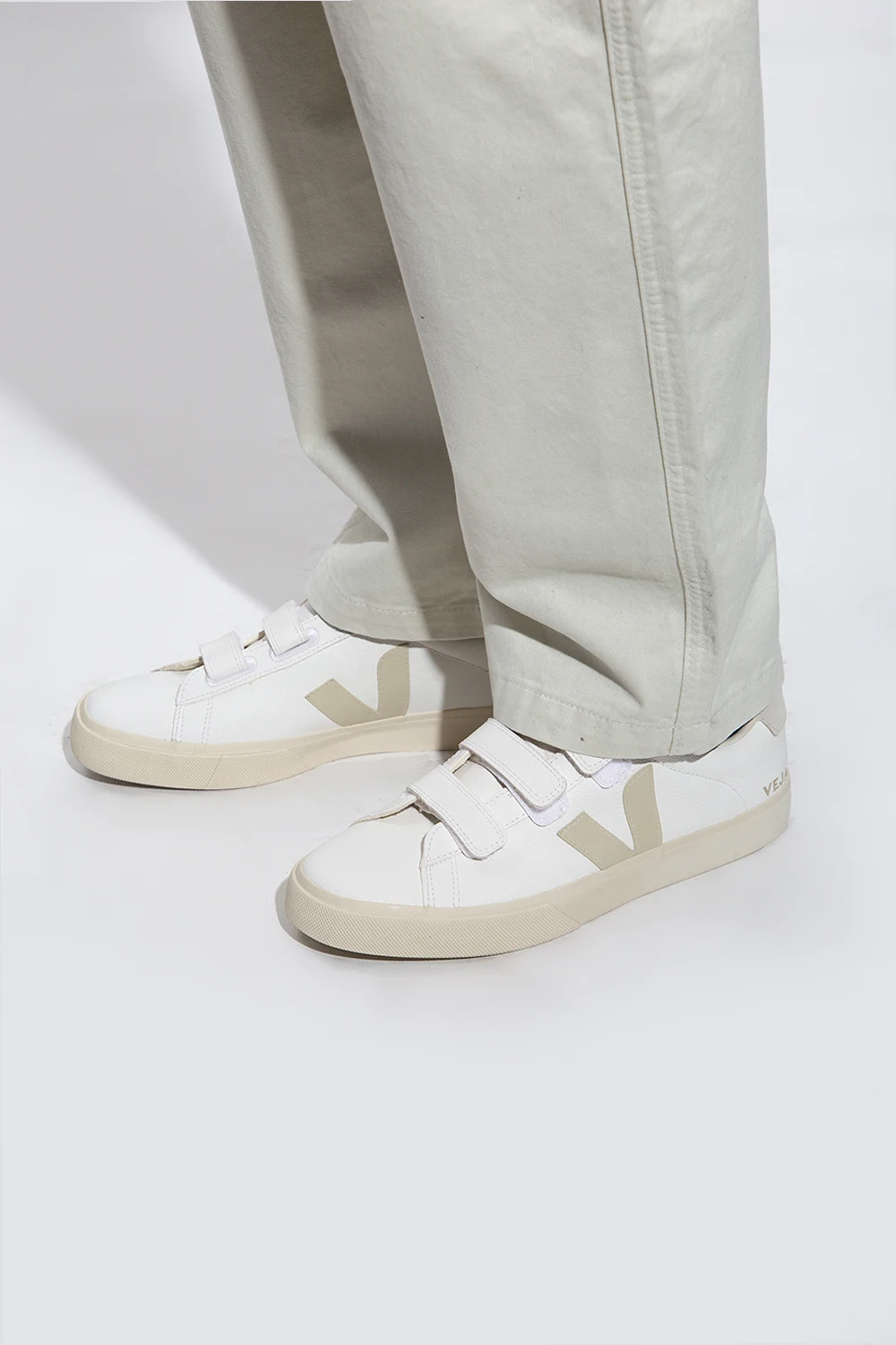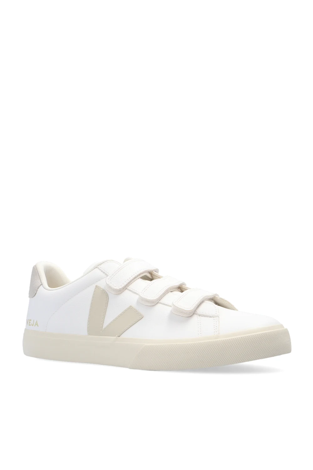 White ‘Recife Logo’ sneakers from Veja. Crafted from chrome-free leather, this model features an embossed logo on the tongue, a triple velcro closure and the brand's signature beige logo patch in rubber and rice waste, and organic cotton shoelaces. The mesh inner lining made from recycled materials was developed to acquire a better resistance to friction. The organic-sourced and recycled insole consists of sugar cane, Amazon rubber, organic cotton and recycled EVA. It is set on a cream rubber sole made from organic and recycled materials. This leather undergoes an innovative tanning process where no chrome, heavy metals or dangerous acids are involved. By simplifying the tanning process, the use of chemicals and energy is limited, the use of water is reduced by about 40% and the use of salt by 80%. After tanning, the water is recyclable.