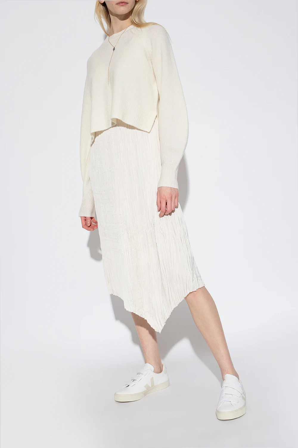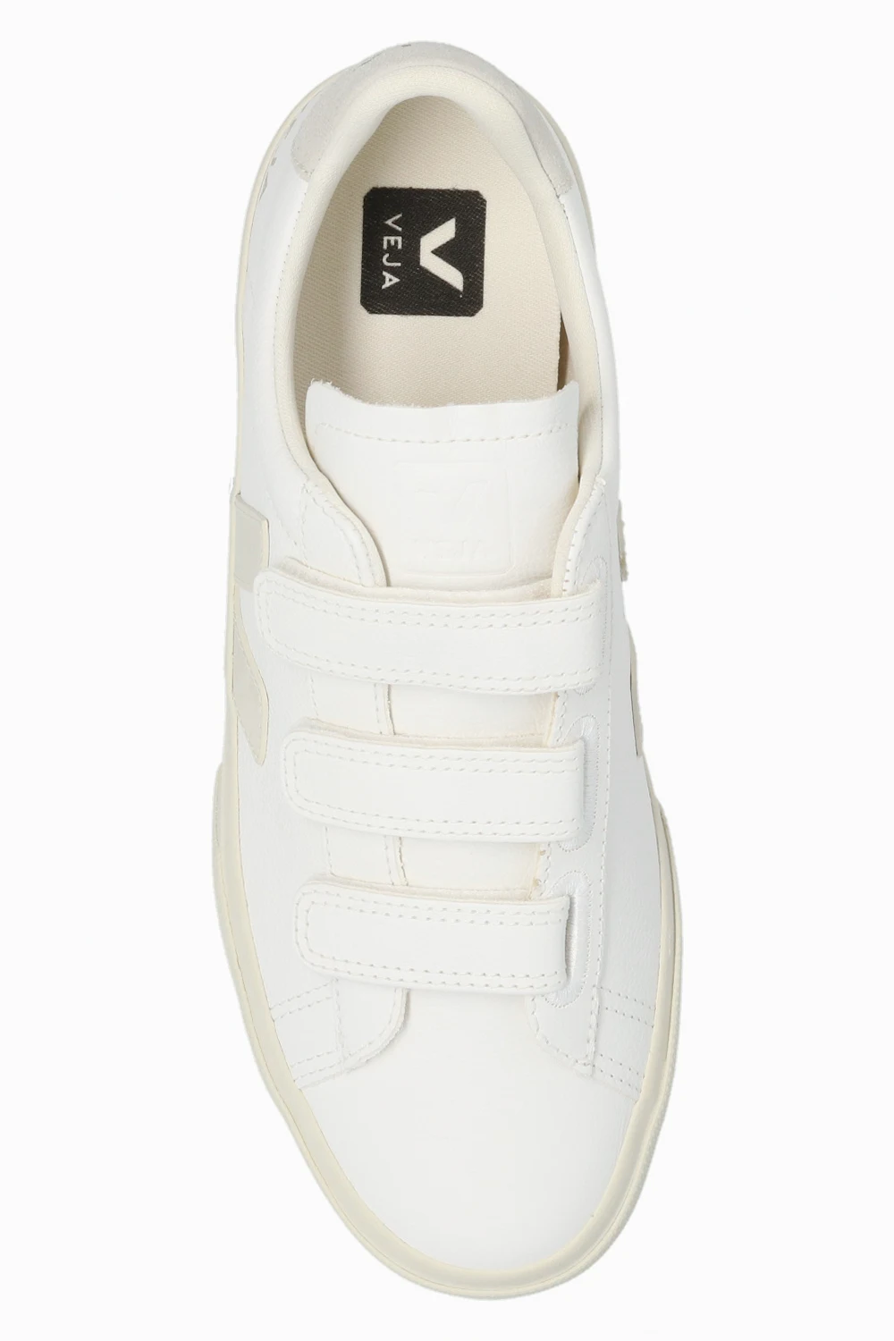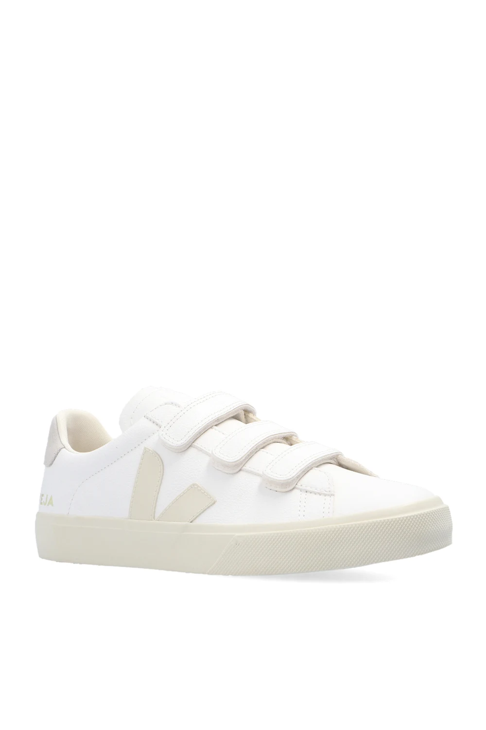 White ‘Recife Logo’ sneakers from Veja. Crafted from chrome-free leather, this model features an embossed logo on the tongue, a triple velcro closure and the brand's signature cream logo patch in rubber and vegan suede, and organic cotton shoelaces. The mesh inner lining made from recycled materials was developed to acquire a better resistance to friction. The organic-sourced and recycled insole consists of sugar cane, Amazon rubber, organic cotton and recycled EVA. It is set on a cream rubber sole made from organic and recycled materials. This leather undergoes an innovative tanning process where no chrome, heavy metals or dangerous acids are involved. By simplifying the tanning process, the use of chemicals and energy is limited, the use of water is reduced by about 40% and the use of salt by 80%. After tanning, the water is recyclable.