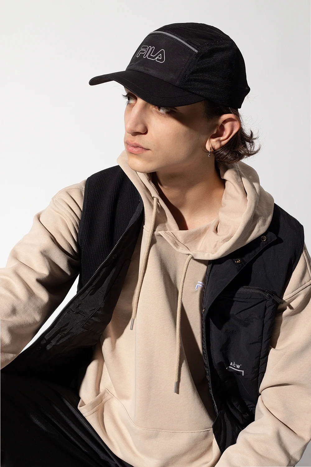 Black baseball cap from Fila. Printed with the brand's logo, this piece of headwear is complete with mesh sides, a silver-tone reflective stripe on the front and a drawstring fastening on the back.
