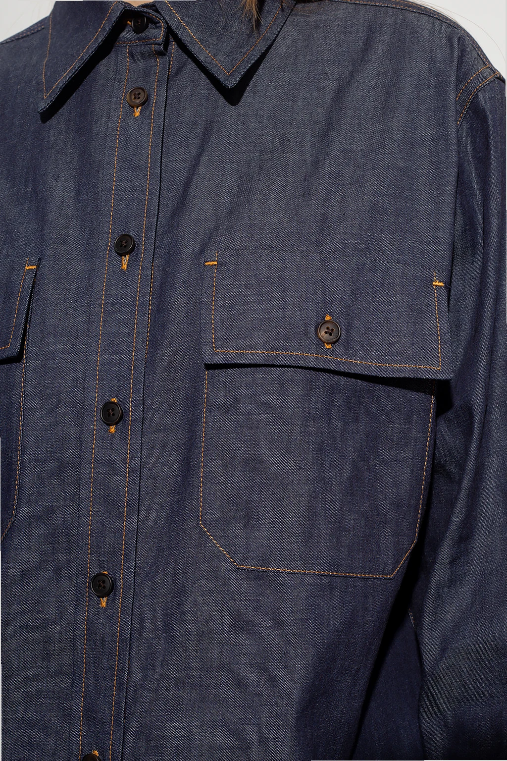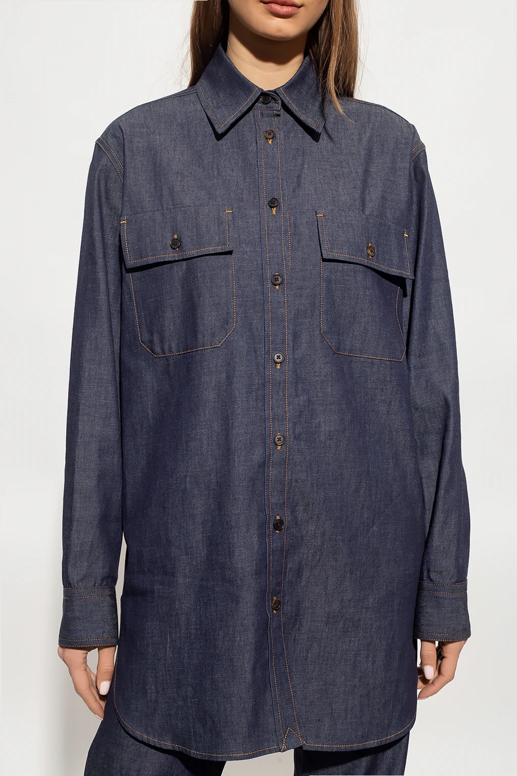 Navy ‘Vivienne’ denim shirt from The Row. Crafted from cotton, this garment features button fastenings, a flap pocket and long sleeves.
