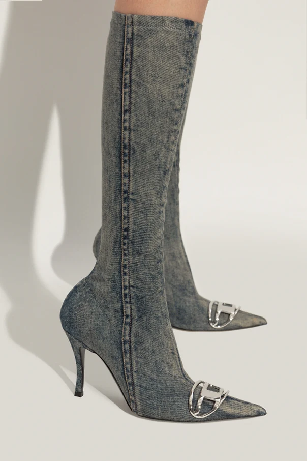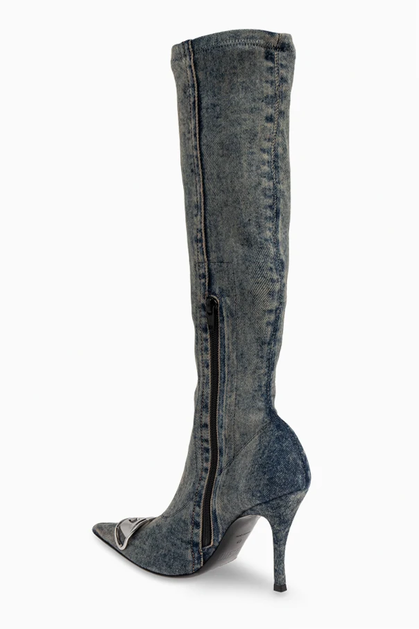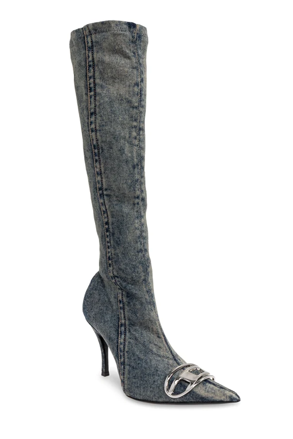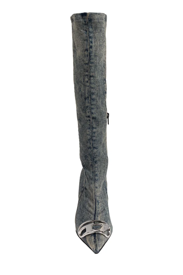 Jeans-Knie-Stiefel ‘D-VENUS’ von Diesel sind die Quintessenz avantgardistischer Eleganz und raffinierten Stils. Die kniehohen Stiefel mit schmalem, figurbetonten Schaft und markant spitzer Zehenpartie ziehen mit ihrer mutigen Form und edlem Minimalismus alle Blicke auf sich. Der Denim in verwaschenem, hellem Blau, veredelt mit dezenten Ziernähten, kreiert einen einzigartigen Effekt, der das traditionelle Bild luxuriöser Schuhe übertrifft.