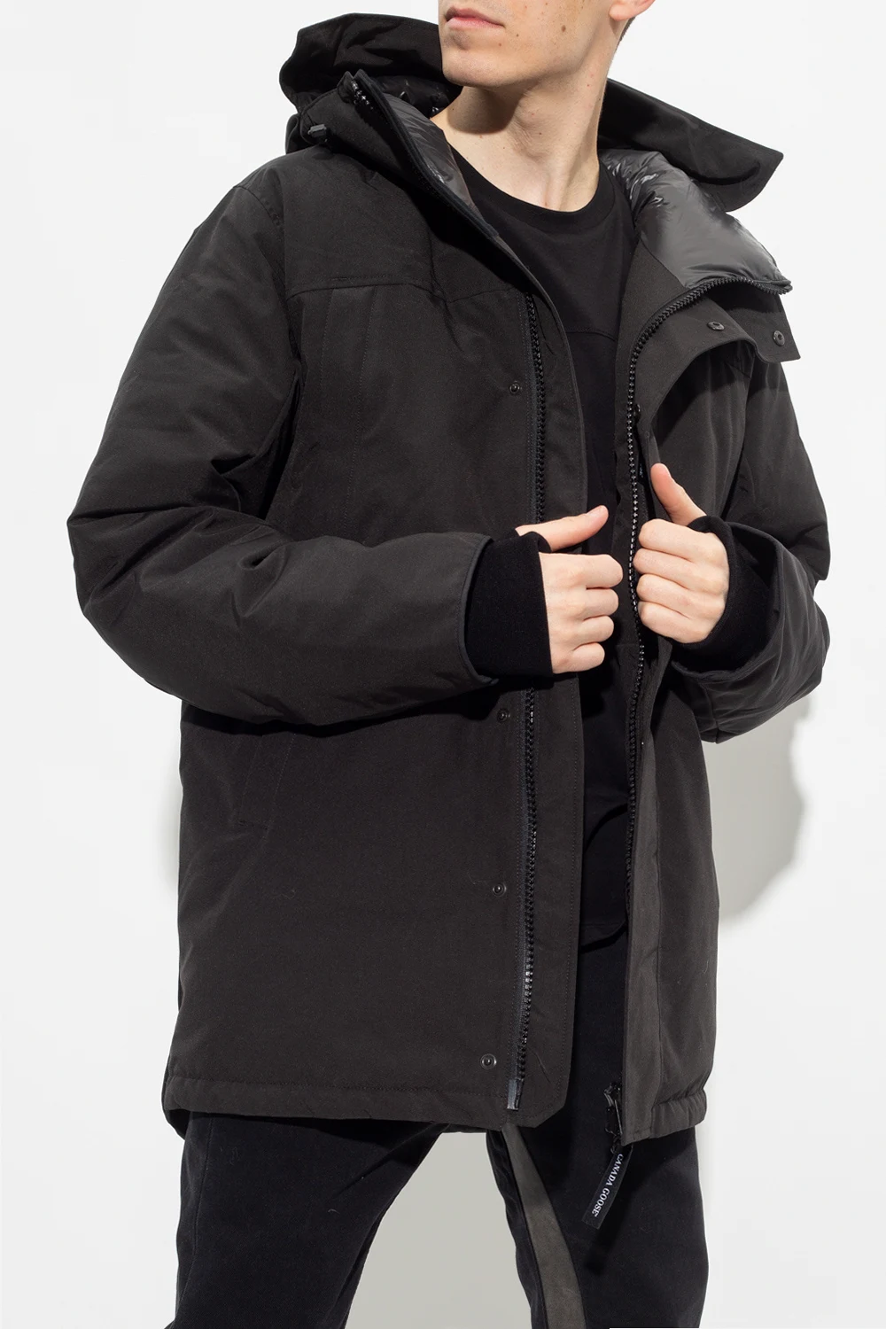 Black ‘Sanford’ quilted jacket from Canada Goose. Filled with duck down, this style secures with a two-way zip and snaps and features a drawcord-adjustable hood, four zip pockets on the front, a branded sleeve patch, snap closures on the side, long sleeves with elasticated cuffs and thumbholes, and internal straps which allow the item to be carried hands-free over the shoulders.