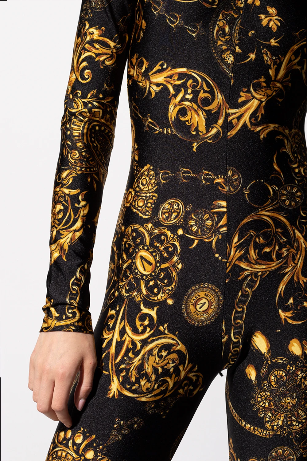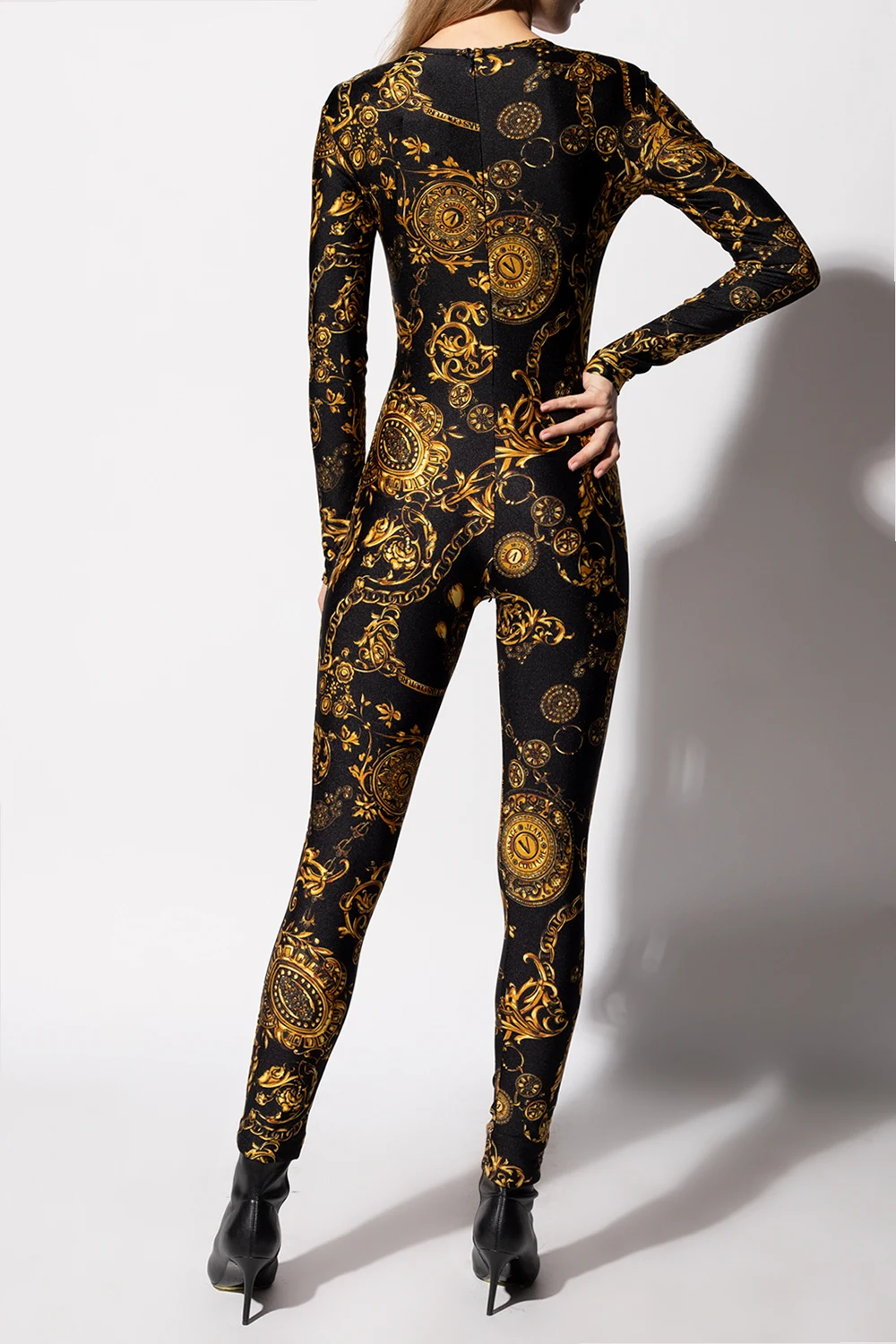Black jumpsuit from Versace Jeans Couture. Cut with a form-fitting silhouette, this long-sleeved design secures with a zip and a hook & eye closure on the back and showcases the brand's iconic Barocco print in orange with an accompanying logo.