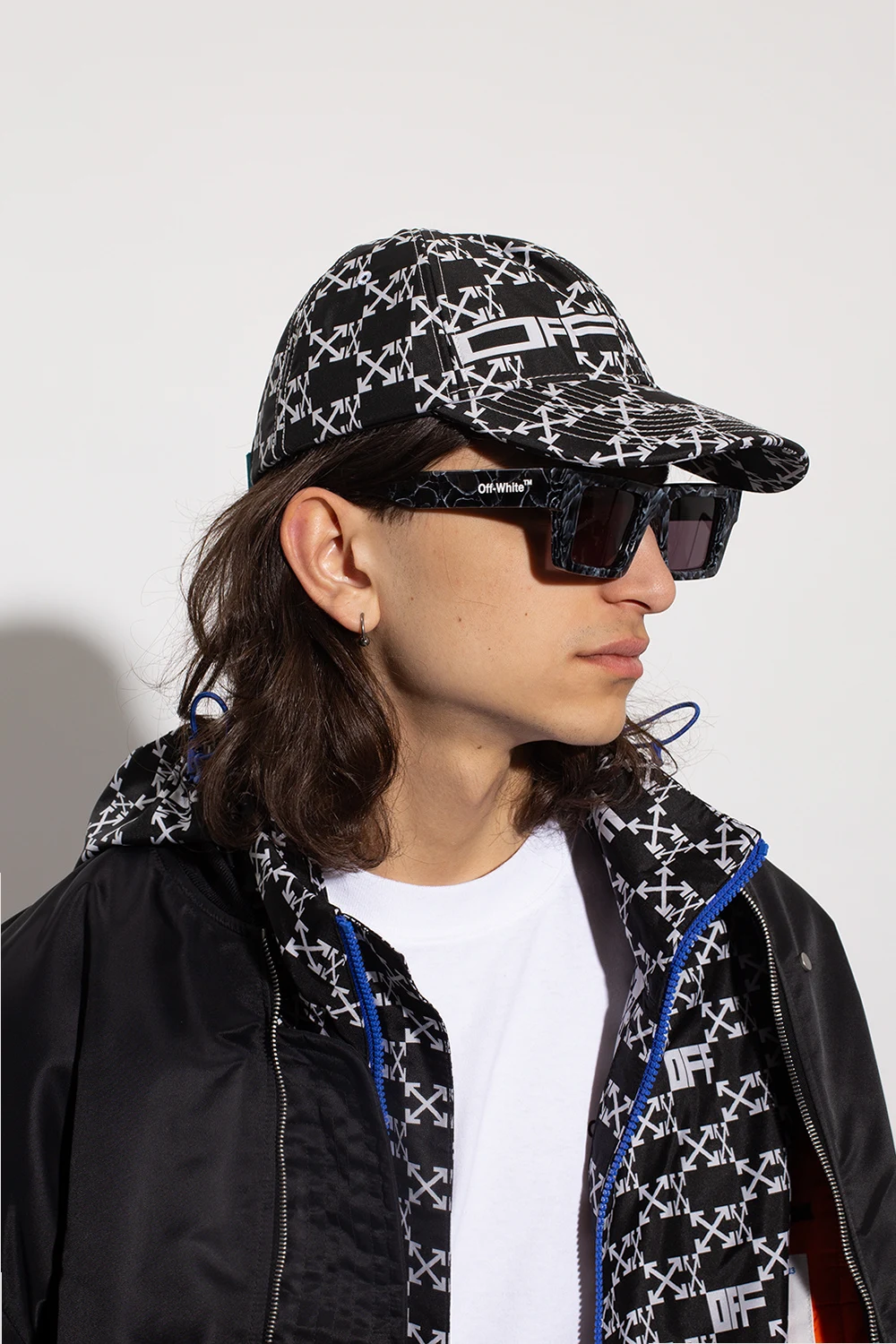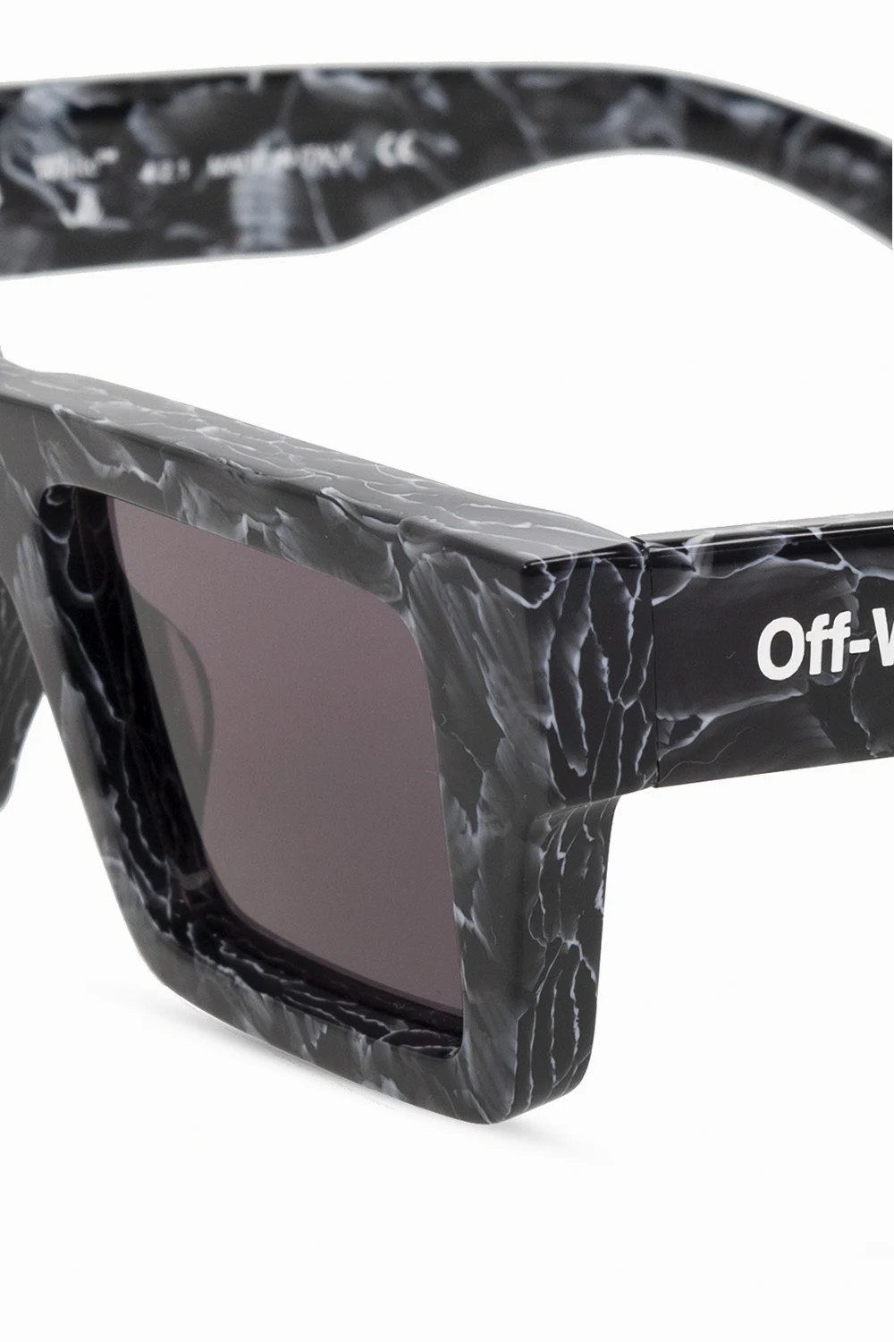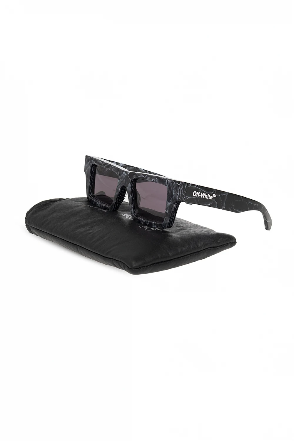 Black, grey and white ‘Nassau’ sunglasses from Off-White. This square frame pair has temples embossed with a white logo, decorative pattern and grey lenses with 100% UV protection. Case included.