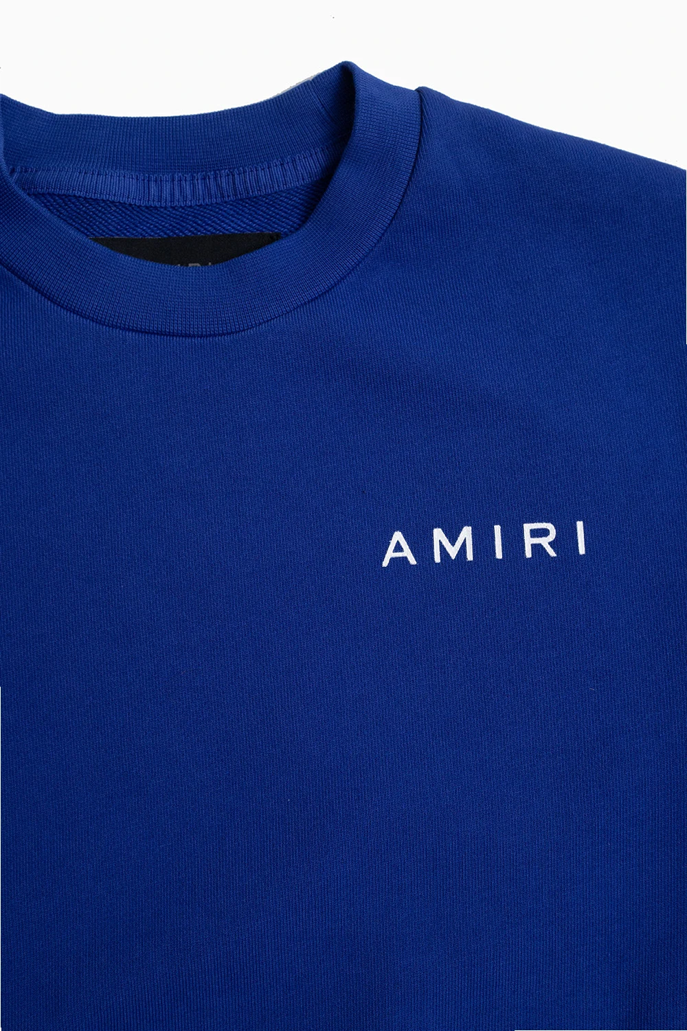 Dark blue hoodie from Amiri Kids. Crafted from cotton, this design features a white logo print, multicolored print at the back and ribbed trims at the crew neck, hem and cuffs.