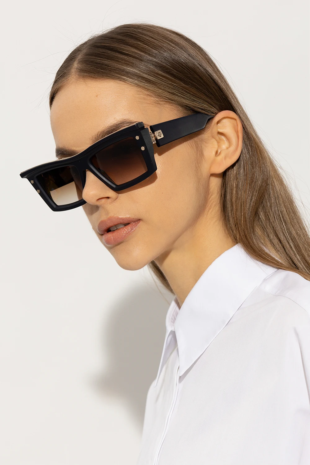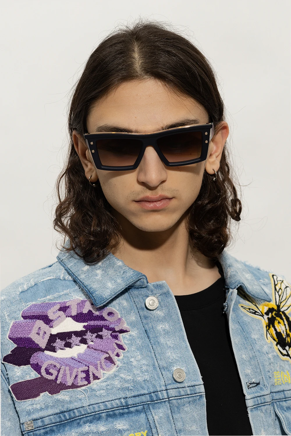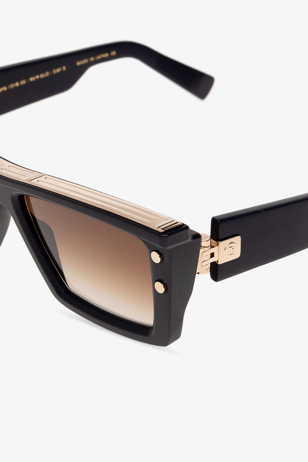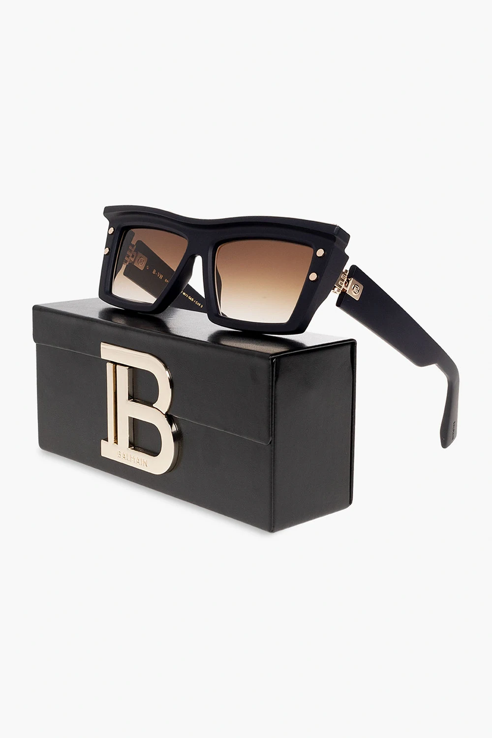 Navy and gold-tone ‘B-VII’ sunglasses from Balmain. This pair has rectangular frames made of matte acetate and features titan elements with a logo, monogram studs on the front, wide temples with decorative hinges and brown gradient lenses with UV protection. Comes with a case.