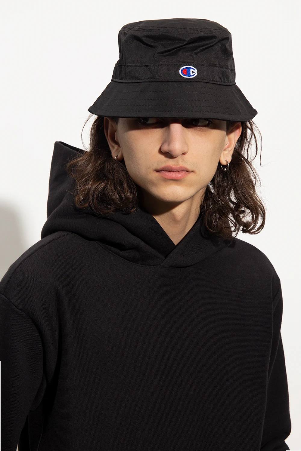 Black bucket hat with a logo patch in white, blue and red from Champion.