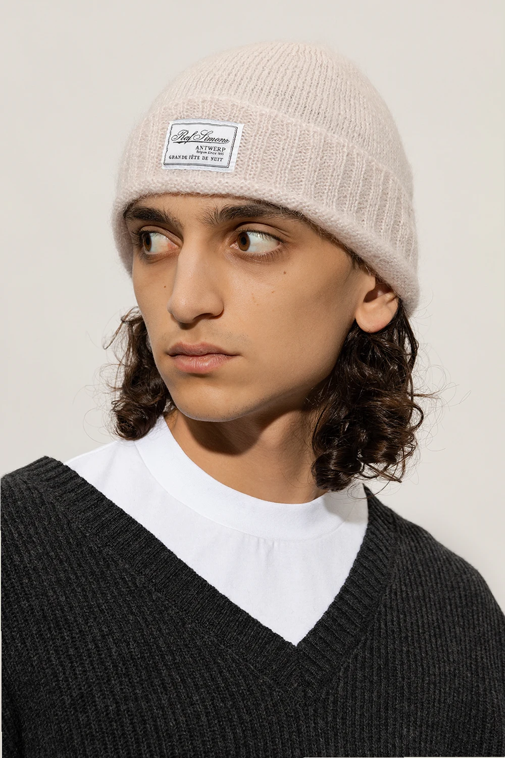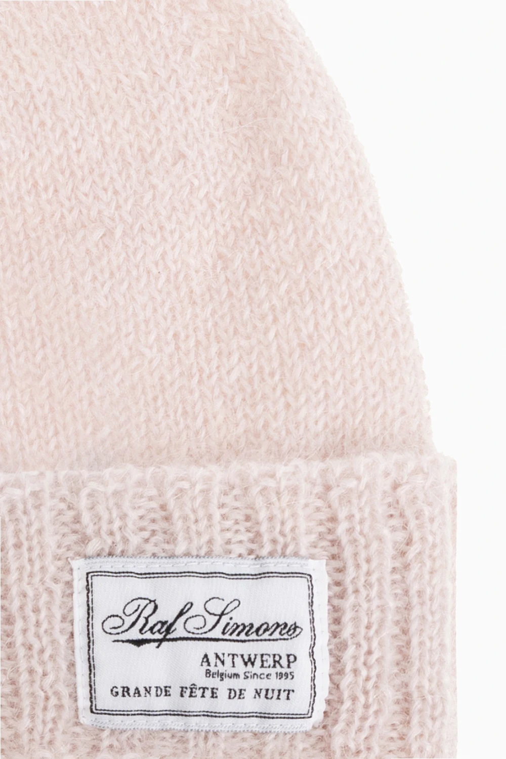 Light pink beanie from Raf Simons. Crafted from a mohair and wool blend, this item features a logo patch, stripe pattern and ribbed edges.