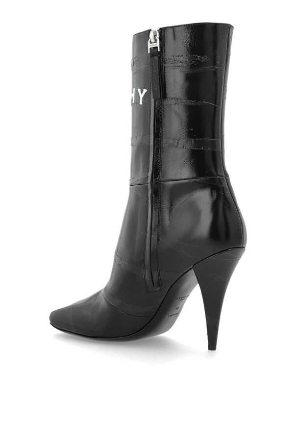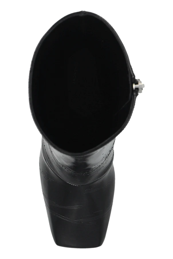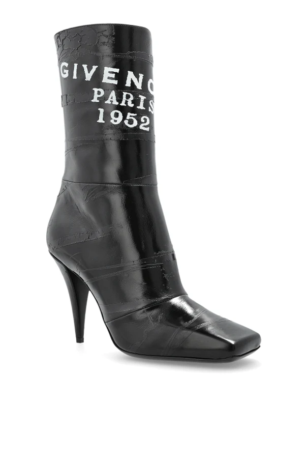 Stiefeletten mit Absatz „Square“ aus der exklusiven Kollektion von Givenchy verkörpern die Quintessenz moderner Eleganz. Sie zeichnen sich durch eine geometrische, deutlich quadratische Zehenpartie aus, die in Verbindung mit dem hohen, schlanken Stiletto-Absatz dem gesamten Erscheinungsbild einen majestätisch-nonchalanten Charakter verleihen. Der mittelhohe Schaft schmiegt sich dezent um das Bein und ist mit dem markanten weißen Schriftzug „GIVENCHY PARIS 1952“ versehen – ein unverkennbares Markenzeichen dieses renommierten Labels.