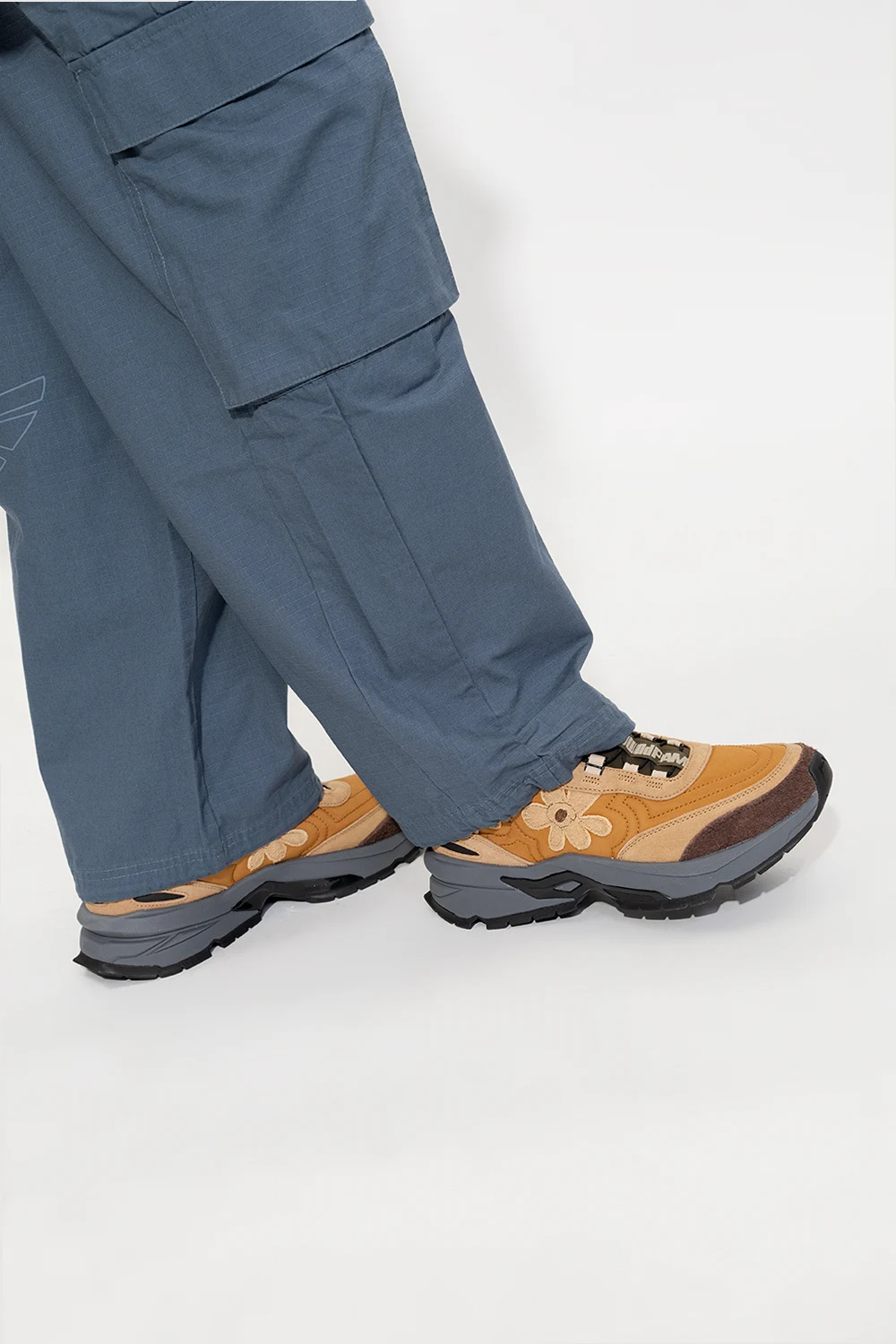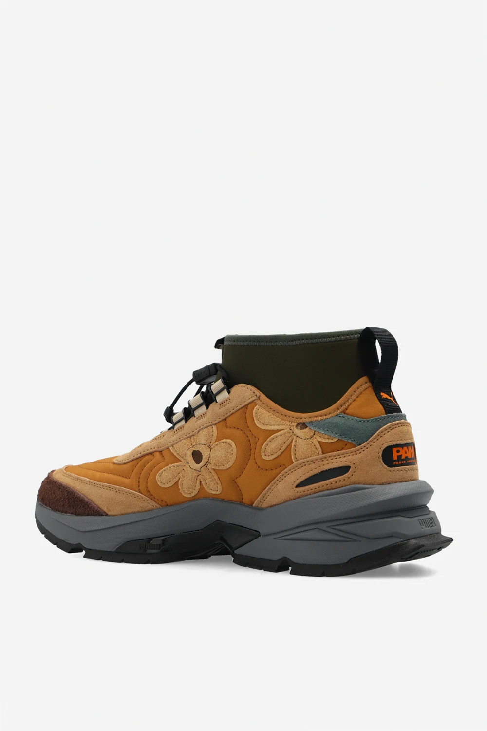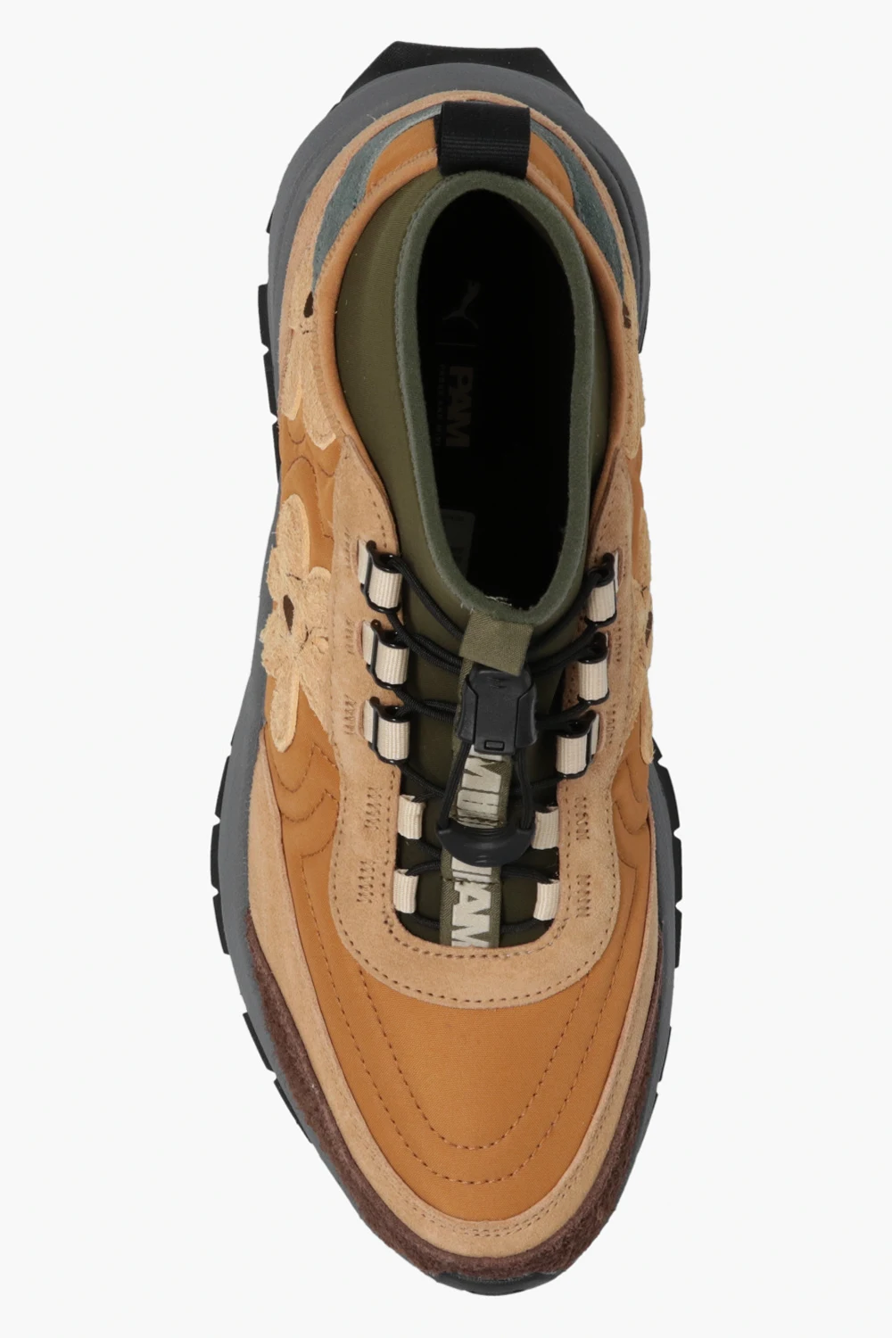 Brown, beige and green ‘Nano’ sock sneakers from Puma x PAM. Made of fabric, this lace-up pair features floral patches, logo detail and rubber sole in black and grey.