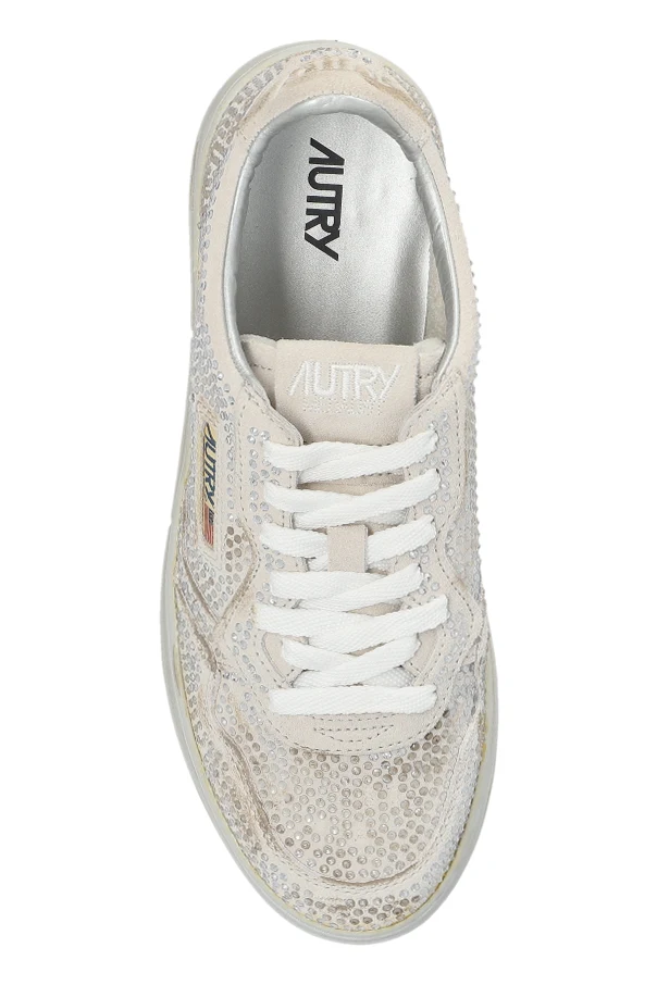 Die gesamte Oberfläche des Schafts ist mit edlen, glänzenden Applikationen verziert, die an Pailletten erinnern und dem Schuh einen exklusiven Charakter verleihen. Seitliche Paneele sind zusätzlich mit einer dezenten Perforation versehen, die Leichtigkeit sowie Liebe zum Detail unterstreichen. Einzigartiges Prestige bieten der unverwechselbare Logo-Patch „AUTRY“ sowie das amerikanische Flaggenmotiv.