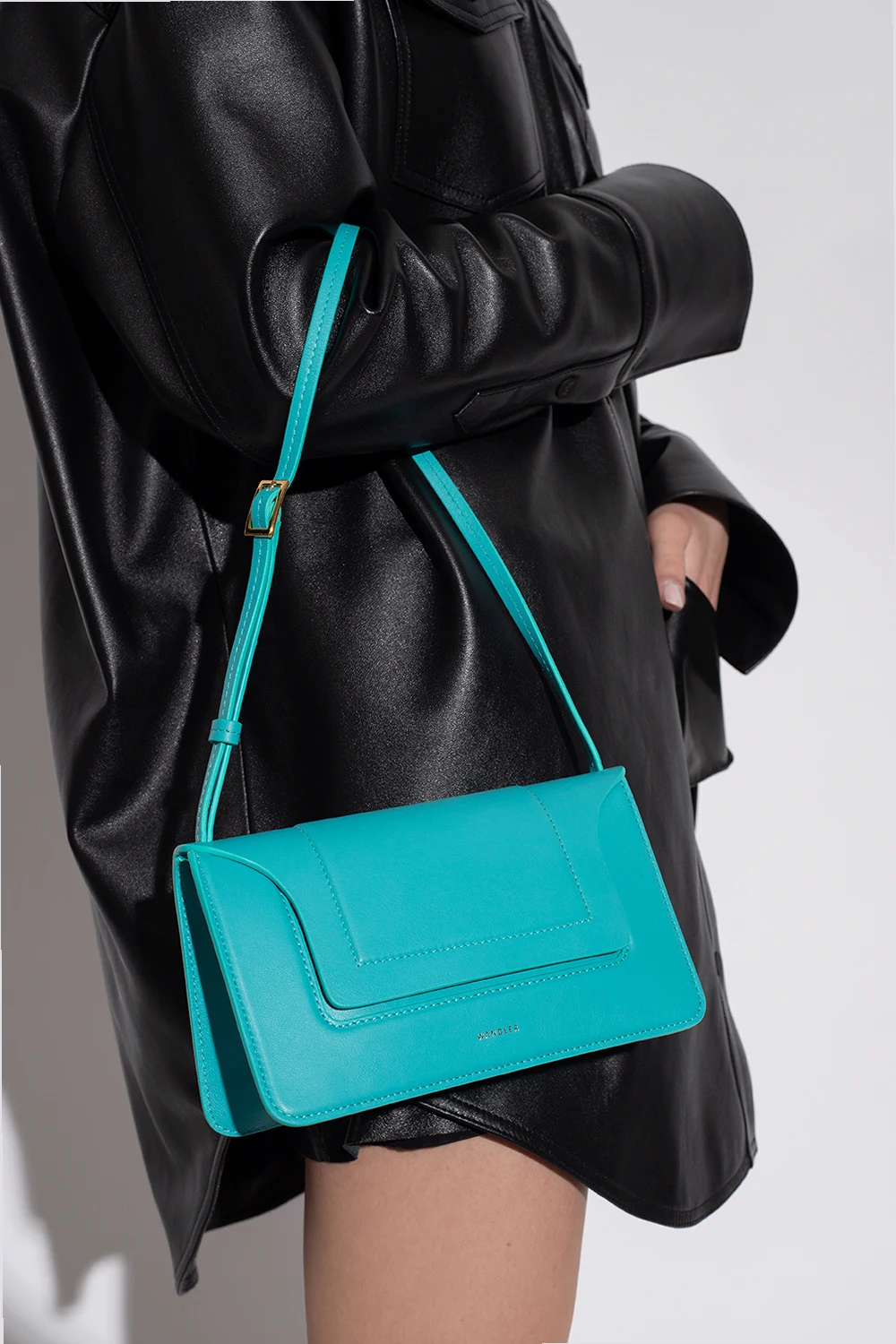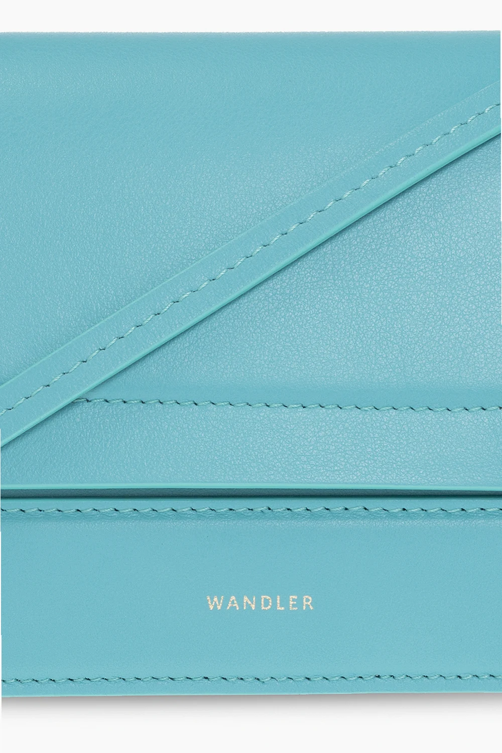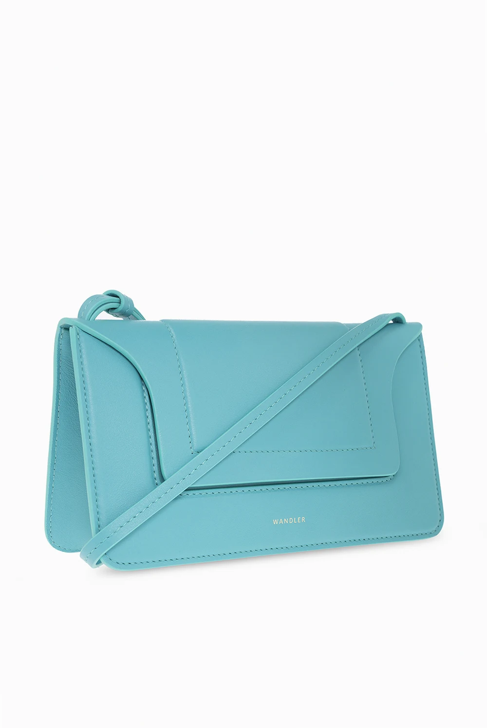 Blueish green 'Penelope' shoulder bag from Wandler. Handcrafted from calf leather, this design secures with magnetic snaps and features a gold-tone logo printed on the front, an adjustable shoulder strap, gold-tone metal hardware and one internal compartment with two card slots.