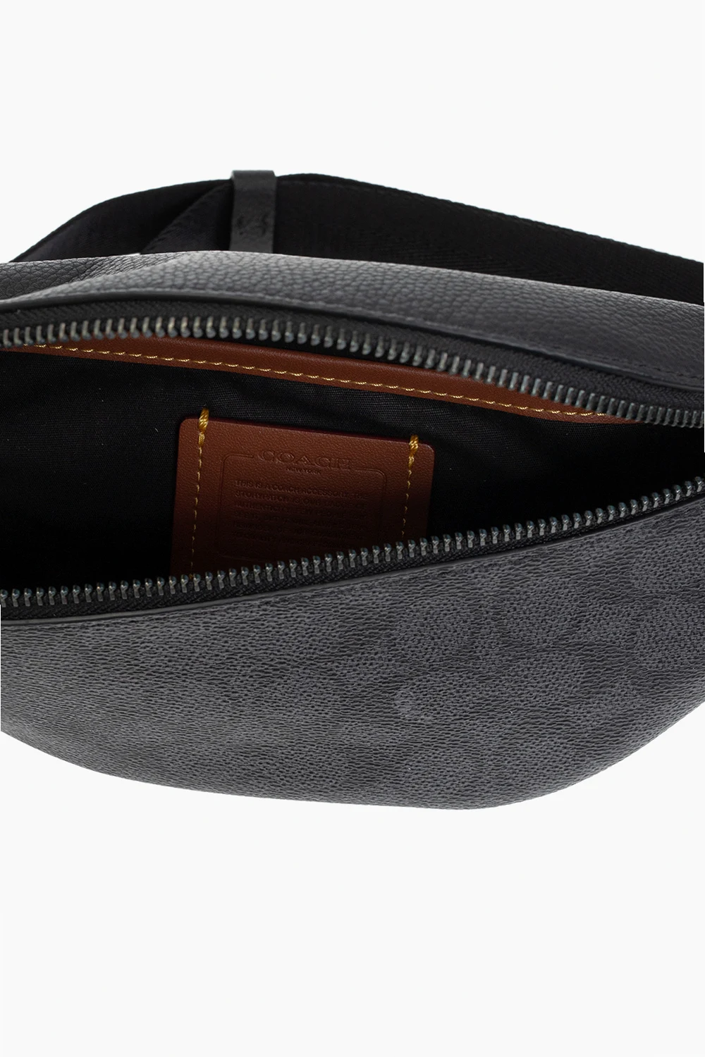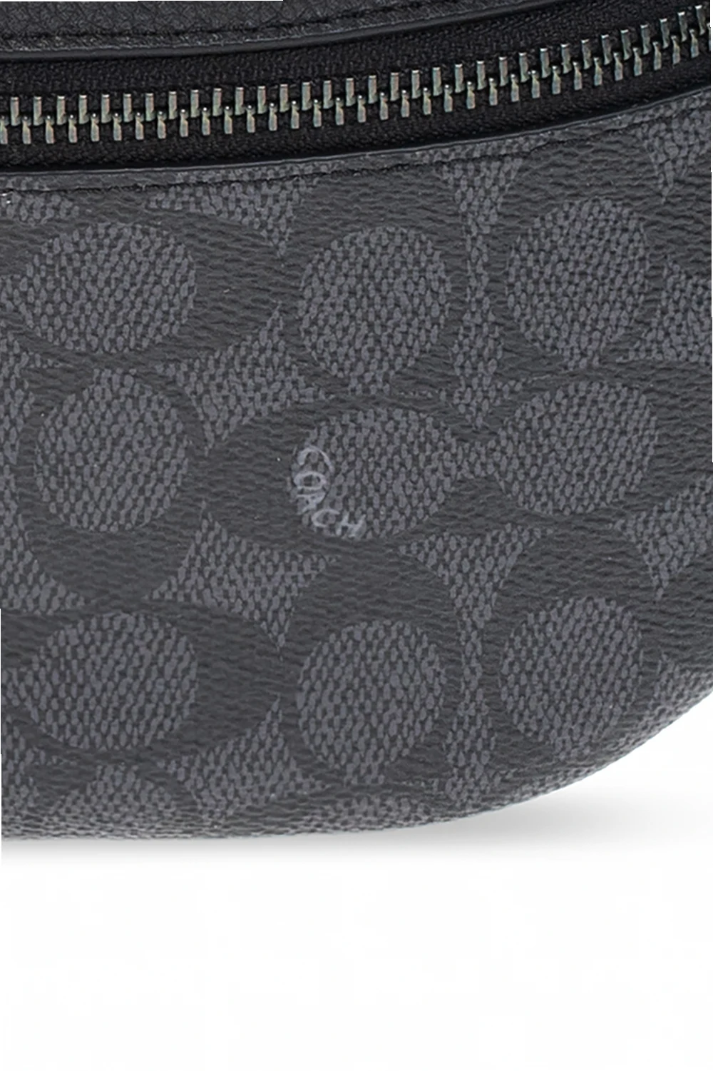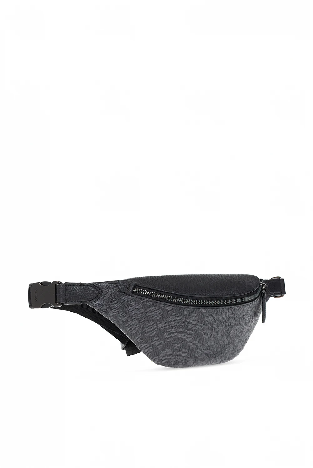 Grey and black belt bag from Coach. Crafted from monogrammed canvas and leather, this design features a zip fastening, an adjustable strap, black metallic hardware and one internal compartment with a slip pocket.