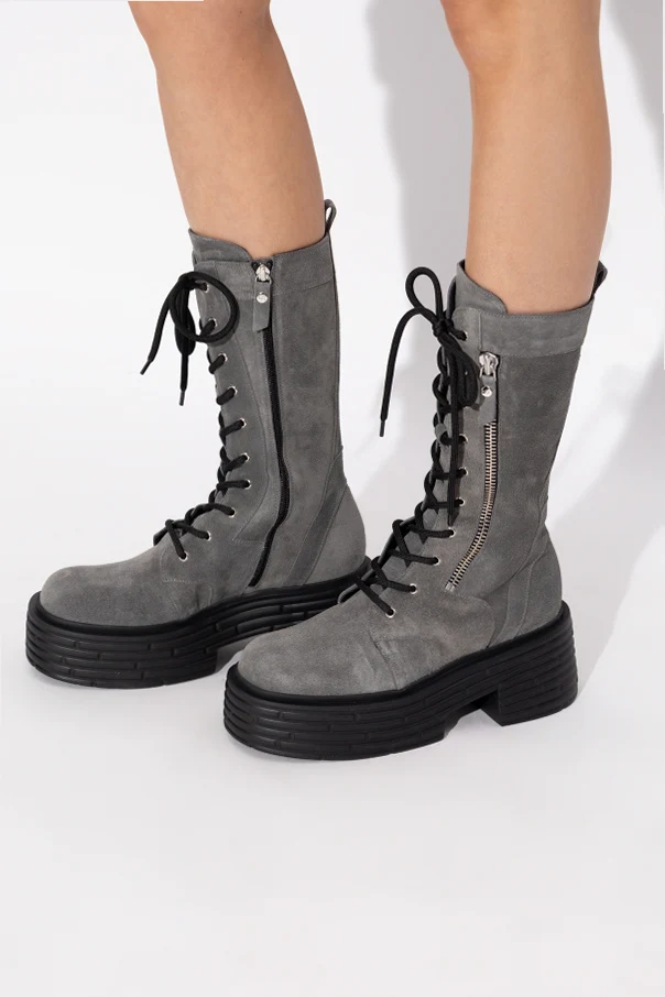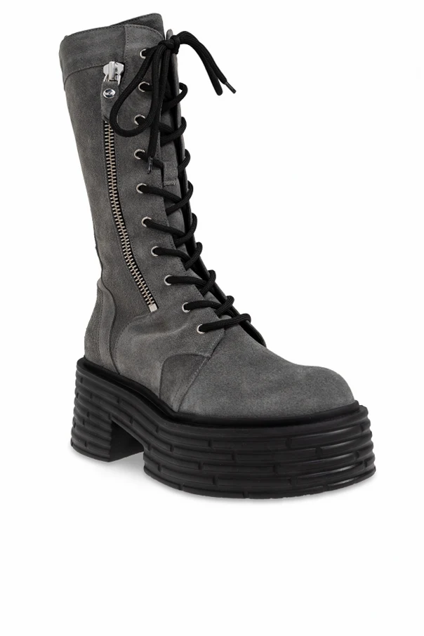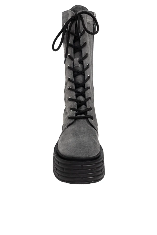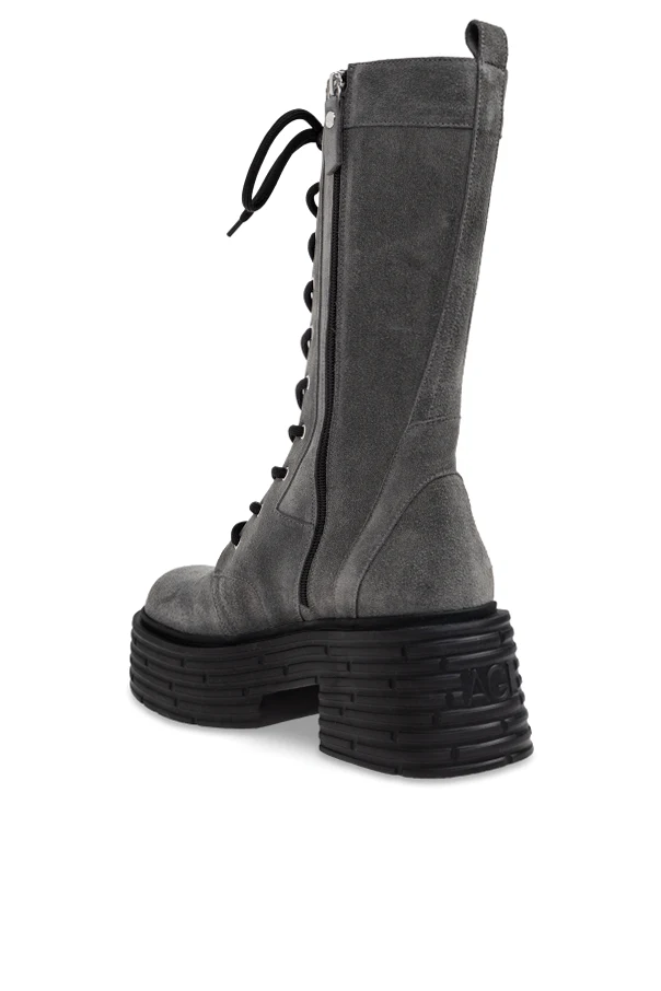 Lignes Plateauschuhe aus Veloursleder der Marke AGL verkörpern außergewöhnliche Eleganz und avantgardistischen Stil. Der massive, verlängerte Schaft in Grautönen kombiniert mit einem modernen Profil und einer markanten, abgerundeten Kappe ergibt eine Silhouette voller zeitgenössischer Stärke und subtiler Raffinesse. Der Schuh wird durch eine breite, geometrische Plateausohle und einen betonten, mittelhohen Absatz aus schwarzem Material mit einzigartiger, mehrschichtiger Struktur veredelt. Diese Elemente strecken harmonisch die Silhouette und verleihen dem Gesamtbild einen futuristischen Akzent.
