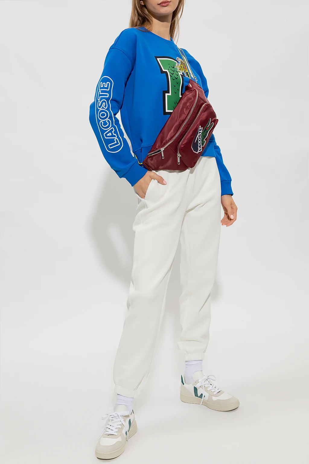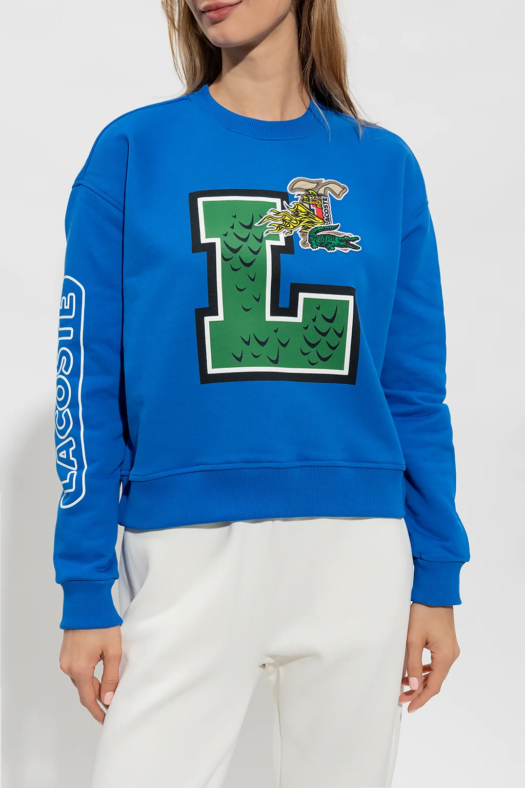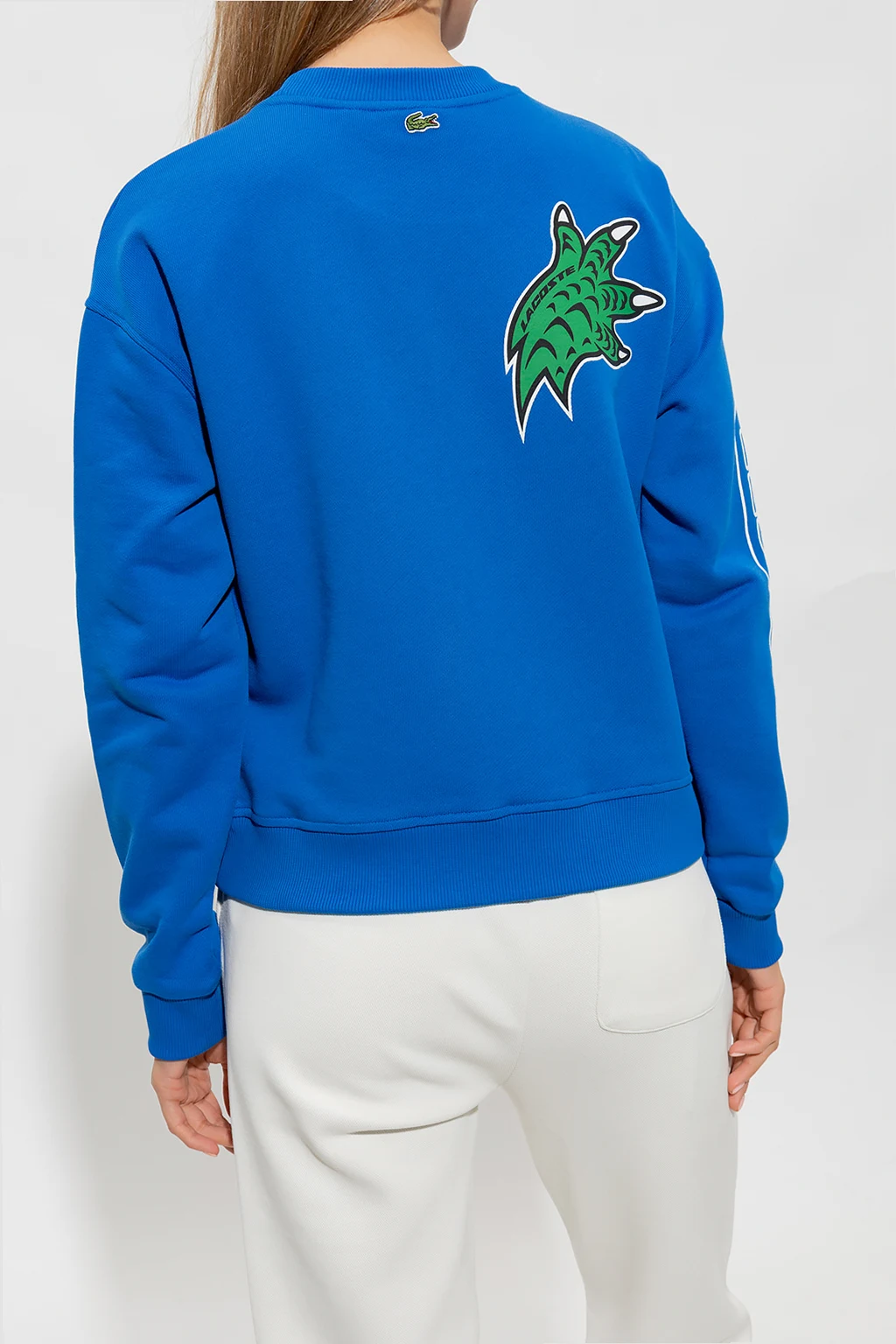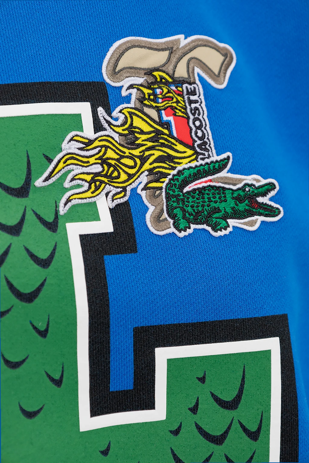 Blue crewneck sweatshirt from Lacoste. Crafted from a blend of organic and recycled cotton, this style showcases colourful graphic prints accompanied by a logo patch, long sleeves and an elasticated collar, bottom hem and cuffs.