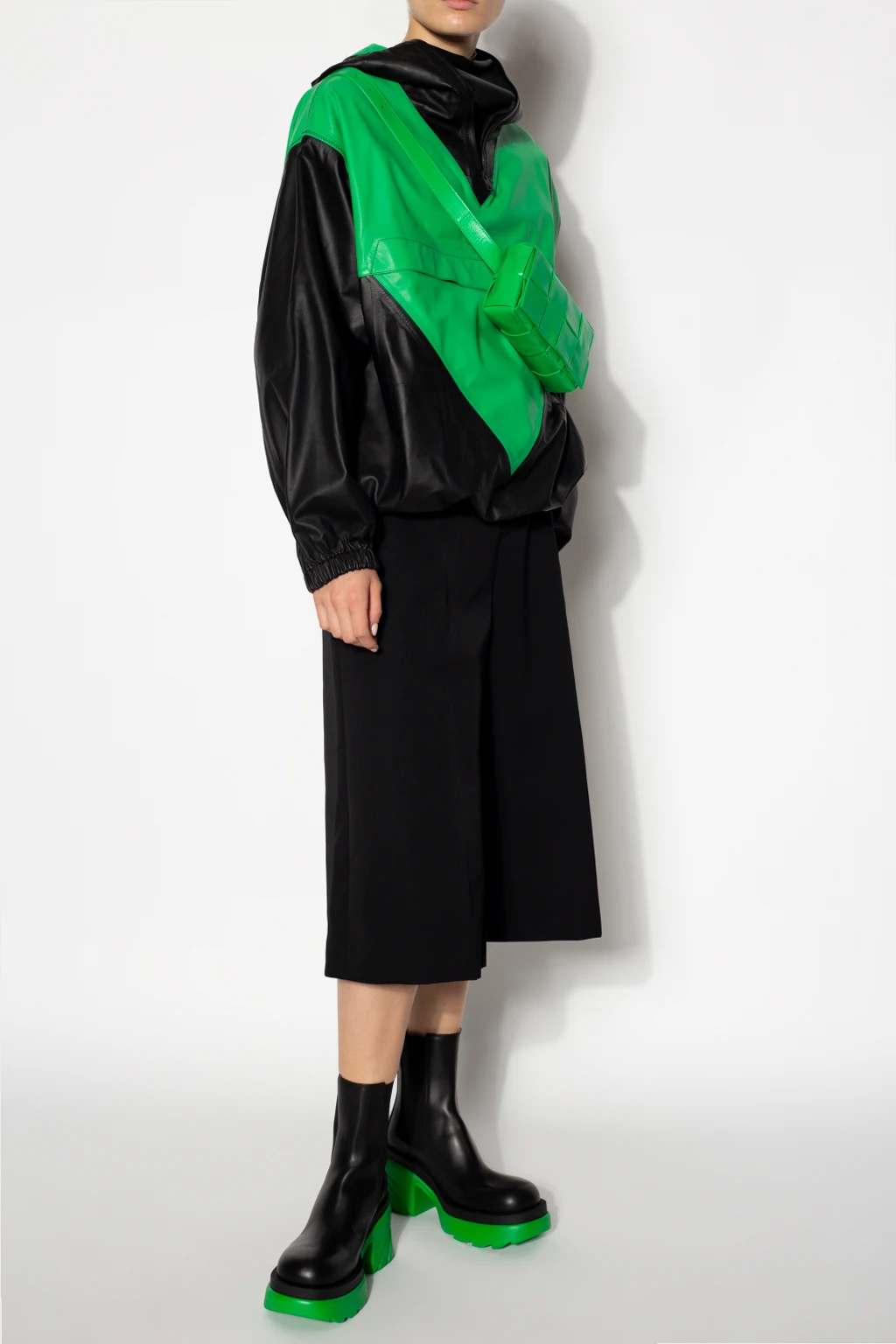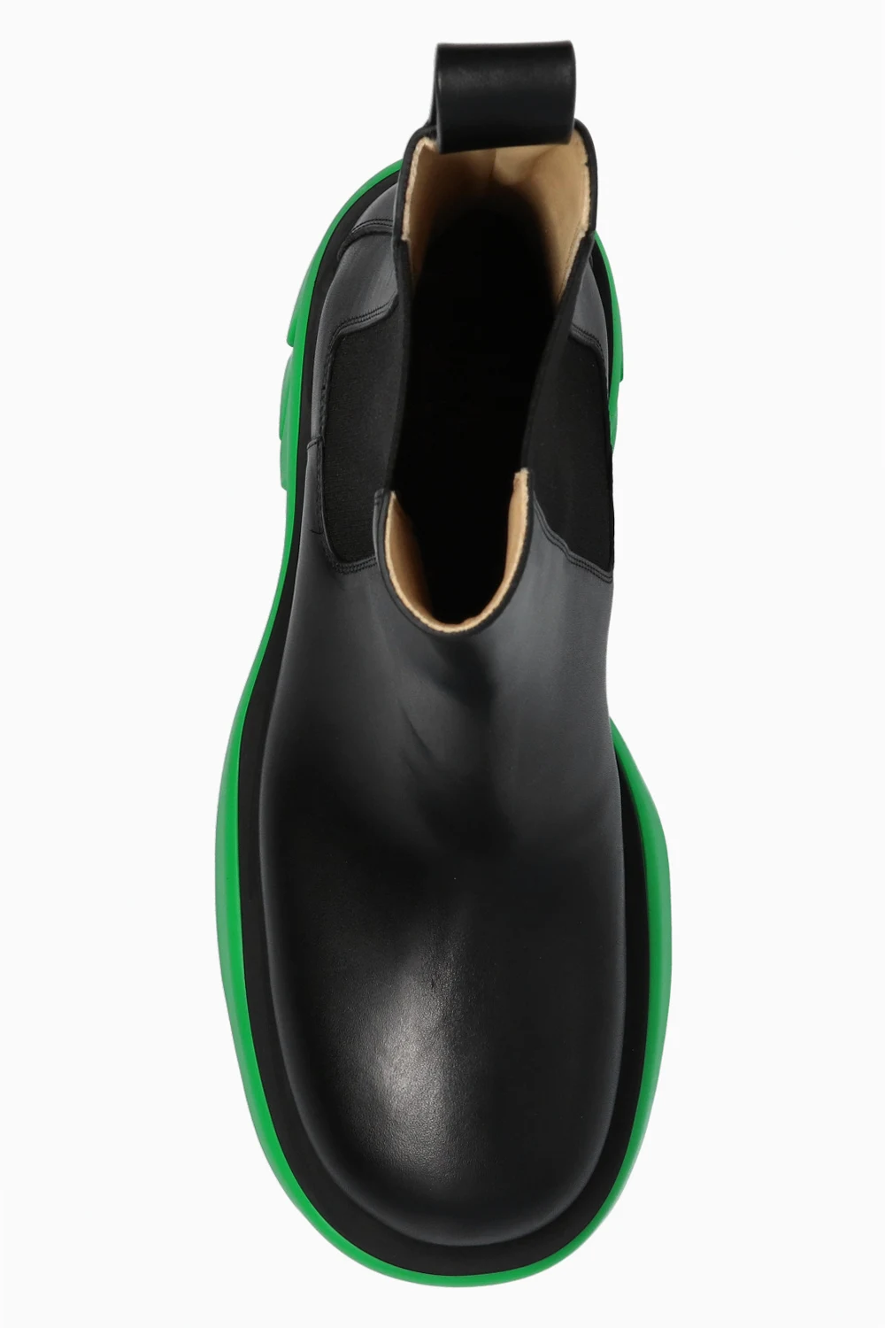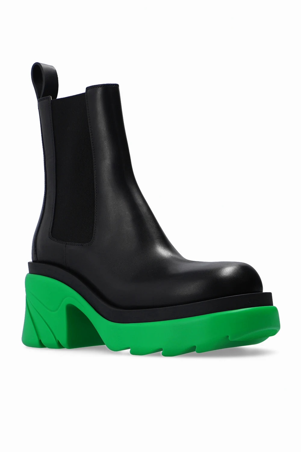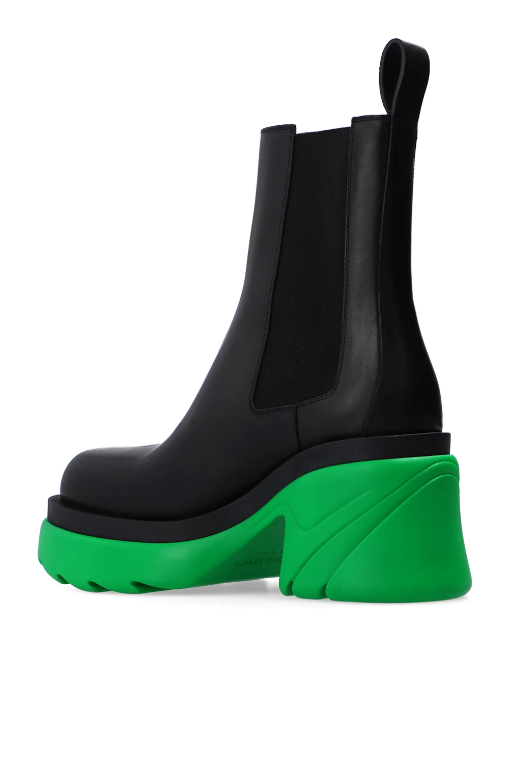 Black ‘Flash’ platform ankle boots from Bottega Veneta. Crafted from calf leather, this model sits on a green rubber sole and features elastic panels on the sides.