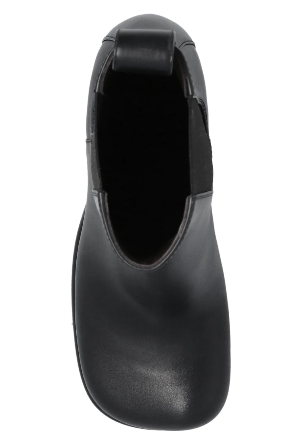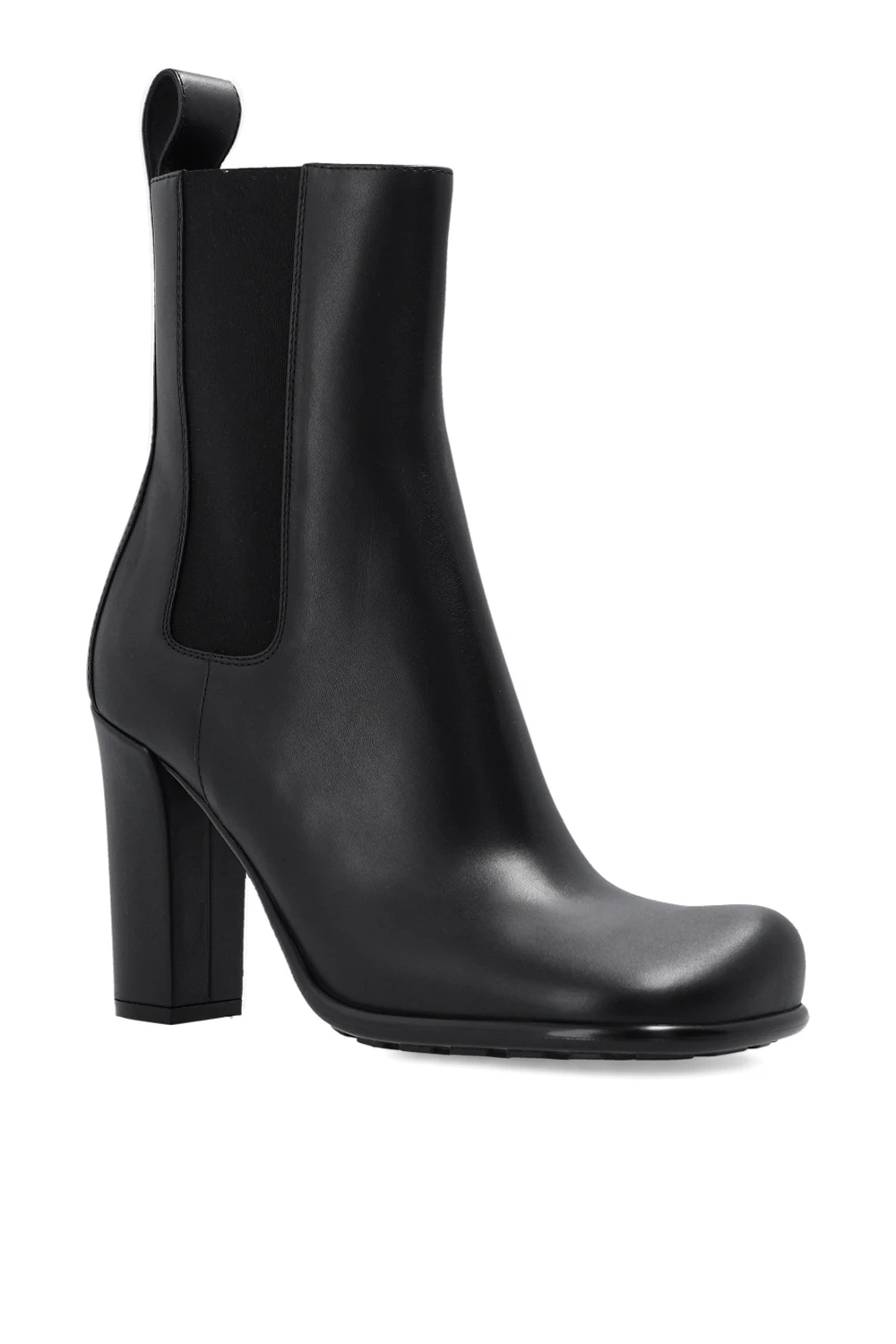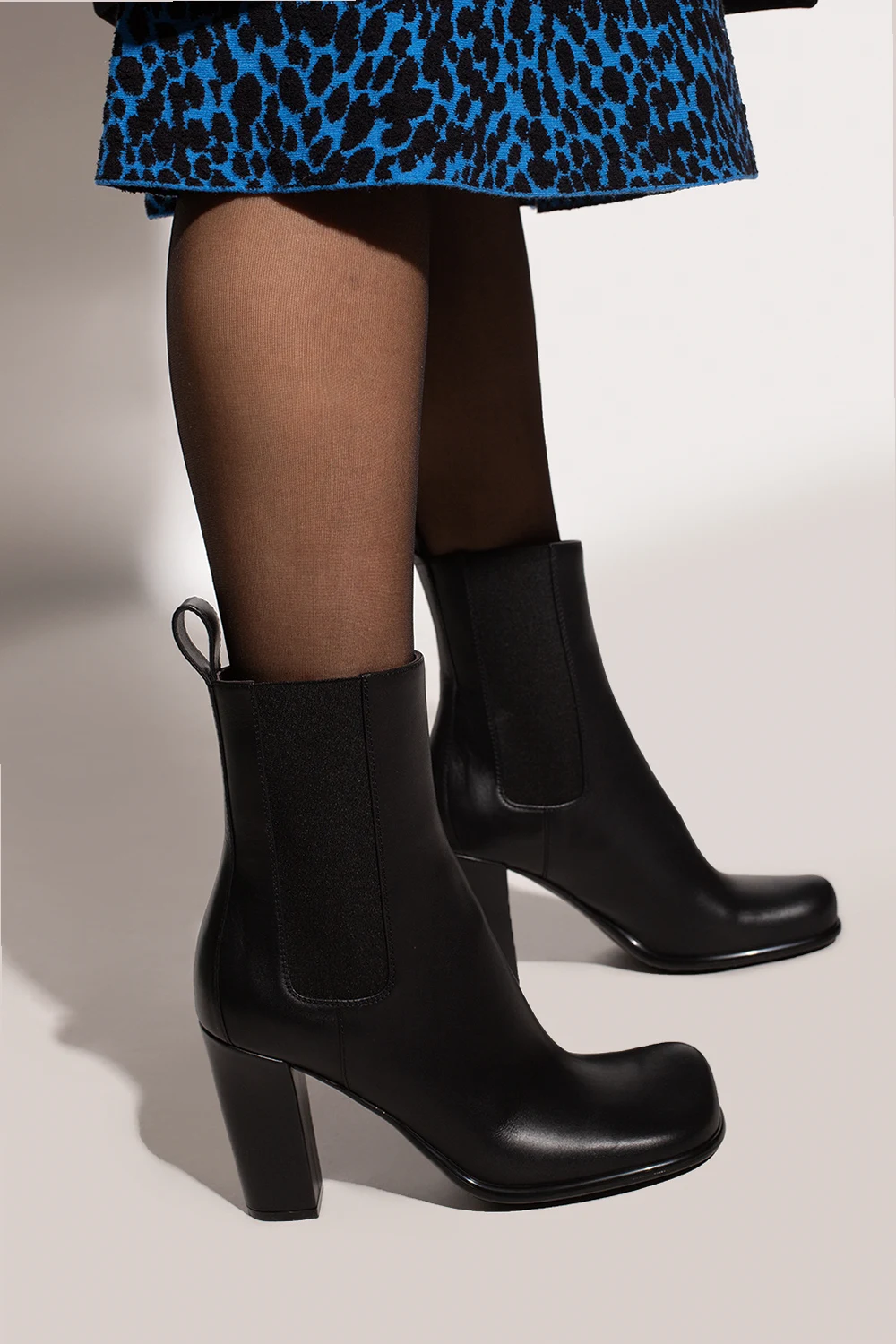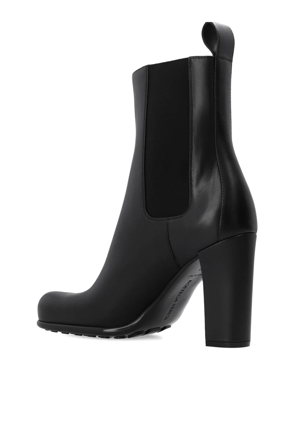 Black ‘Storm’ heeled ankle boots from Bottega Veneta. Crafted from calf leather, this pair rests on a black rubber sole and has elastic side panels and a decorative toe.