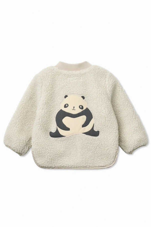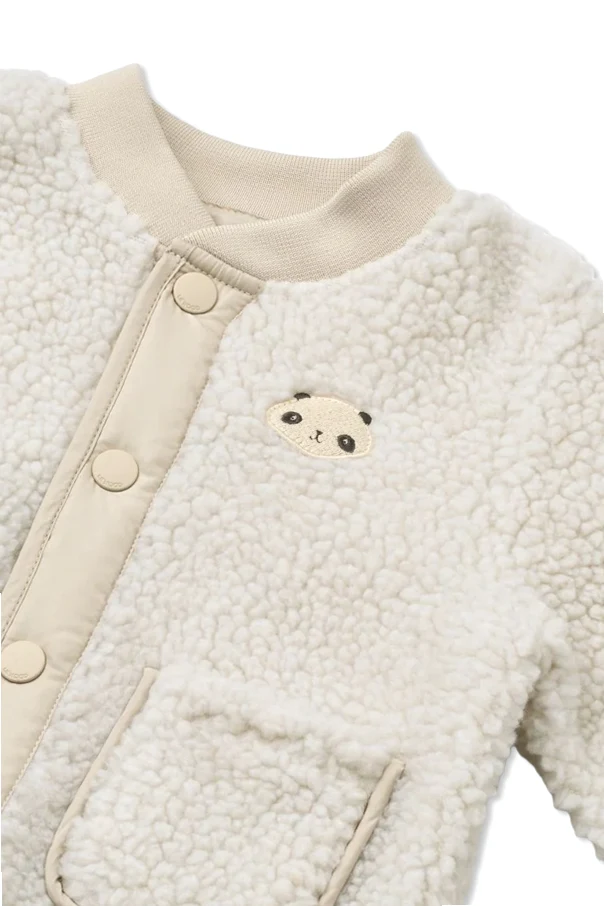 Die Vorderseite der Jacke ist glatt und wird von einer dezenten Applikation – einem Pandakopf – veredelt, während die Rückseite mit einem großen, schwarz-cremefarbenen Aufnäher einer sitzenden Panda begeistert. Große, cremefarbene Druckknöpfe sowie geschmackvolle Manschettenabschlüsse unterstreichen den besonderen Charakter dieses Modells, und zwei praktische Fronttaschen bilden einen dezenten, funktionalen Akzent.