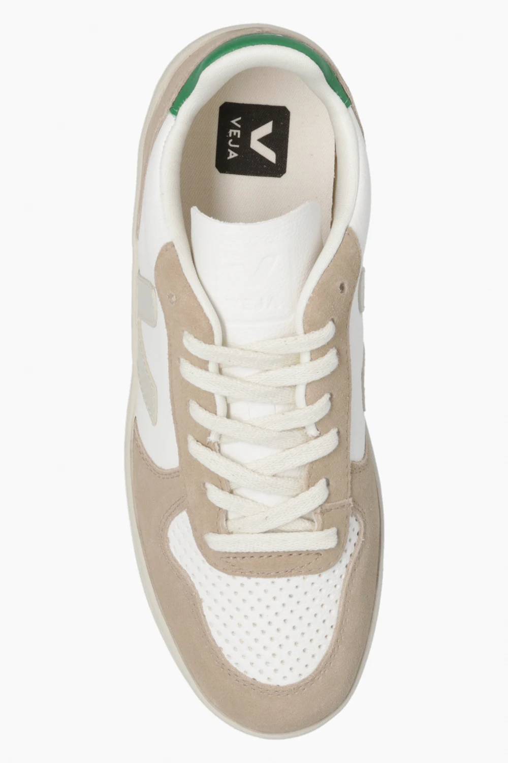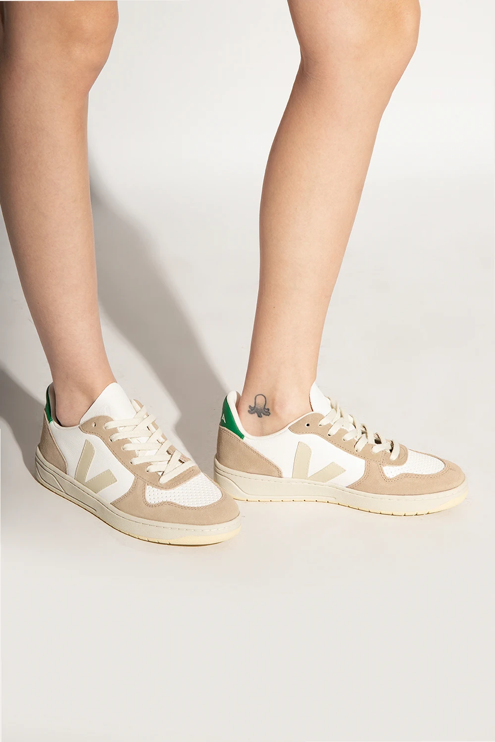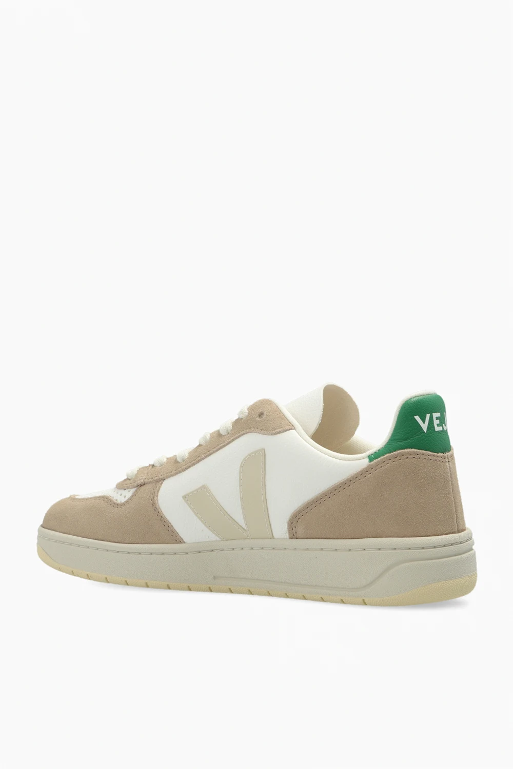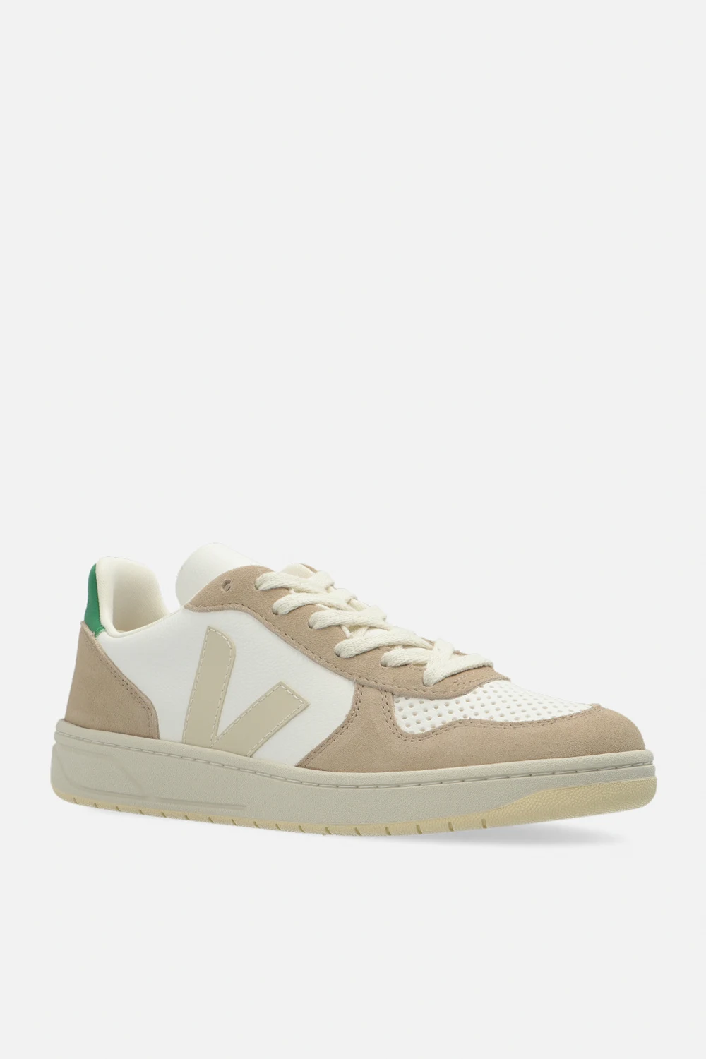 White ‘V-10’ sneakers from Veja. Crafted from leather, this lace-up model features an embossed logo on the tongue, the brand's signature beige V patch made of rubber and rice waste, a perforated toe, organic cotton shoelaces and a back green insert. The mesh inner lining made from recycled materials was developed to acquire a better resistance to friction. The organic-sourced and recycled insole consists of sugar cane, Amazon rubber, organic cotton and recycled EVA. It is set on a cream rubber sole made from organic and recycled materials. The leather comes from farms in Rio Grande do Sul and is L.W.G. Gold certified by the Leather Working Group, which promotes sustainable practices that have a positive impact on the environment in tanneries.