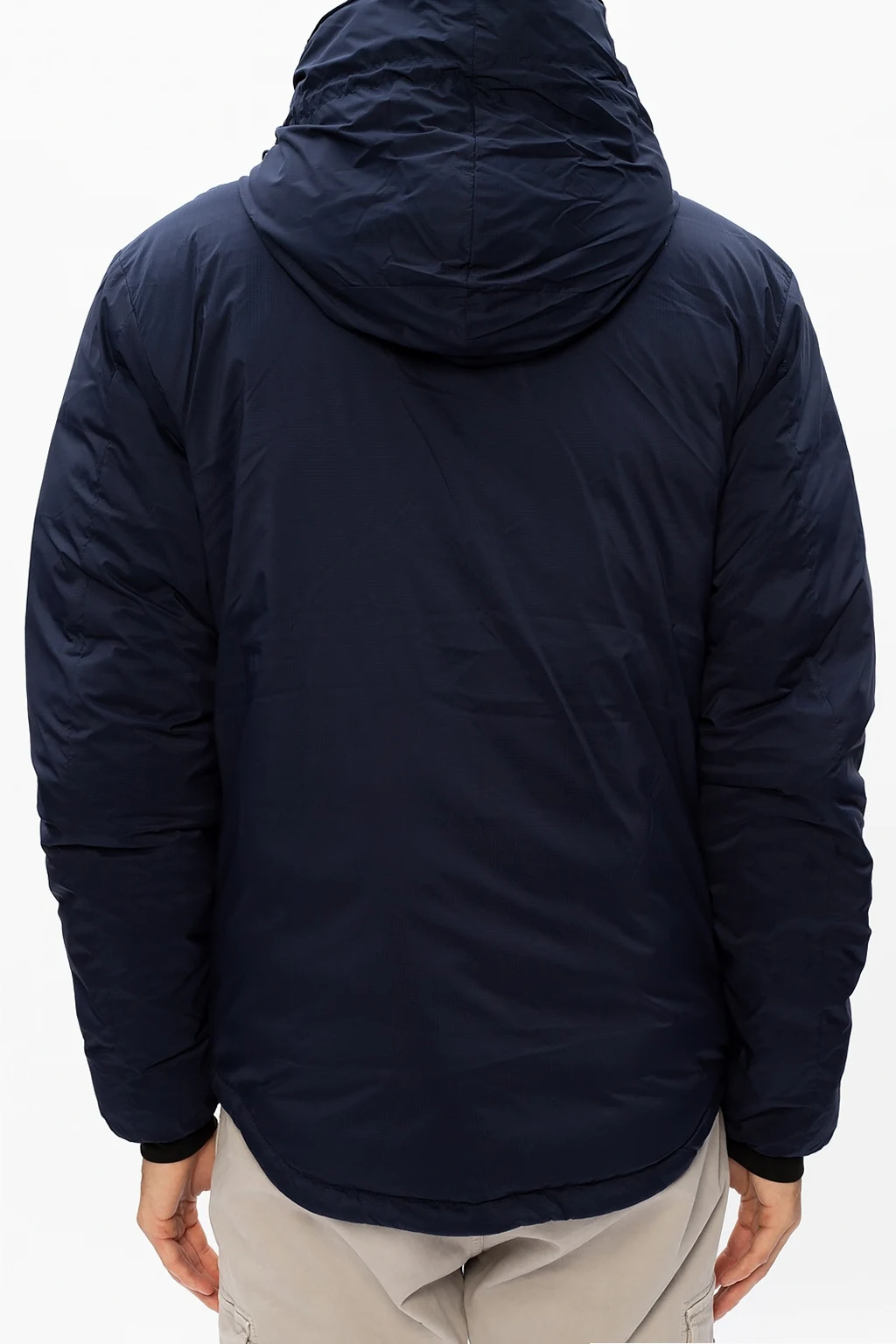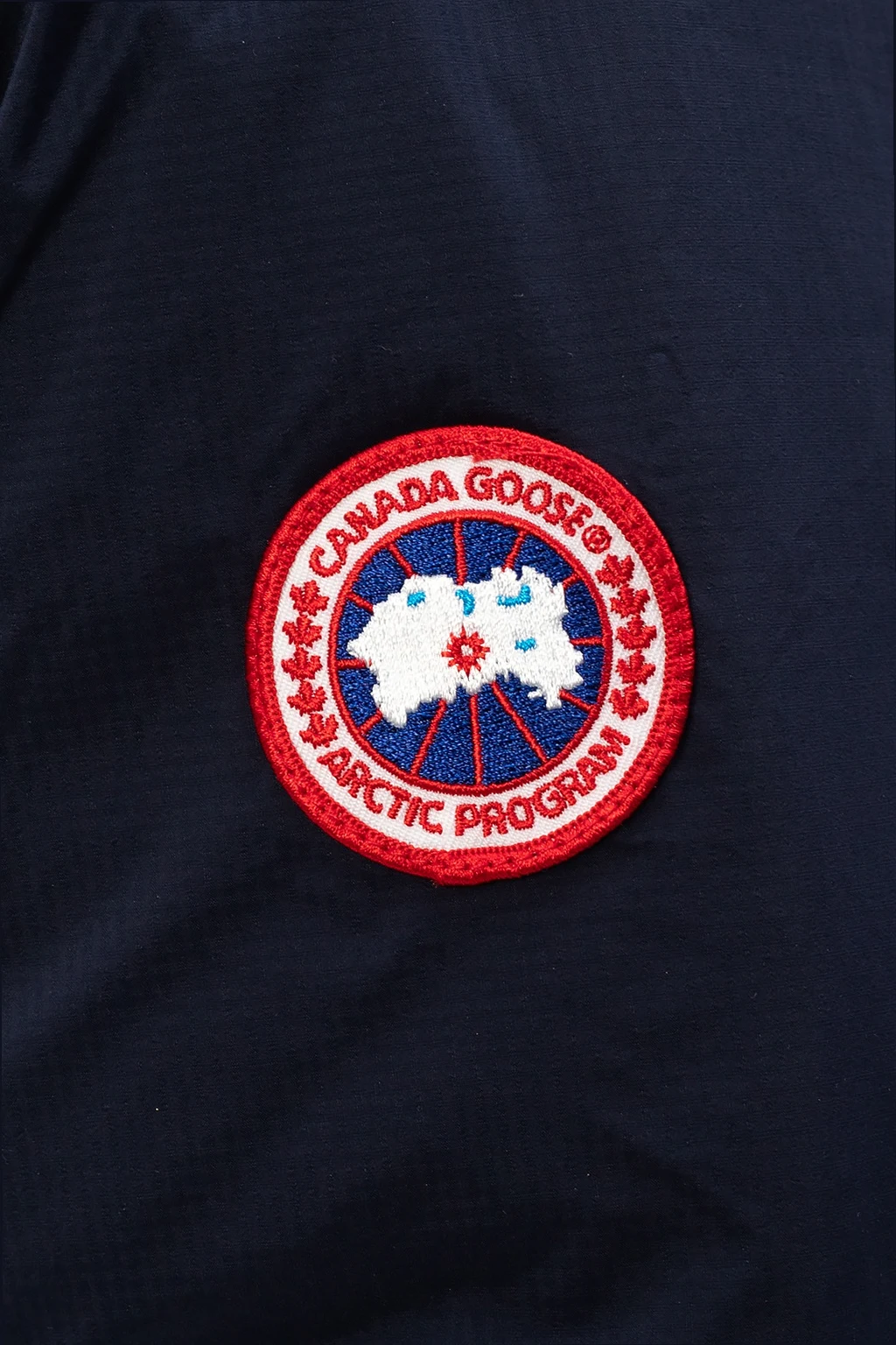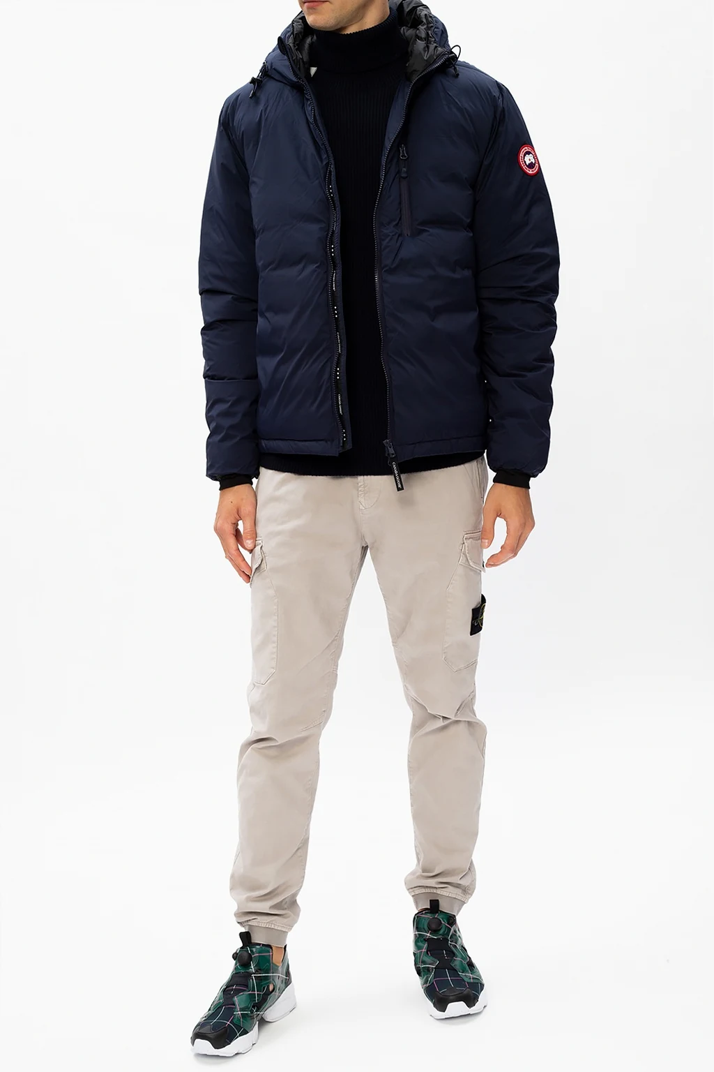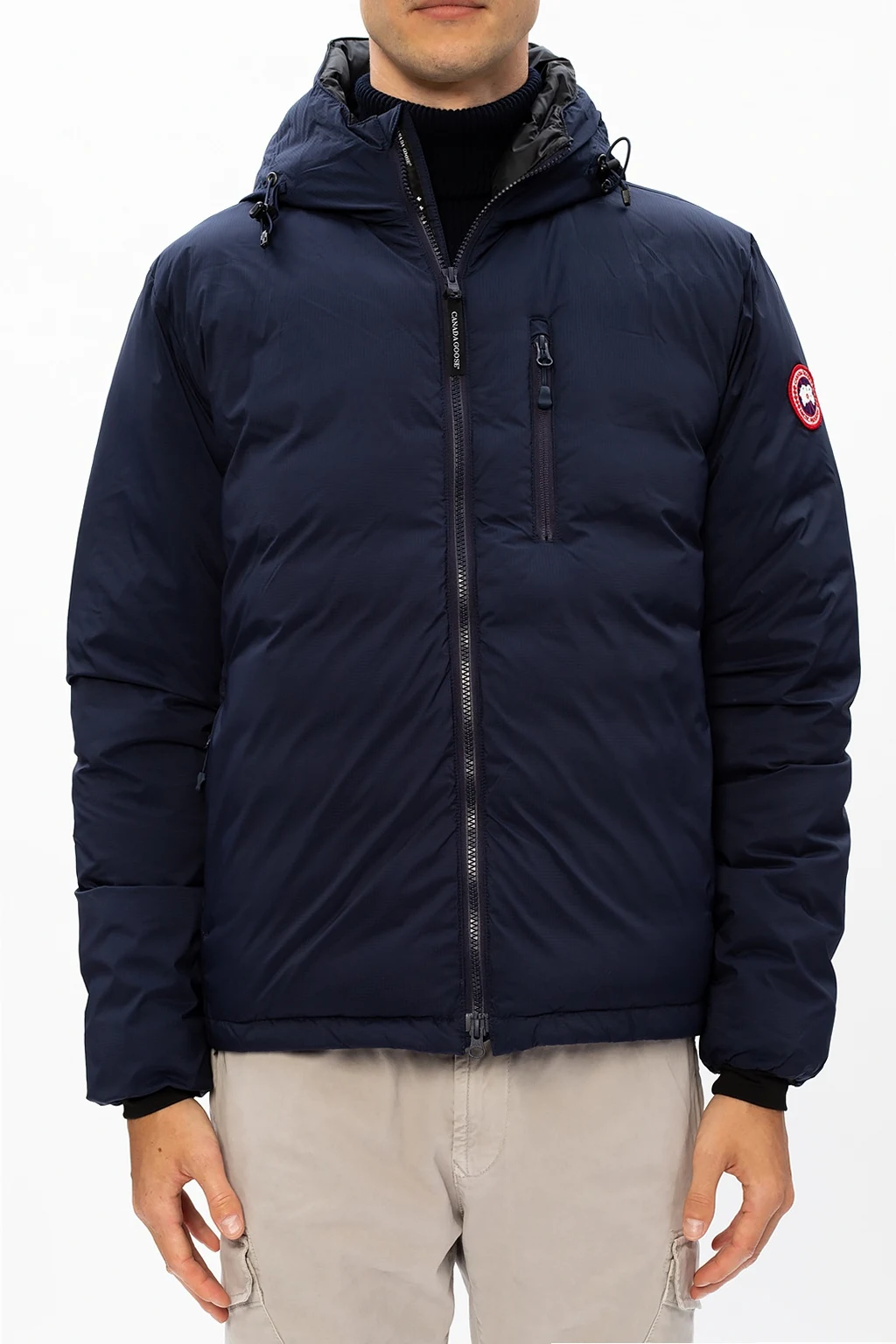 Navy ‘Lodge Hoody’ down jacket from Canada Goose. Fastened with a two-way zip, this garment features a drawstring hood, logo patch and three front zip pockets.