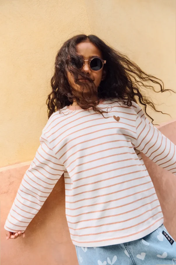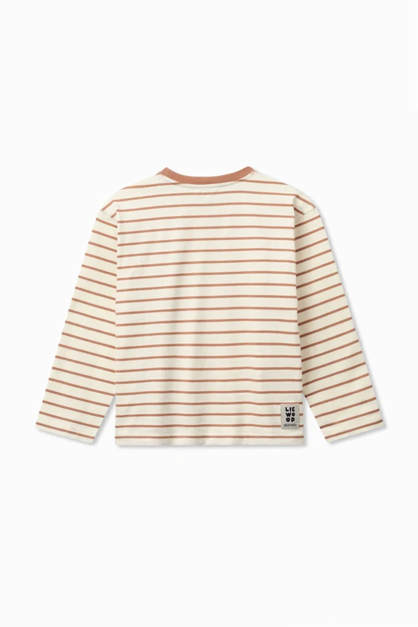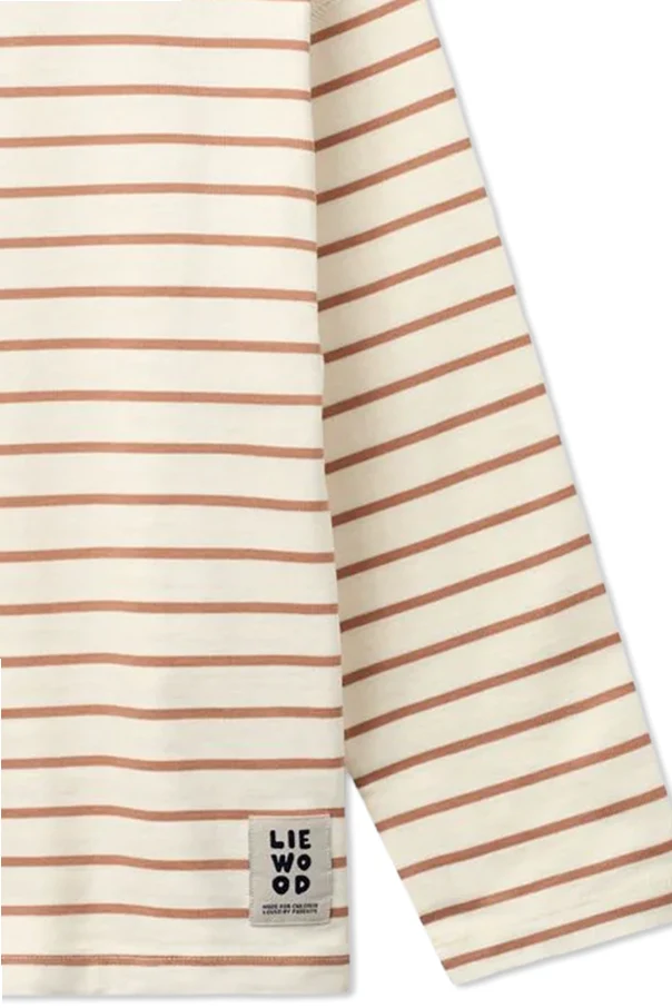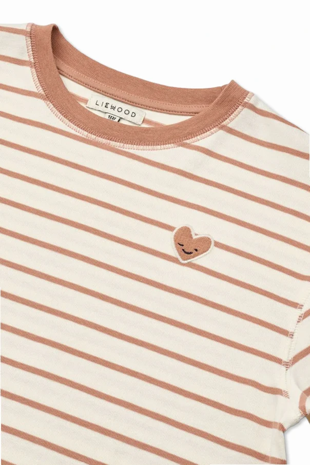 Das besonders weiche, hautfreundliche Material zeichnet sich durch die edle Qualität der hochwertigen Baumwolle aus. Auf der linken Brust befindet sich ein charmantes, beigefarbenes Herz-Patch mit einem dezenten, lächelnden Motiv, das dem Ganzen das gewisse Etwas verleiht. Der Ausschnitt und dessen Einfassung sind durch einen einheitlichen hellbraunen Akzent hervorgehoben, der perfekt mit der gesamten Komposition harmoniert. Zusätzlich wird der Look durch ein stilvolles Label mit dem Namen des Designers – Liewood – abgerundet.
