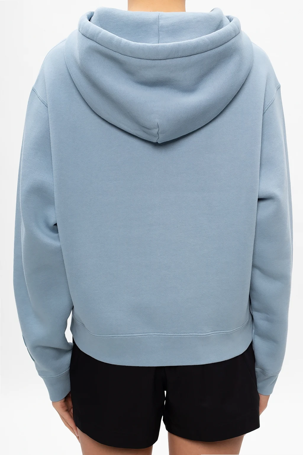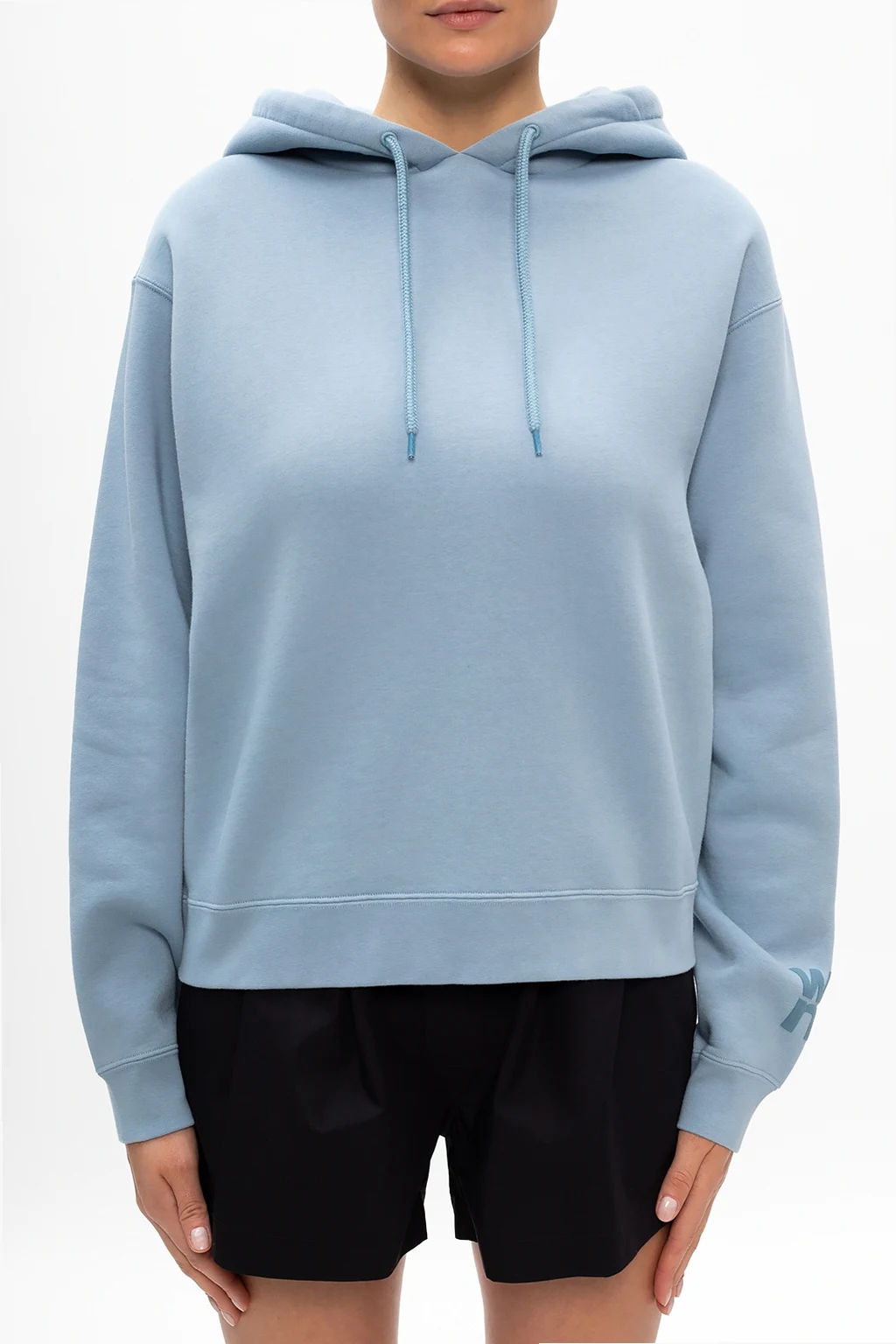 Light blue sweatshirt from T by Alexander Wang featuring a drawstring hood, raised logo detail and ribbed trims.