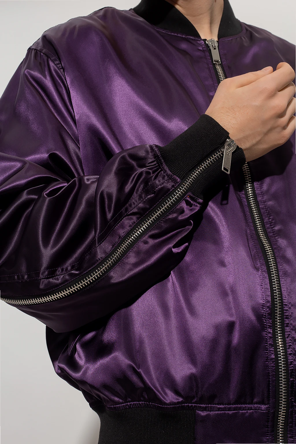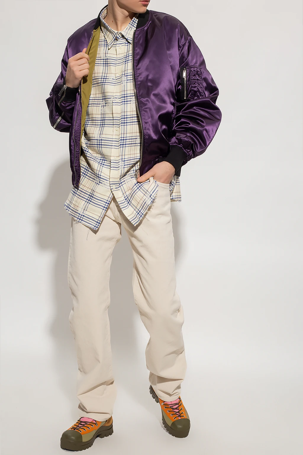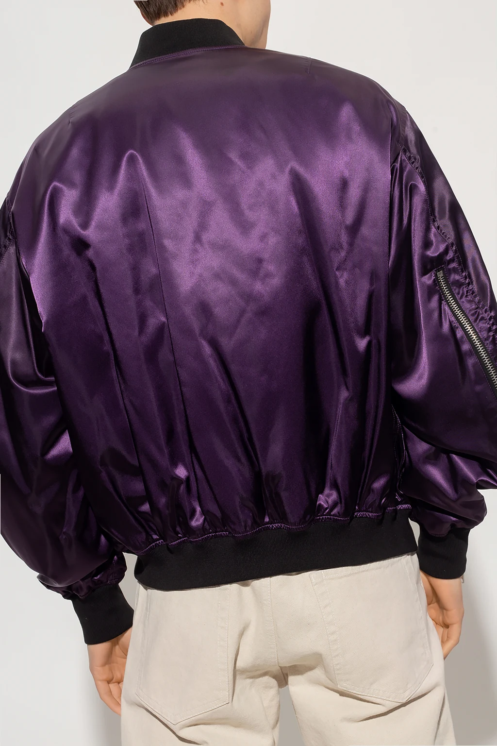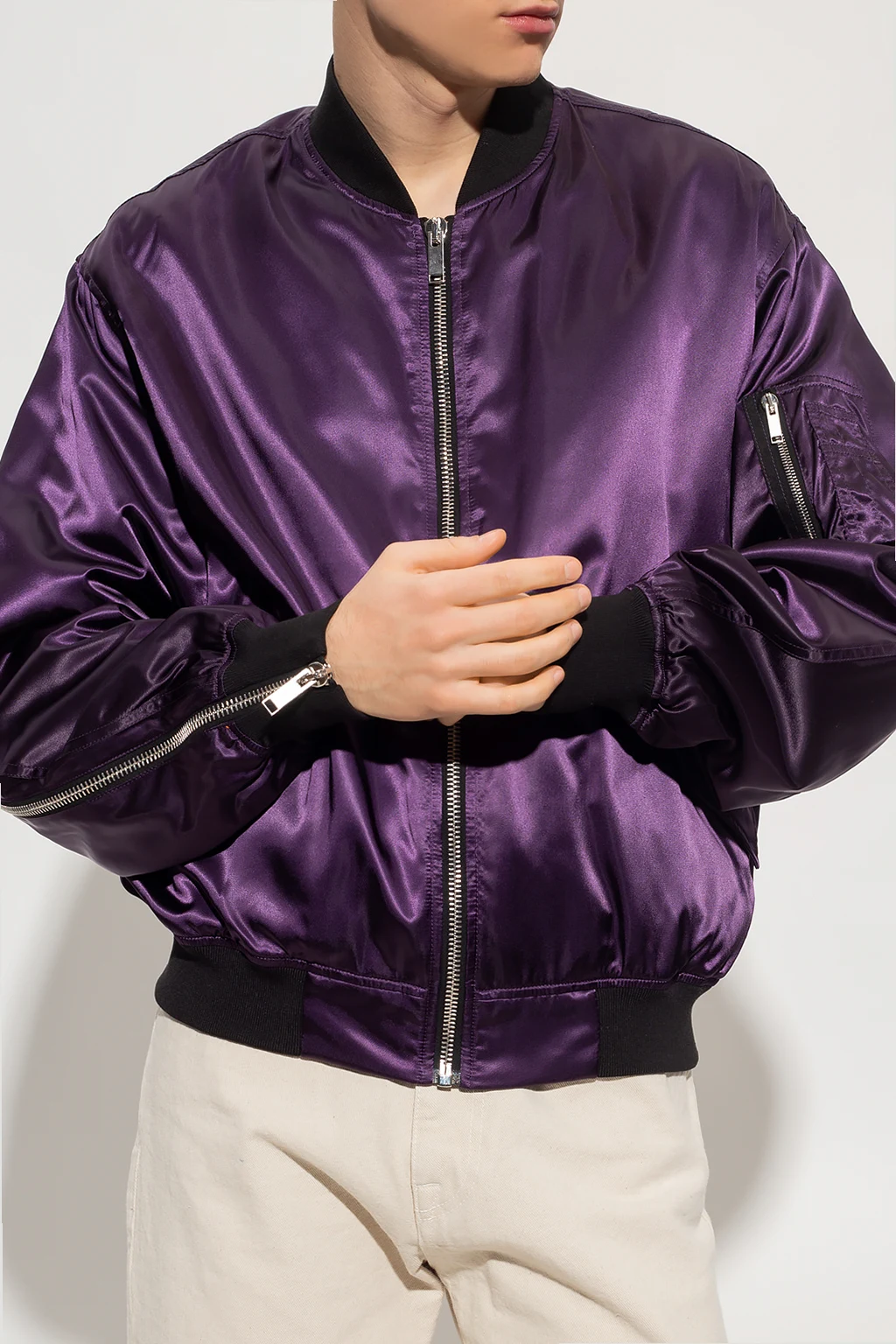 Purple and black bomber jacket from 424. Fastened with a zip, this style features two snap-fastened flapped pockets on the front, one zip pocket and four small slip pockets on the sleeve, a zip vent on one sleeve, a green lining and rib details on the collar, bottom hem and cuffs.