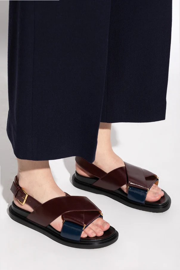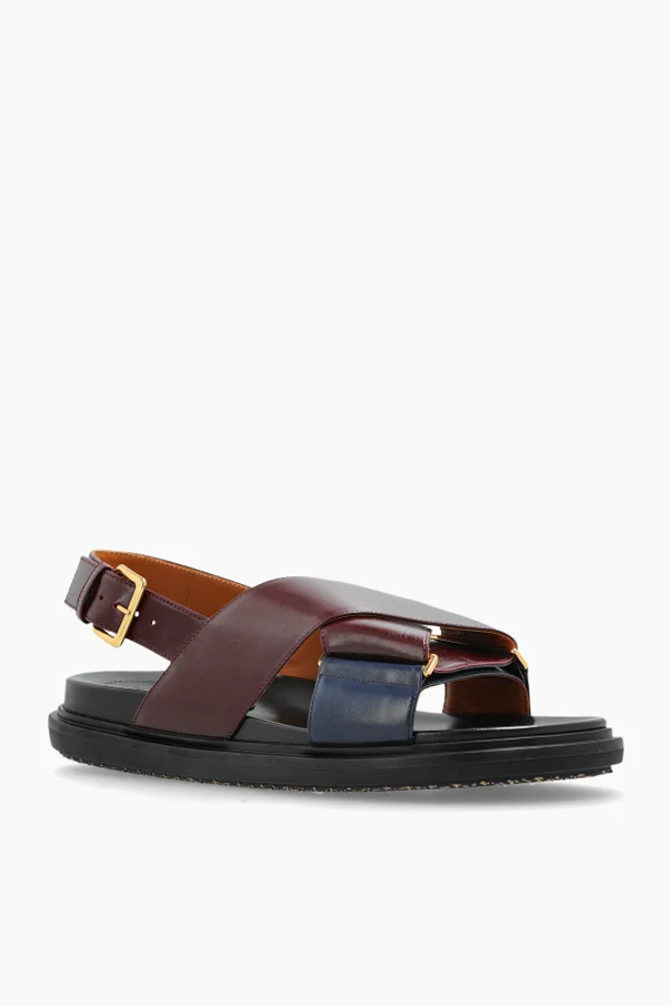 Lederne Sandalen von Marni in der Farbe Bordeaux verkörpern zeitgenössische Eleganz, ausgedrückt durch minimalistische Formen und ein mutiges Farbspiel. Breite, sich kreuzende Riemen aus erstklassigem, glattem Echtleder umschließen den Fuß und garantieren sowohl Komfort als auch außergewöhnliche Stabilität. Die Vorderseite der Sandalen wird durch einen markanten, dunkelblauen Riemen ergänzt, der auf subtile Weise mit dem tiefen Bordeaux-Ton kontrastiert.