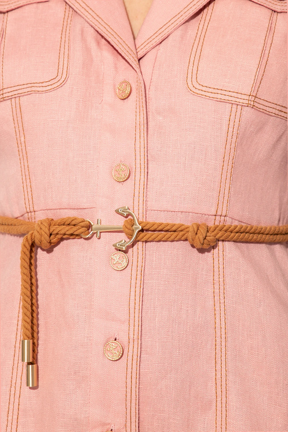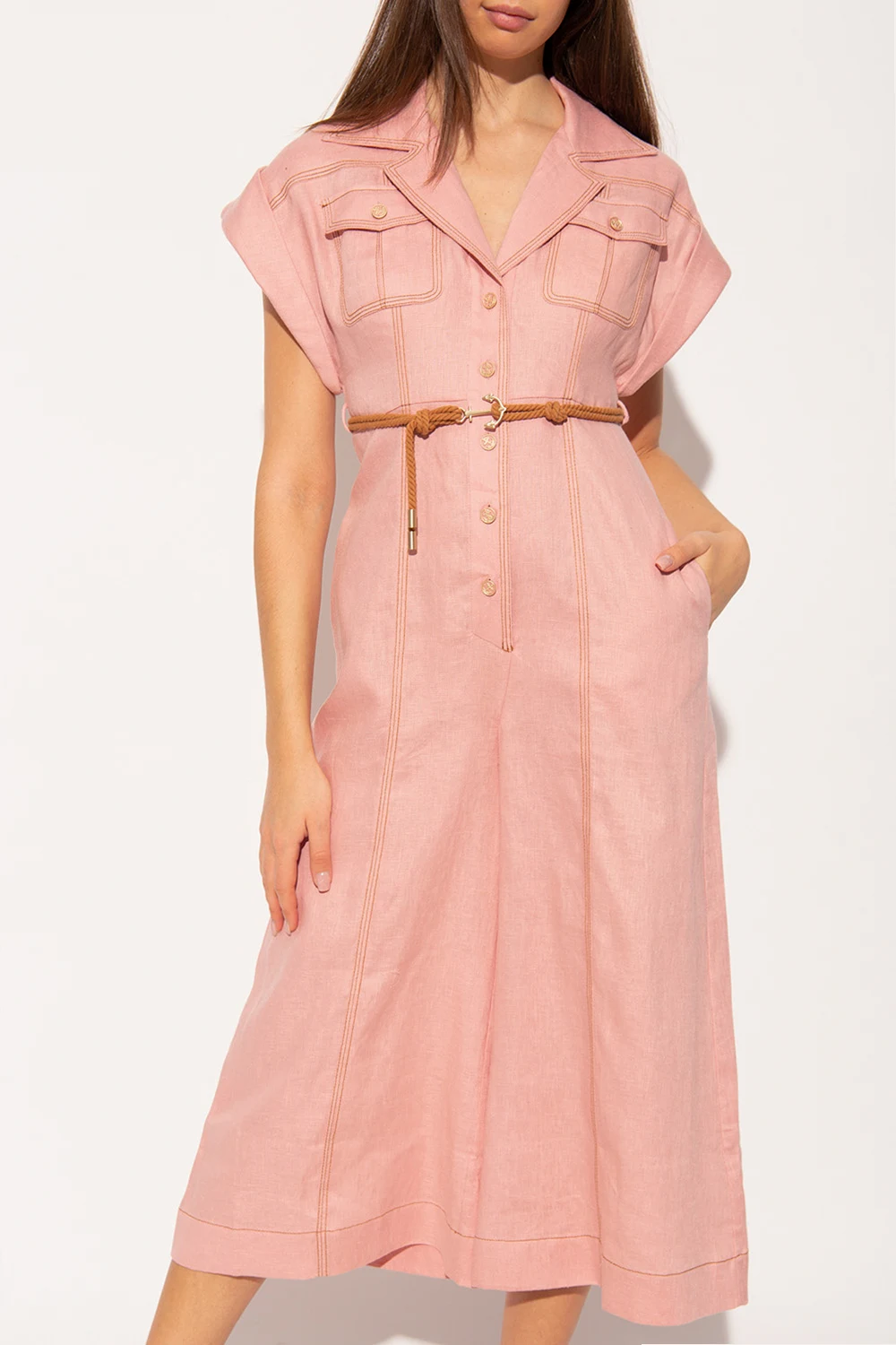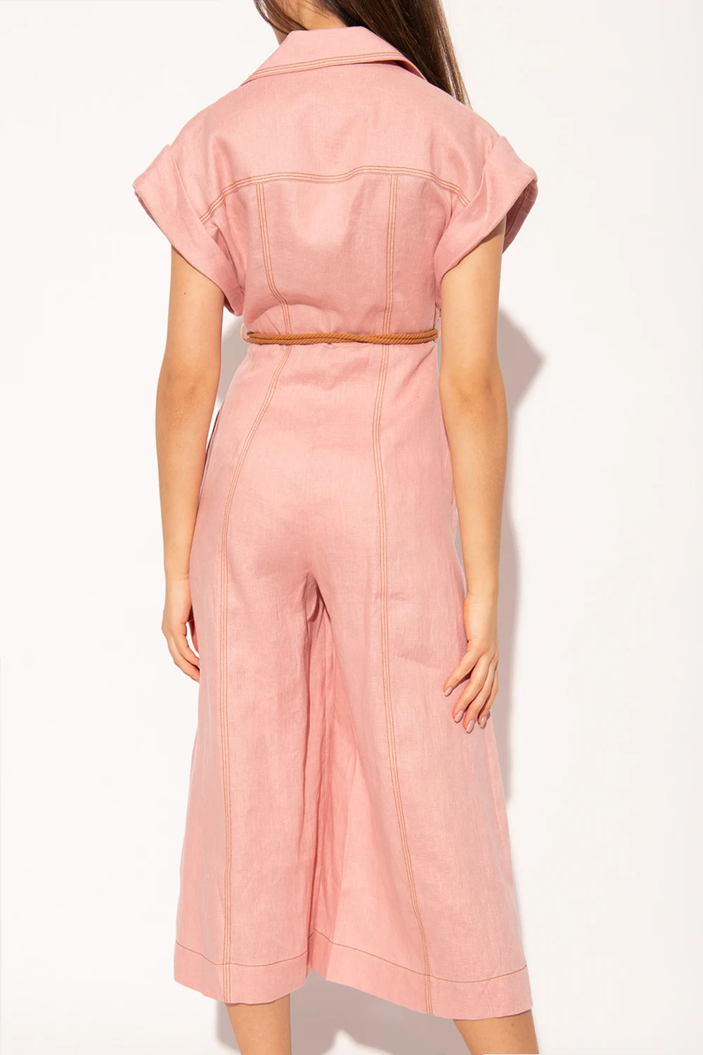 Pink jumpsuit from Zimmermann. Made of linen with wide legs, this style features decorative buttons, two flapped pockets, brown thread trims and a waist-cinching rope belt with an anchor fastener.
