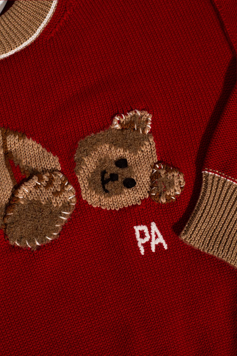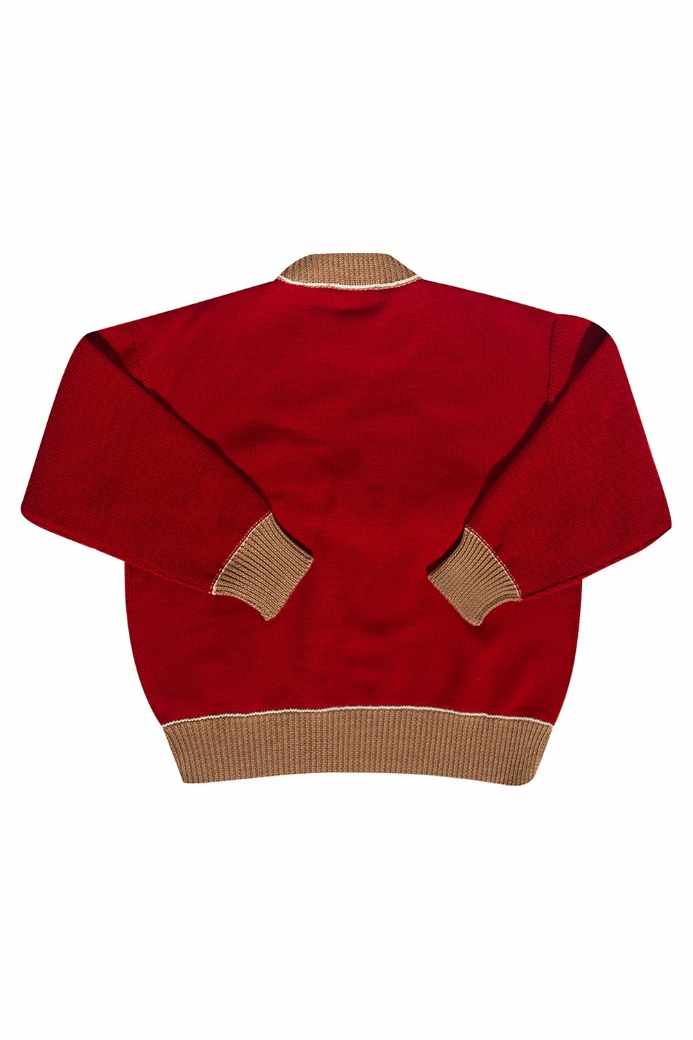 Red, brown and white crewneck sweater from Palm Angels Kids. Crafted from wool, this style showcases an embroidered logo pattern and ribbed trims on the edges.