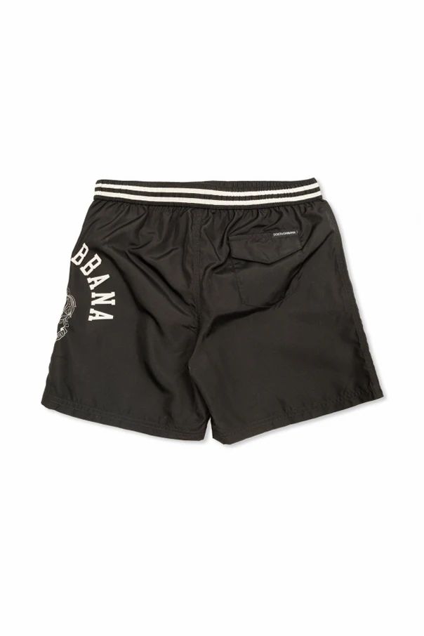 Bade-Shorts mit Logo sind ein erlesenes Angebot der Marke Dolce & Gabbana Kids, das sich an junge Stilkenner richtet. Das Modell ist in einem tiefen, schwarzen Farbton gehalten, dessen klassische Eleganz durch kontrastierende, weiße Details hervorgehoben wird. Die Shorts begeistern mit einem schlichten, regulären Schnitt , der Bewegungsfreiheit garantiert, während das leichte, schnell trocknende Synthetikgewebe sie besonders praktisch für Aktivitäten im Wasser macht.
