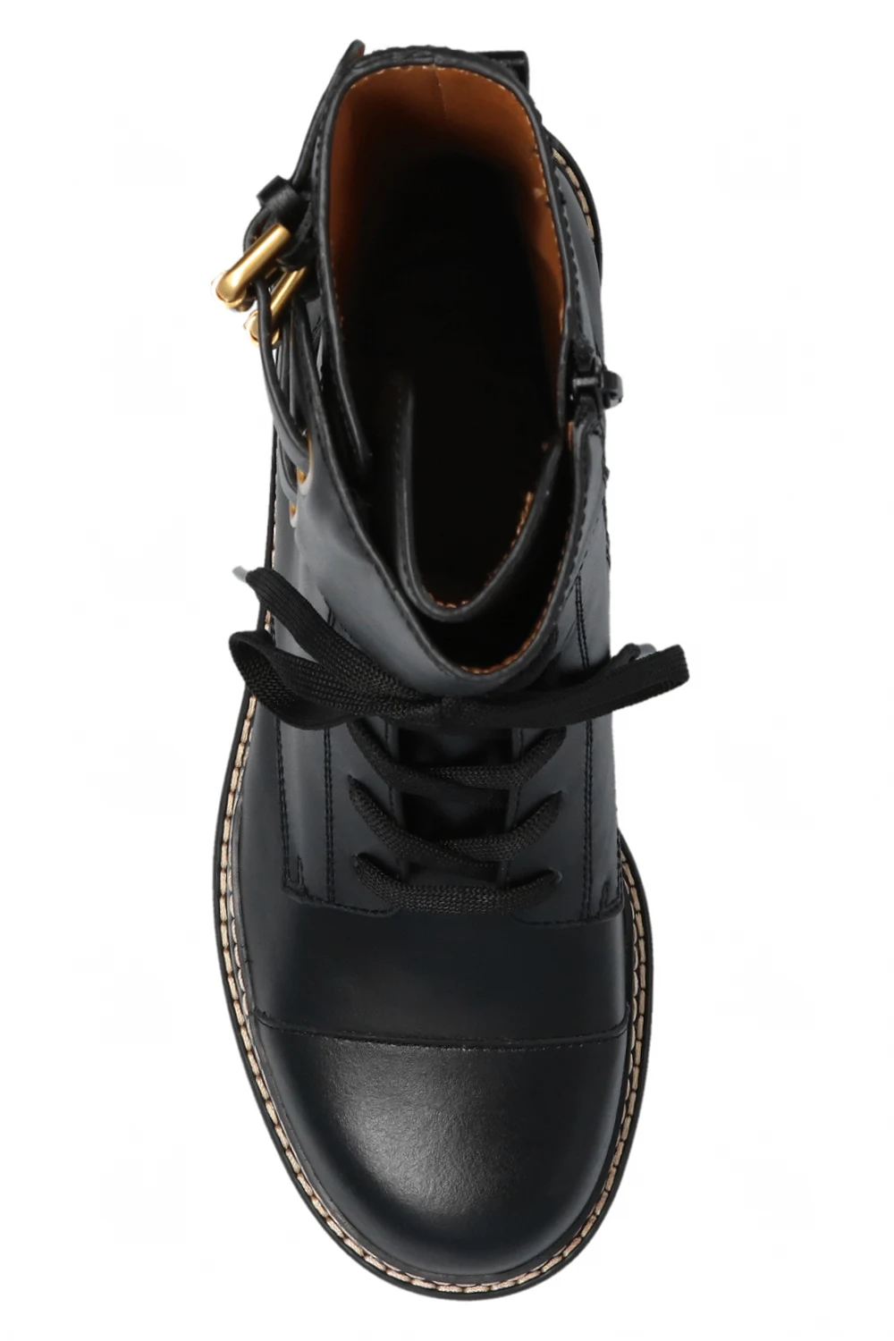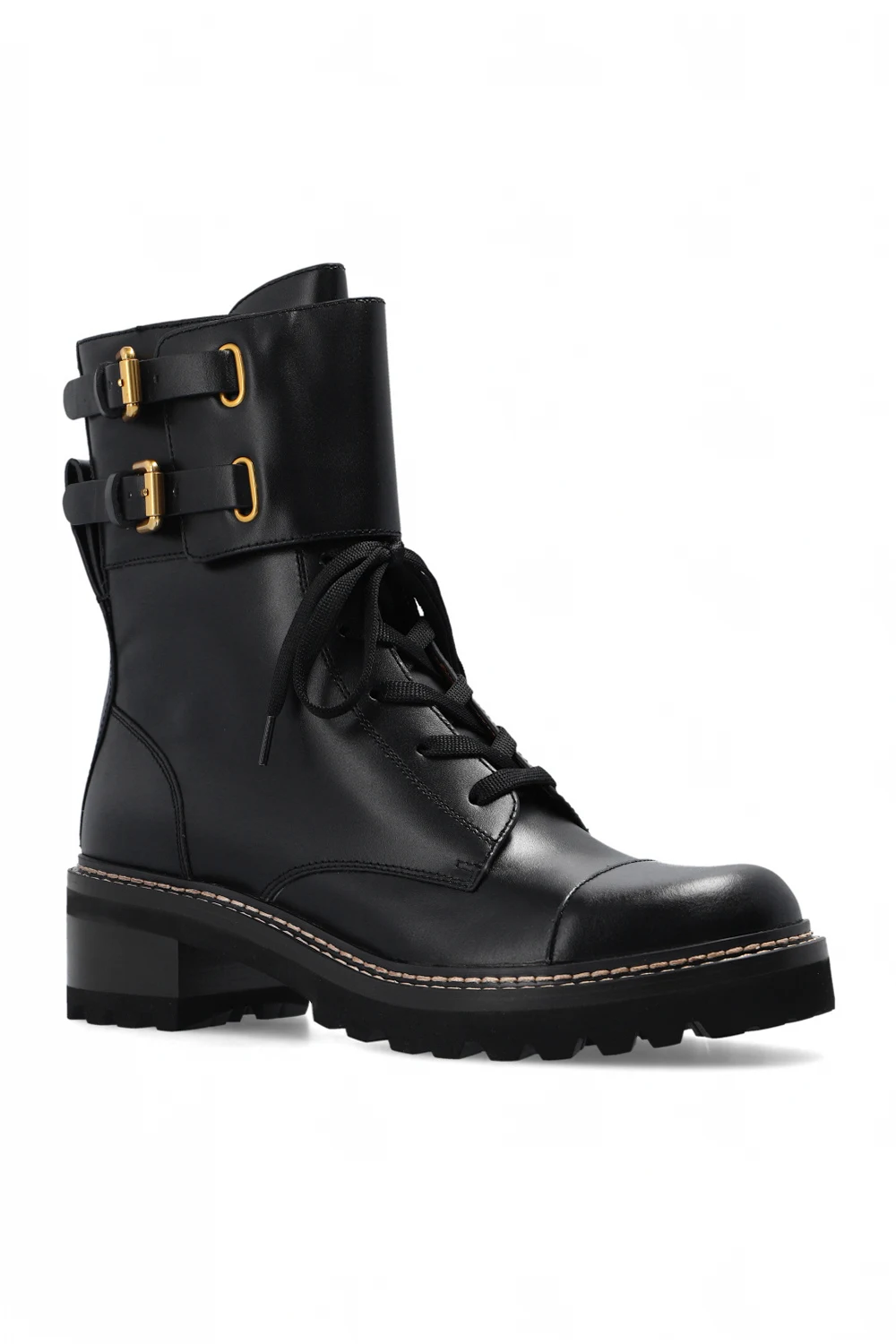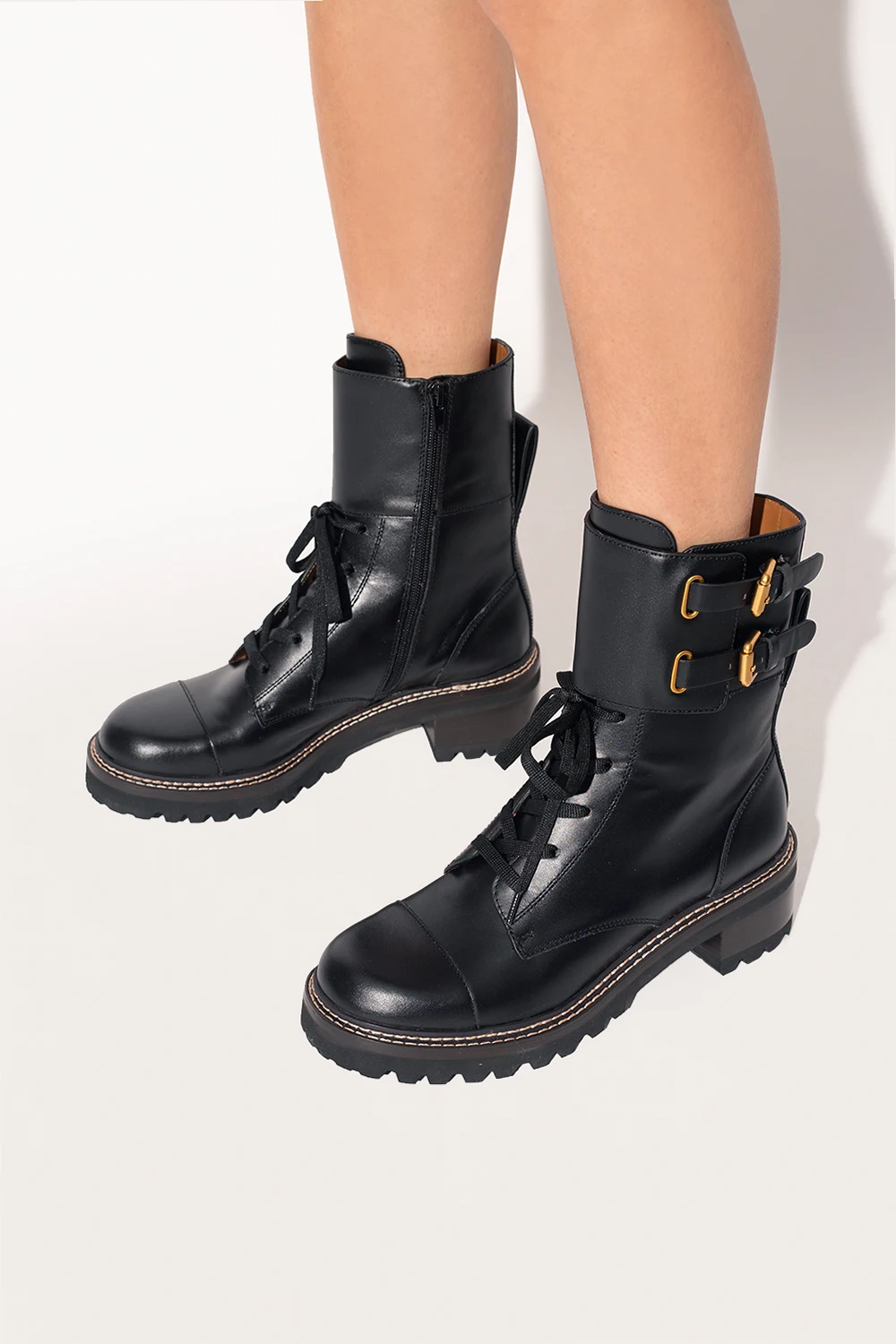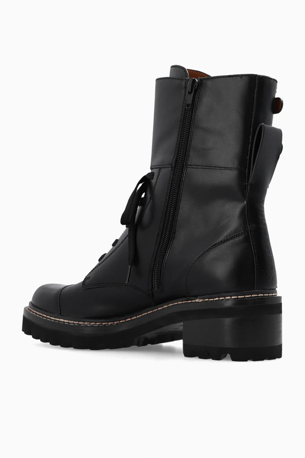 Black ‘Mallory’ heeled ankle boots from See By Chloé. Made of calf leather, this lace-up model sits on a dark brown and black rubber sole and features a zip closure and buckle straps on the sides.