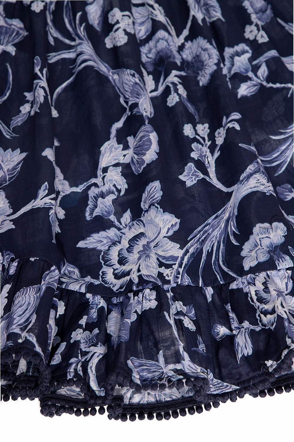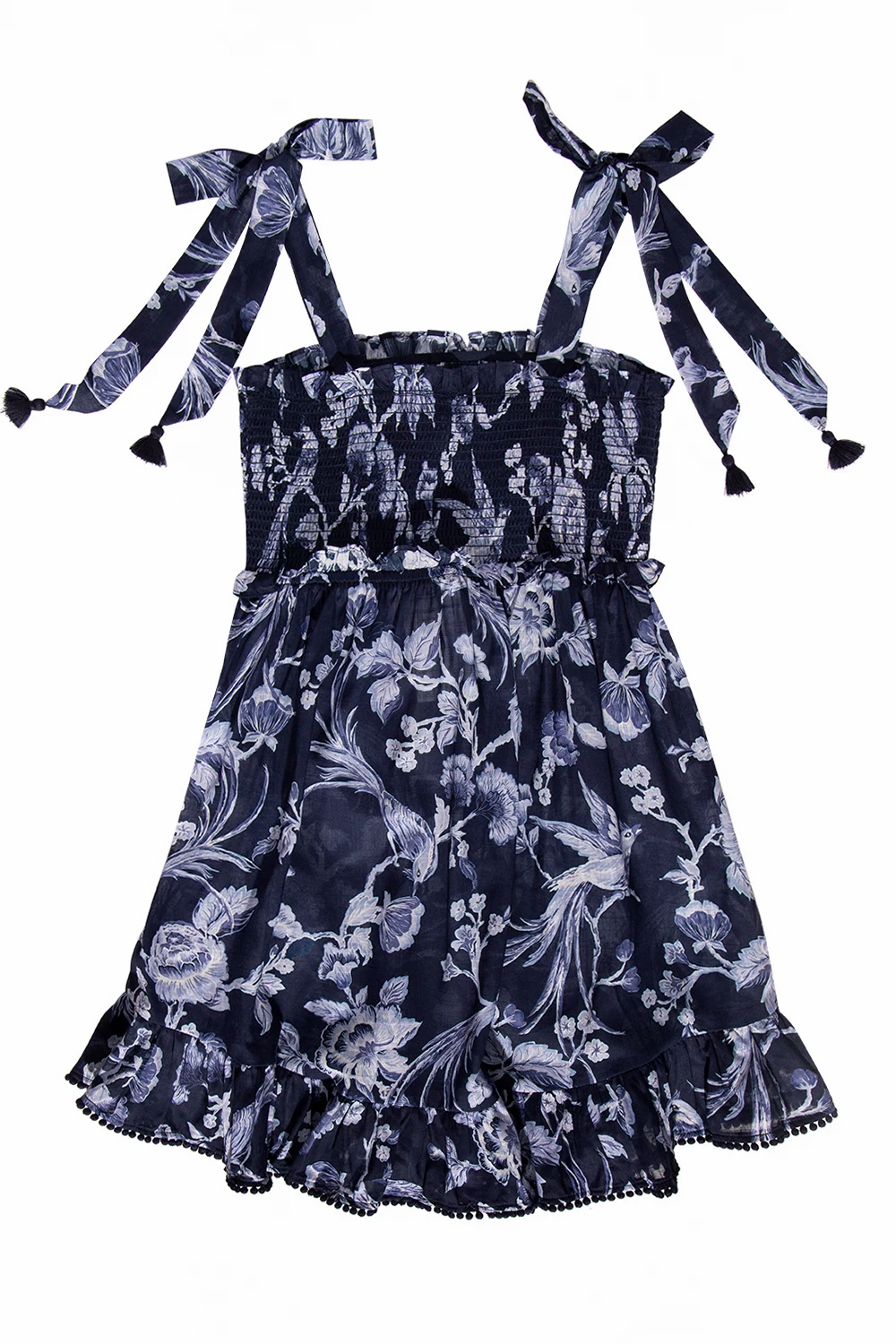 Navy blue dress from Zimmermann Kids. Crafted from cotton and illustrated with a floral motif, this style features an elasticated trim and shoulder straps with distinctive bows.