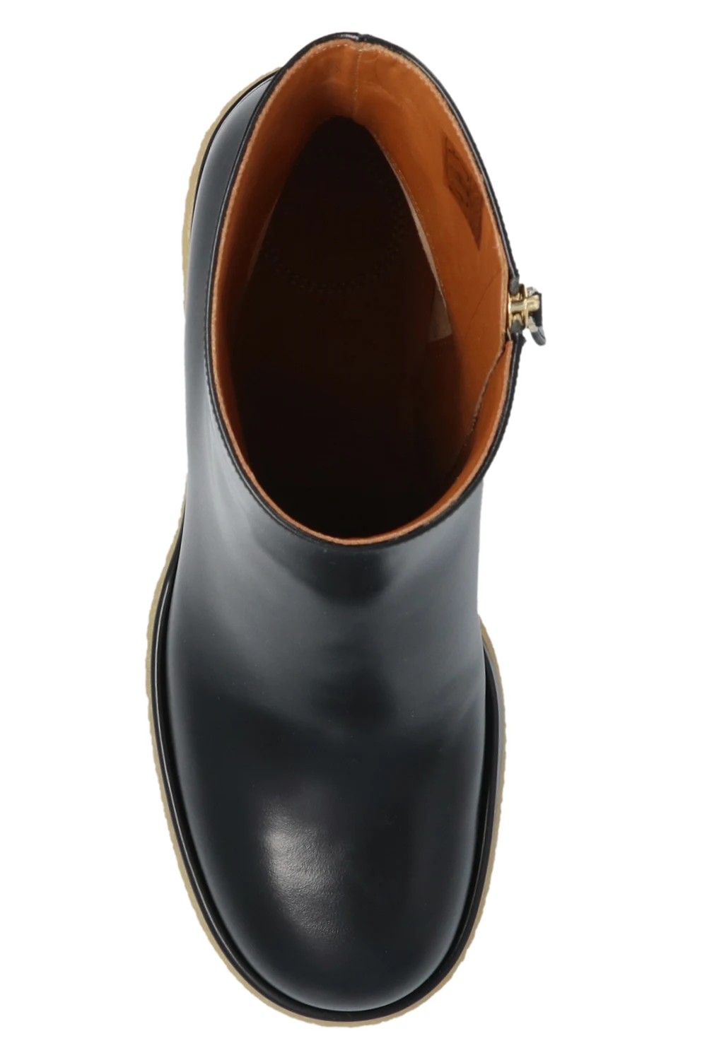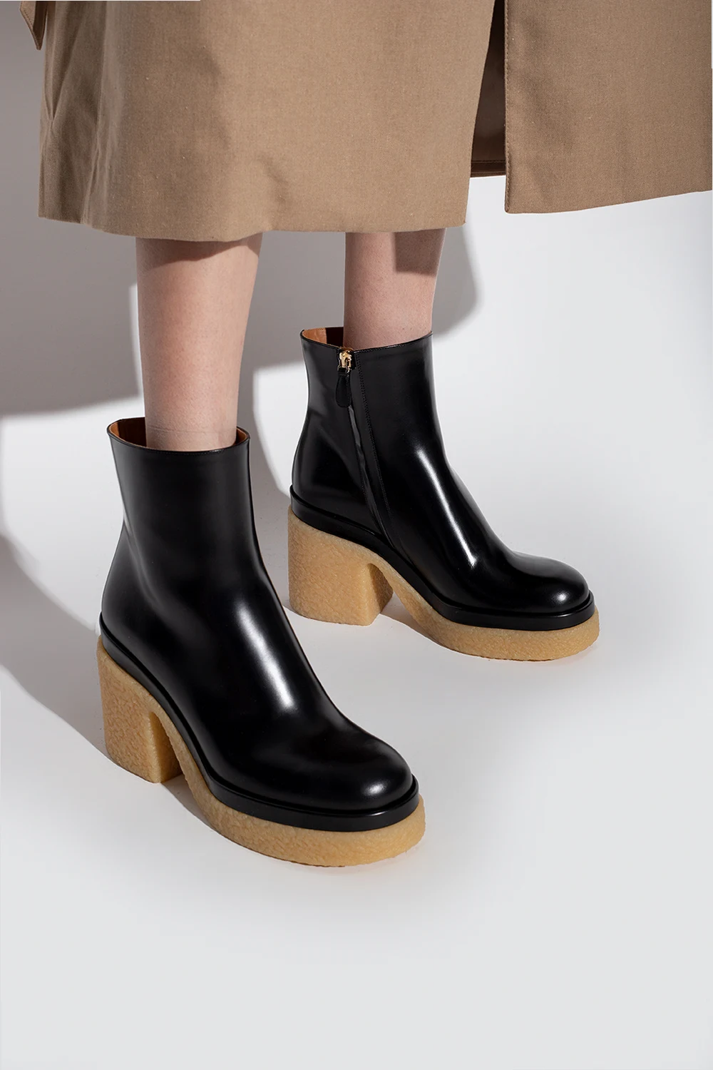 Black ‘Kurtys’ heeled ankle boots from Chloé. Made of calf leather, this pair features a side zip and beige rubber sole.