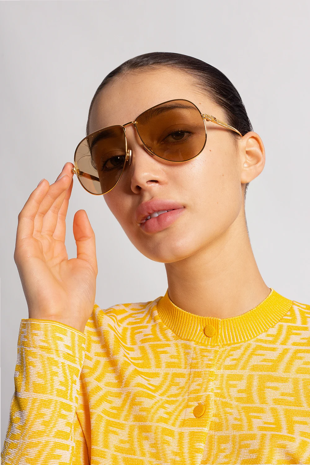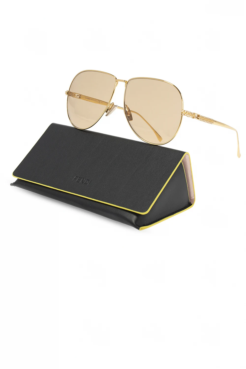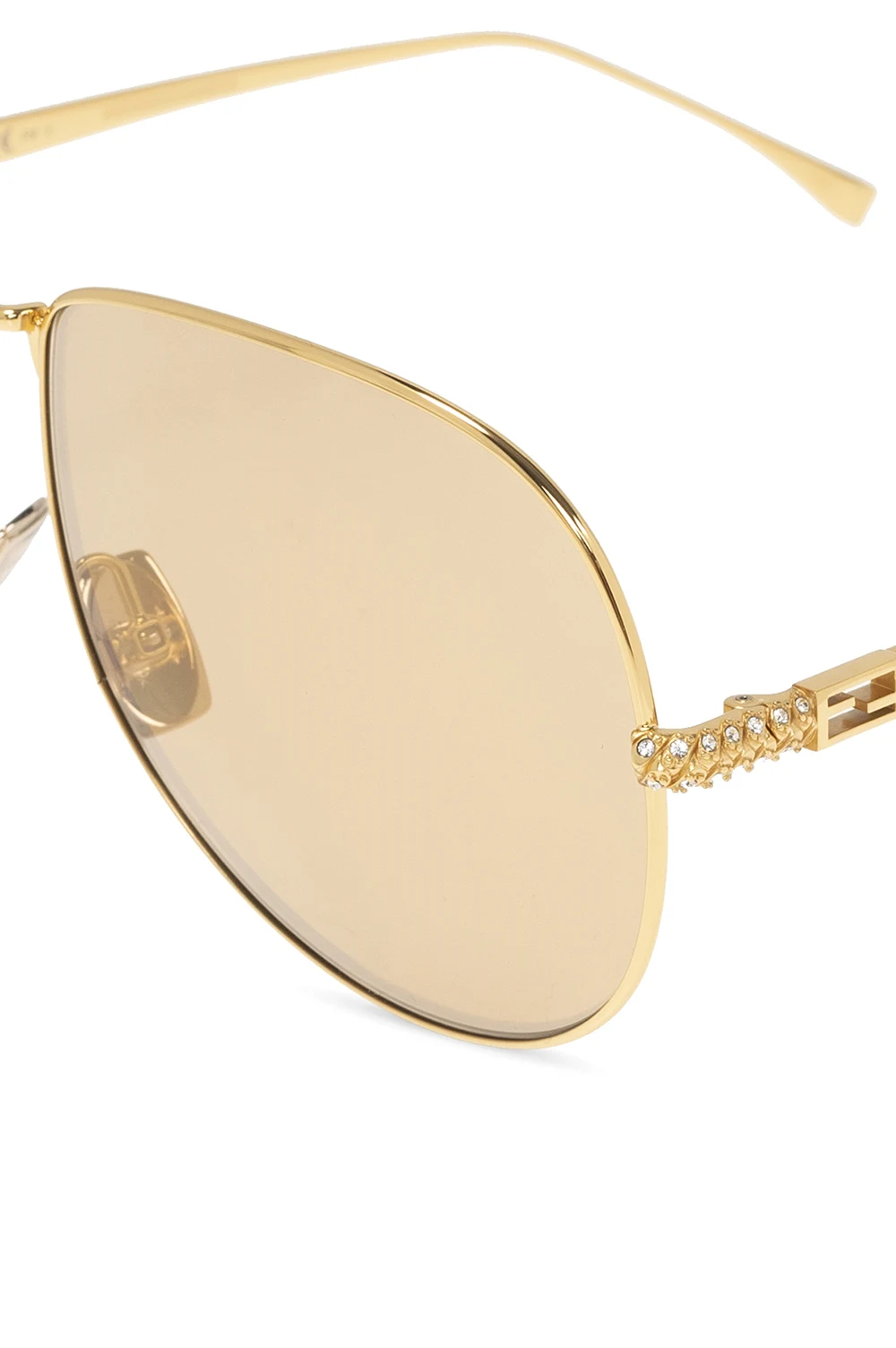 Gold-tone sunglasses from Fendi. Emblazoned with Swarovski crystals and a logo plaque, this pair comes with a black and yellow protective case and features certified brown lenses with 100% UVA/UVB protection.