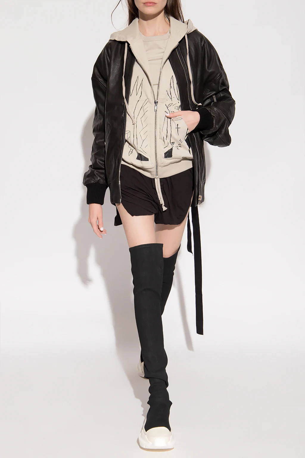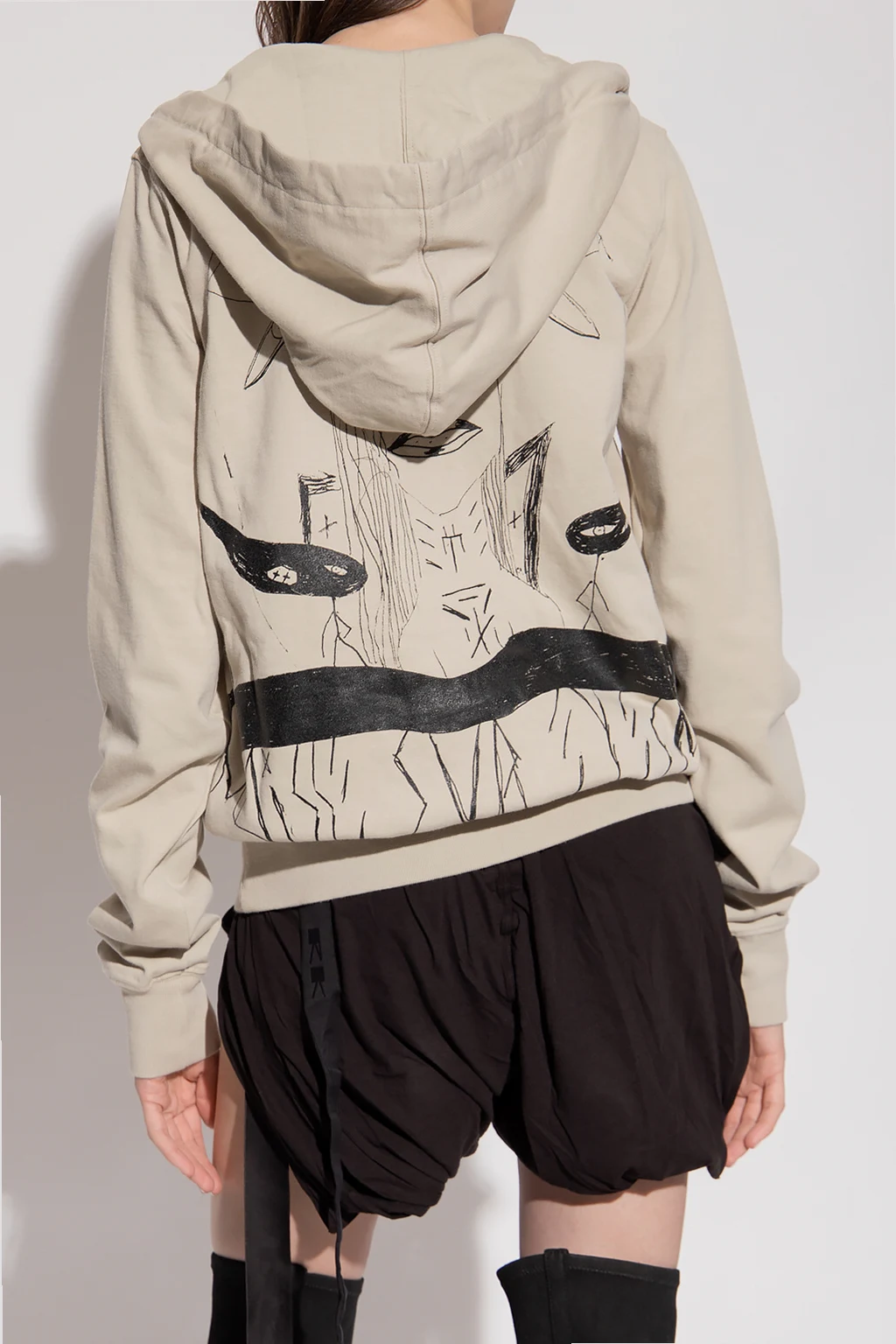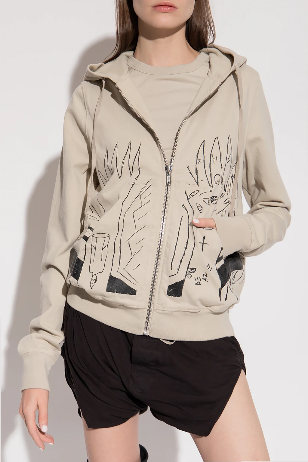 Light grey hoodie from Rick Owens DRKSHDW. Made of cotton. Fastened with a zip, this garment is complete with a drawstring hood, black print, two front pockets and ribbed edges.