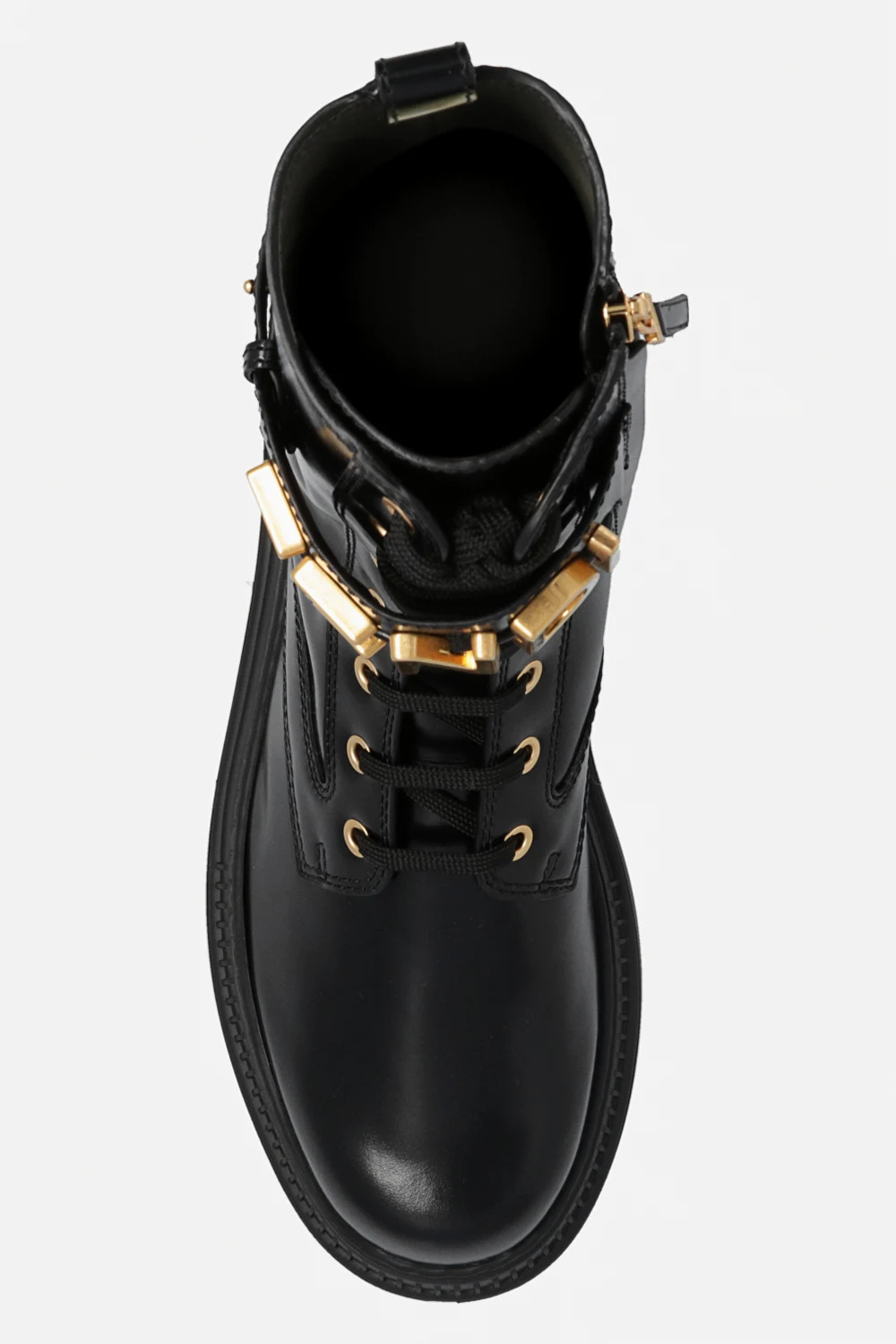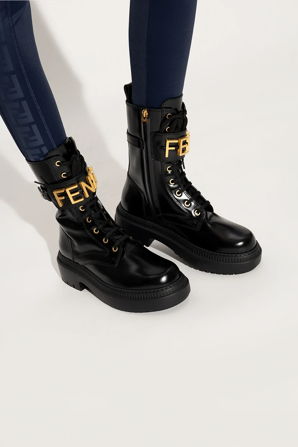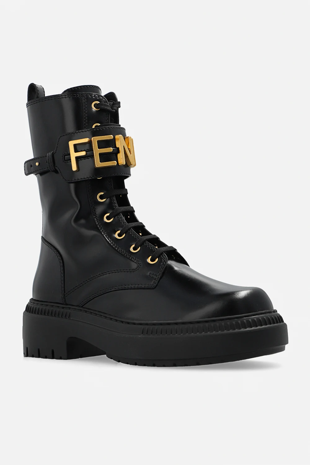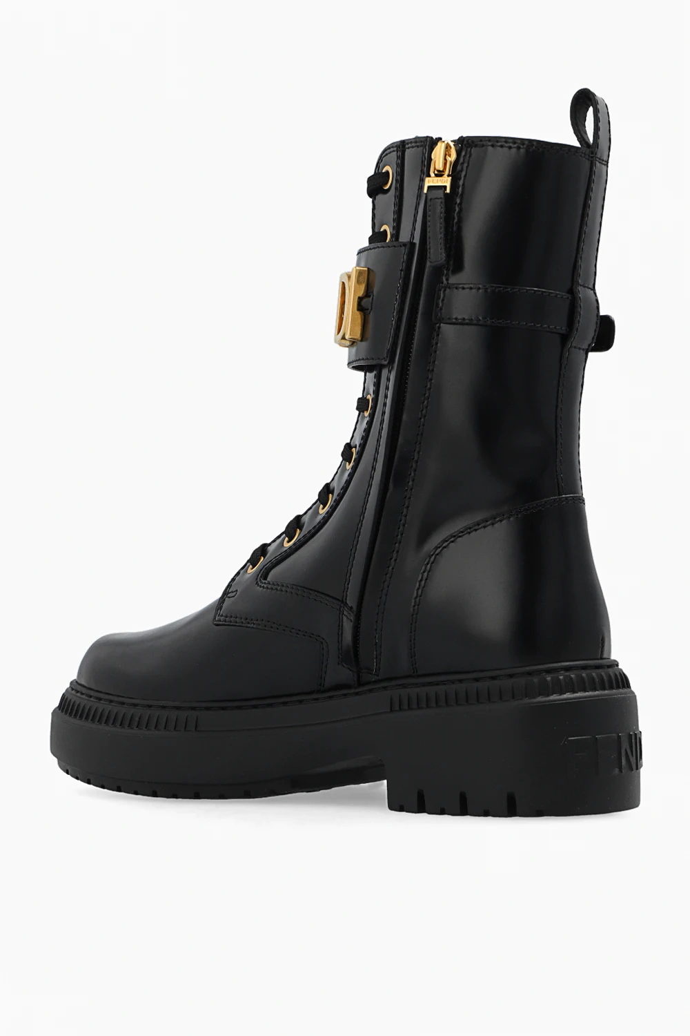 Black ‘Fendigraphy’ ankle boots from Fendi. Made of patent calf leather, this lace-up pair features a side zip, adjustable shoulder strap with a logo appliqué, gold-tone metal hardware and black rubber sole.