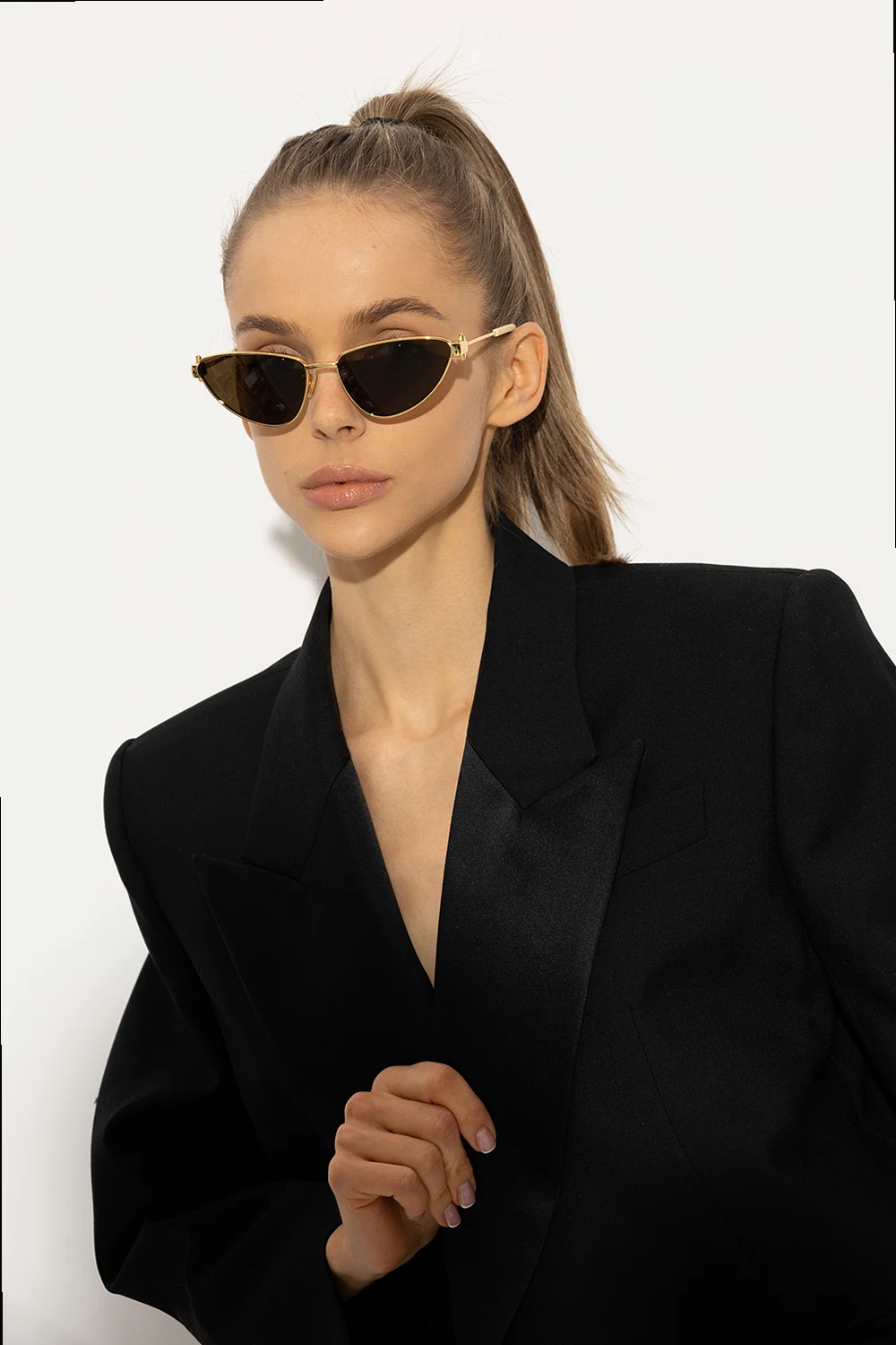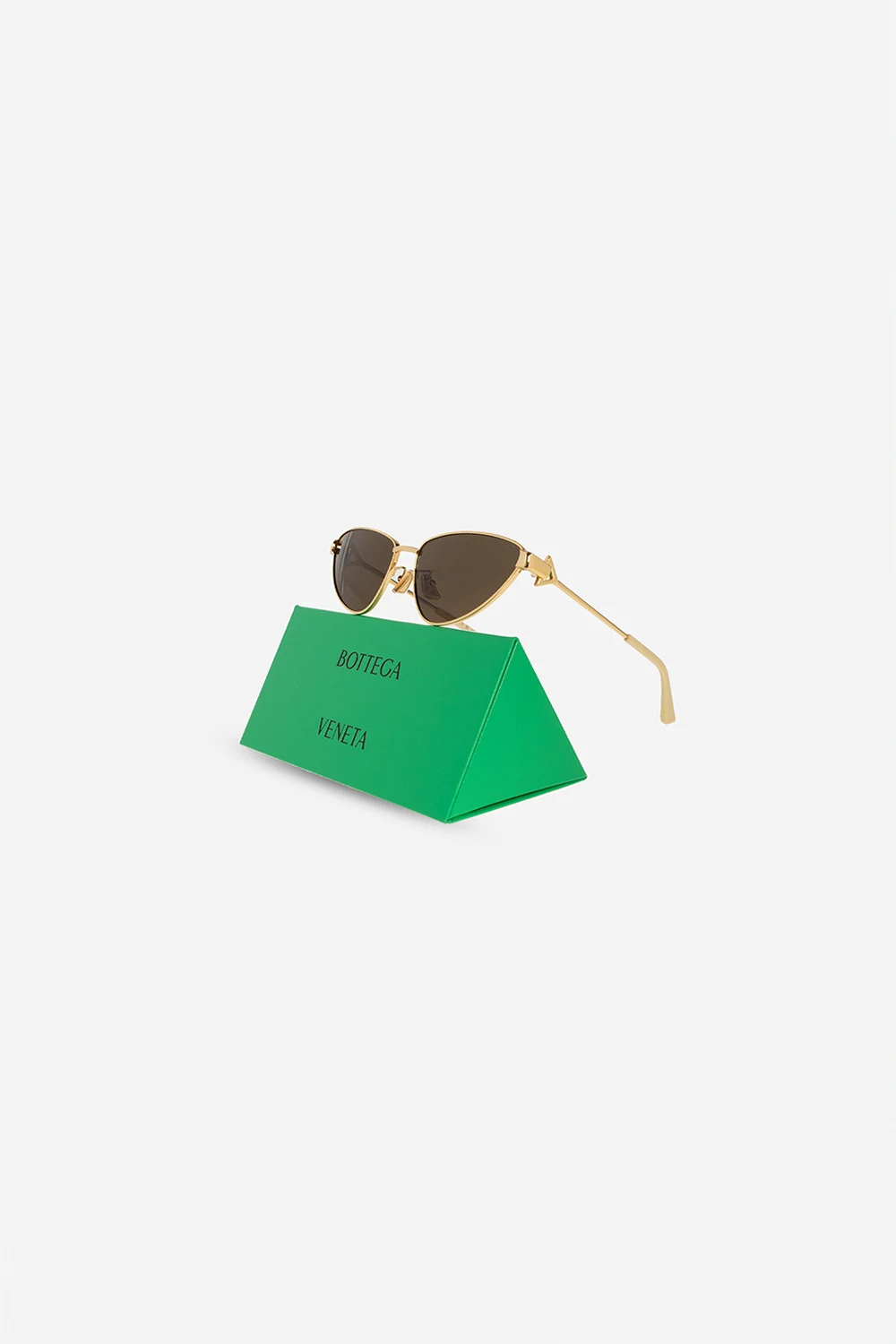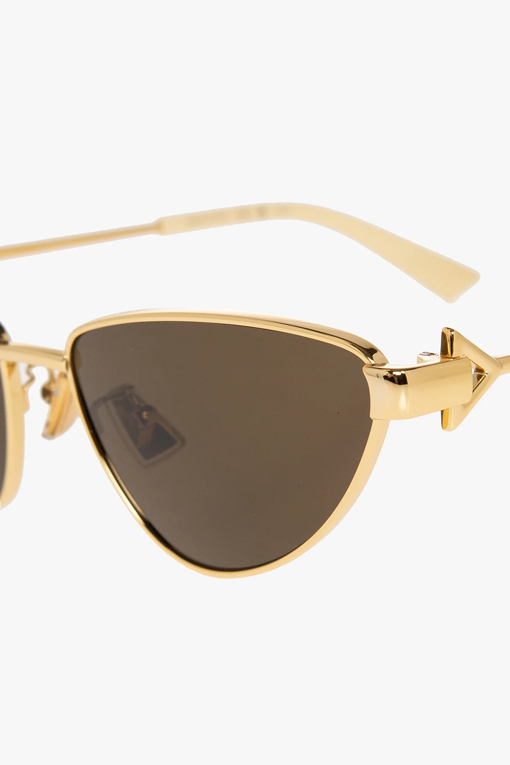 Gold-tone sunglasses from Bottega Veneta. This pair has thin metal triangle frames, single bridge with adjustable nose pads and gold-tone appliqués, temples with triangle hinges and yellow matte tips as well as brown lenses with 100% UV protection. Comes with a case.