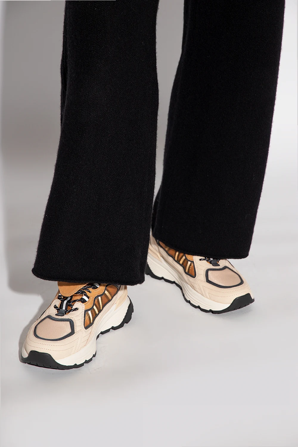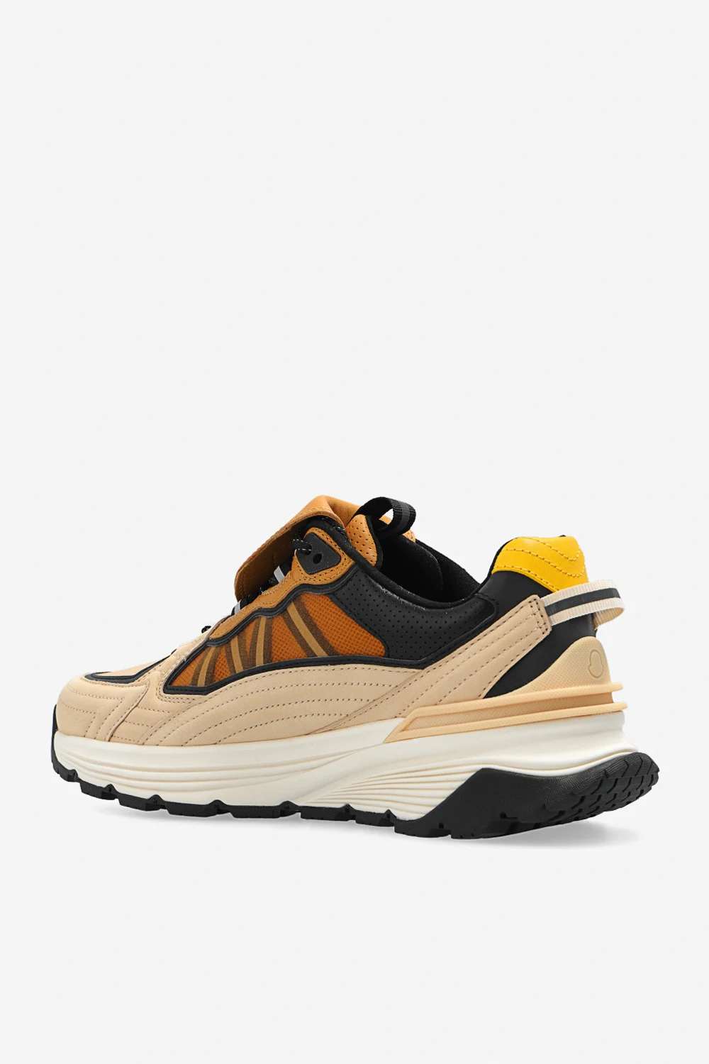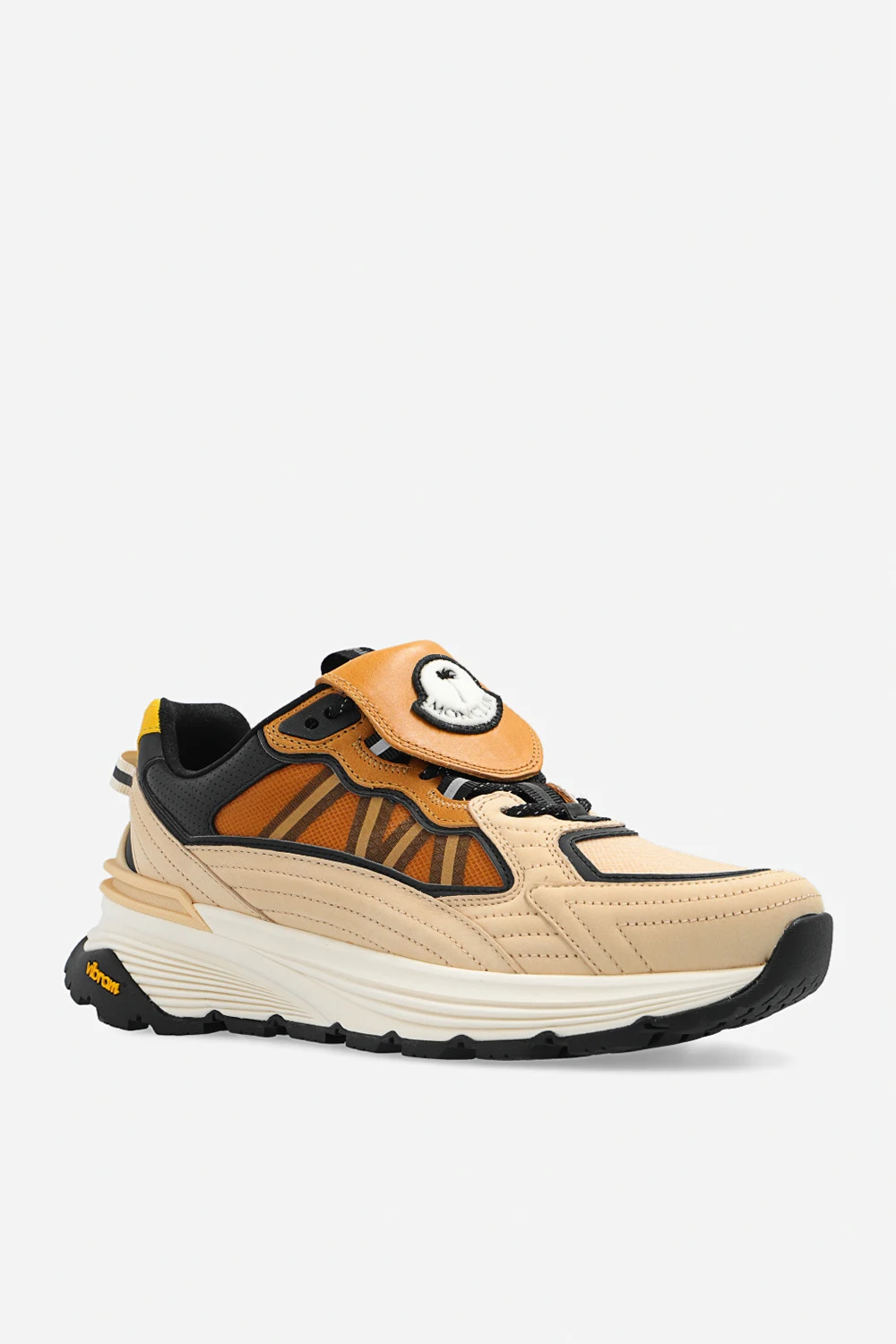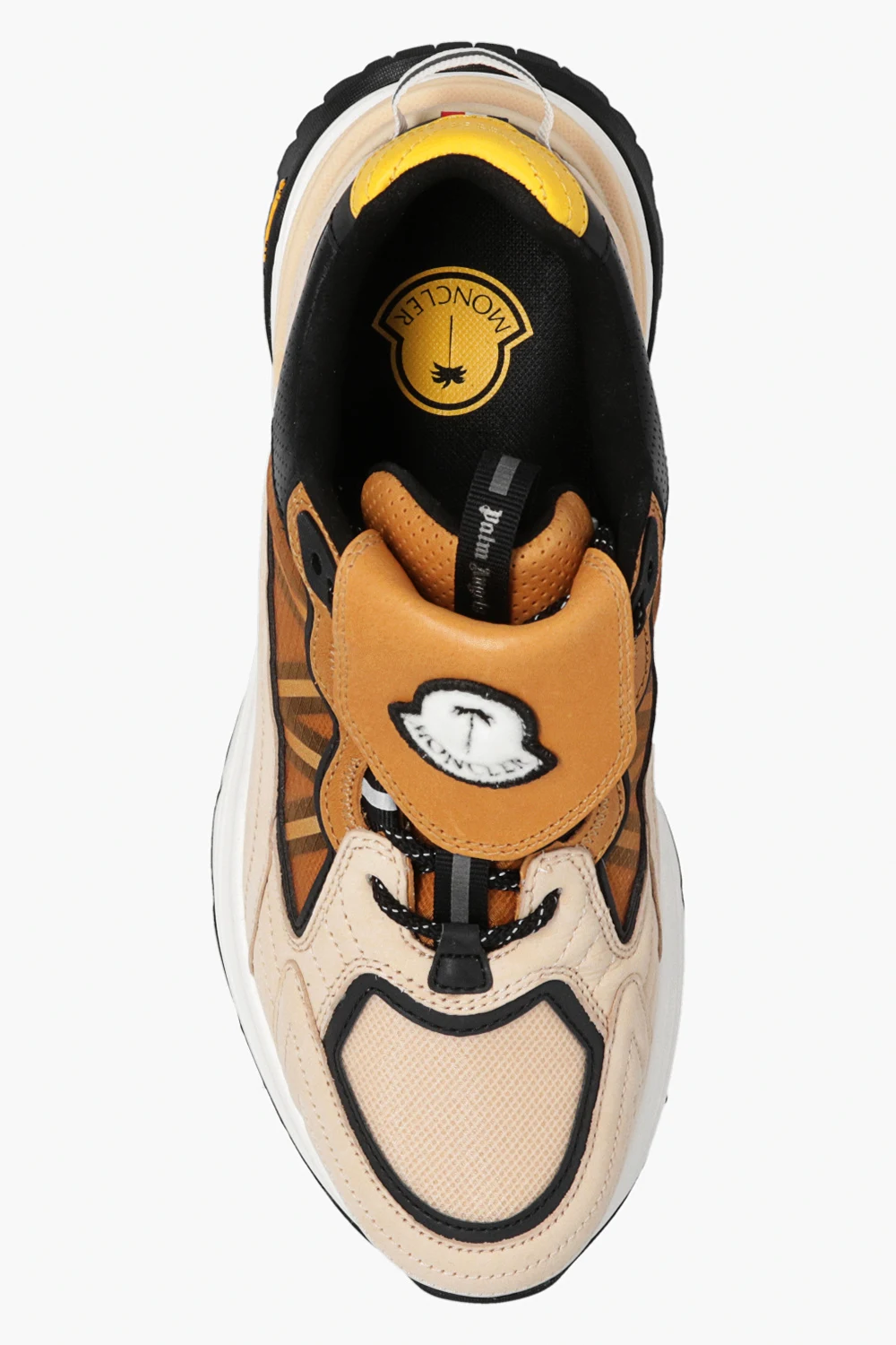 Beige, brown and black ‘Palm Lite Runner’ sneakers from Moncler Genius, the ‘8 Moncler Palm Angels’ collection. Made of fabric and leather, this lace-up pair features a detachable tongue with a logo patch and black Vibram® rubber sole.
